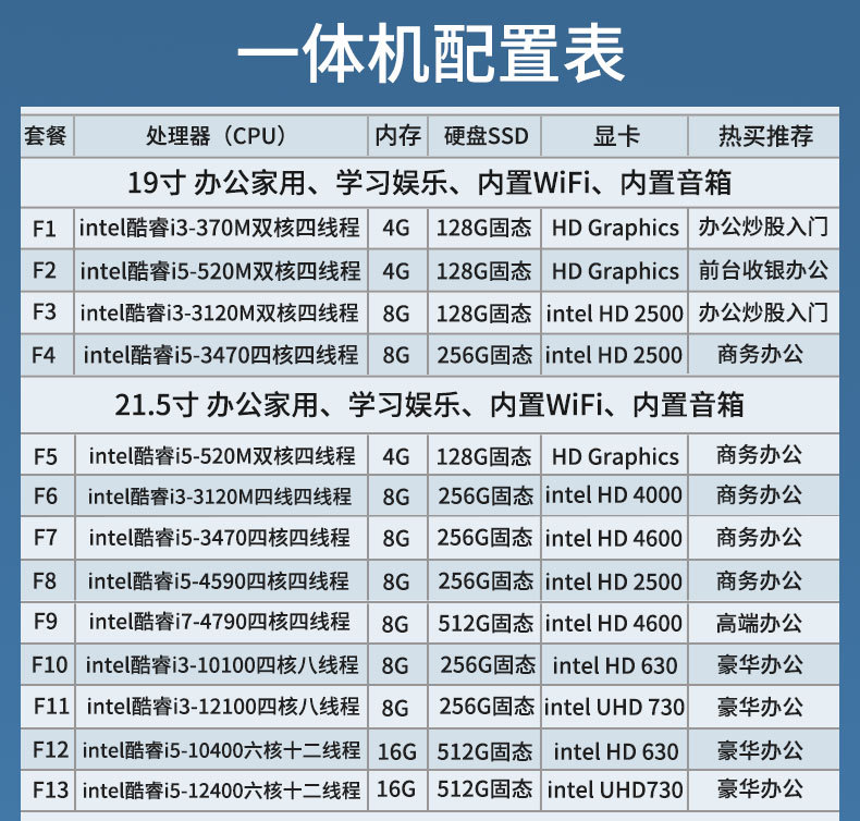 - F3套餐-19寸平面i3-3120M双核四线程/8G/128G