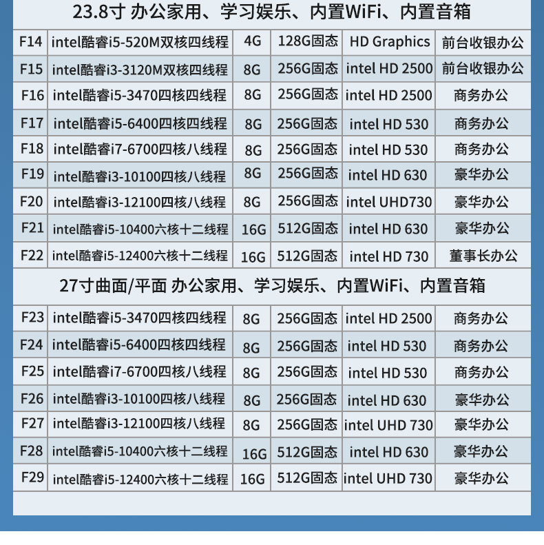 - F15套餐-23.8寸平面i3-3120M双核四线程/8G/256G