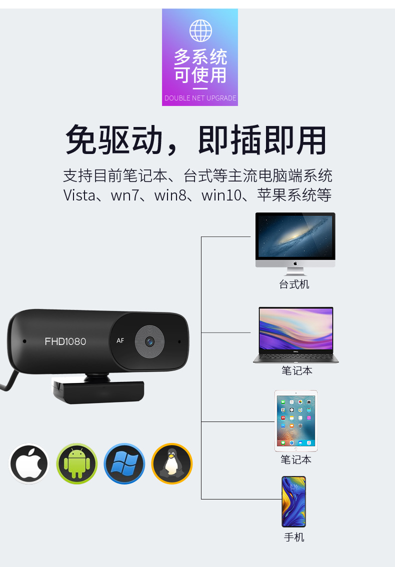 电脑摄像头USB摄像头直播摄像头会议网课直播摄像头免驱高清1080P