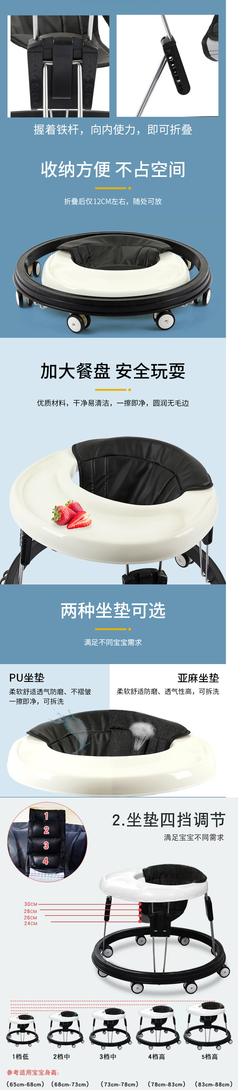- 亚麻蓝/餐盘/一键折叠/静音万向轮-四档/坐垫调节【车身不可调】最高38cm