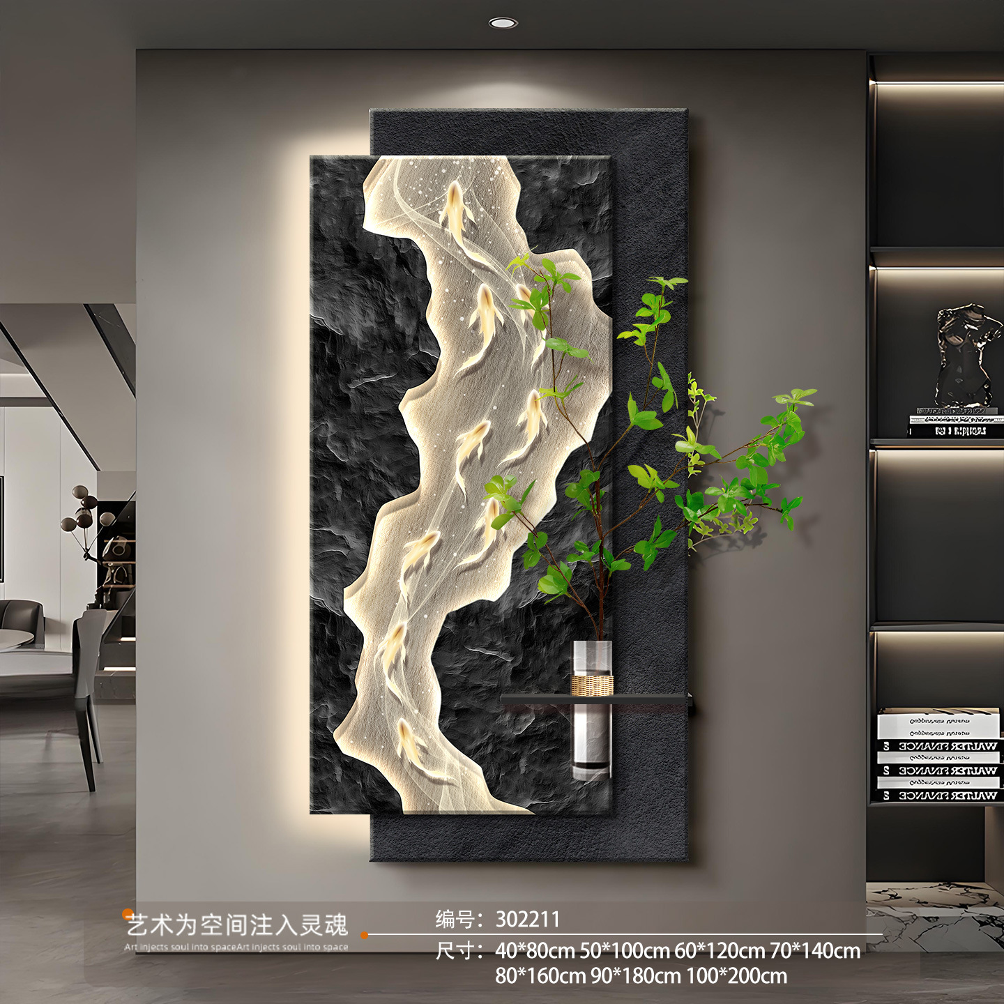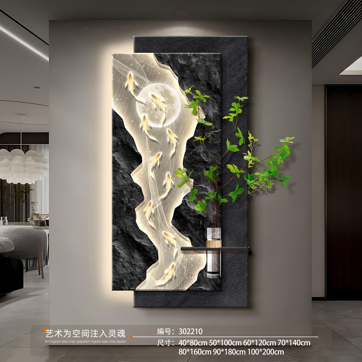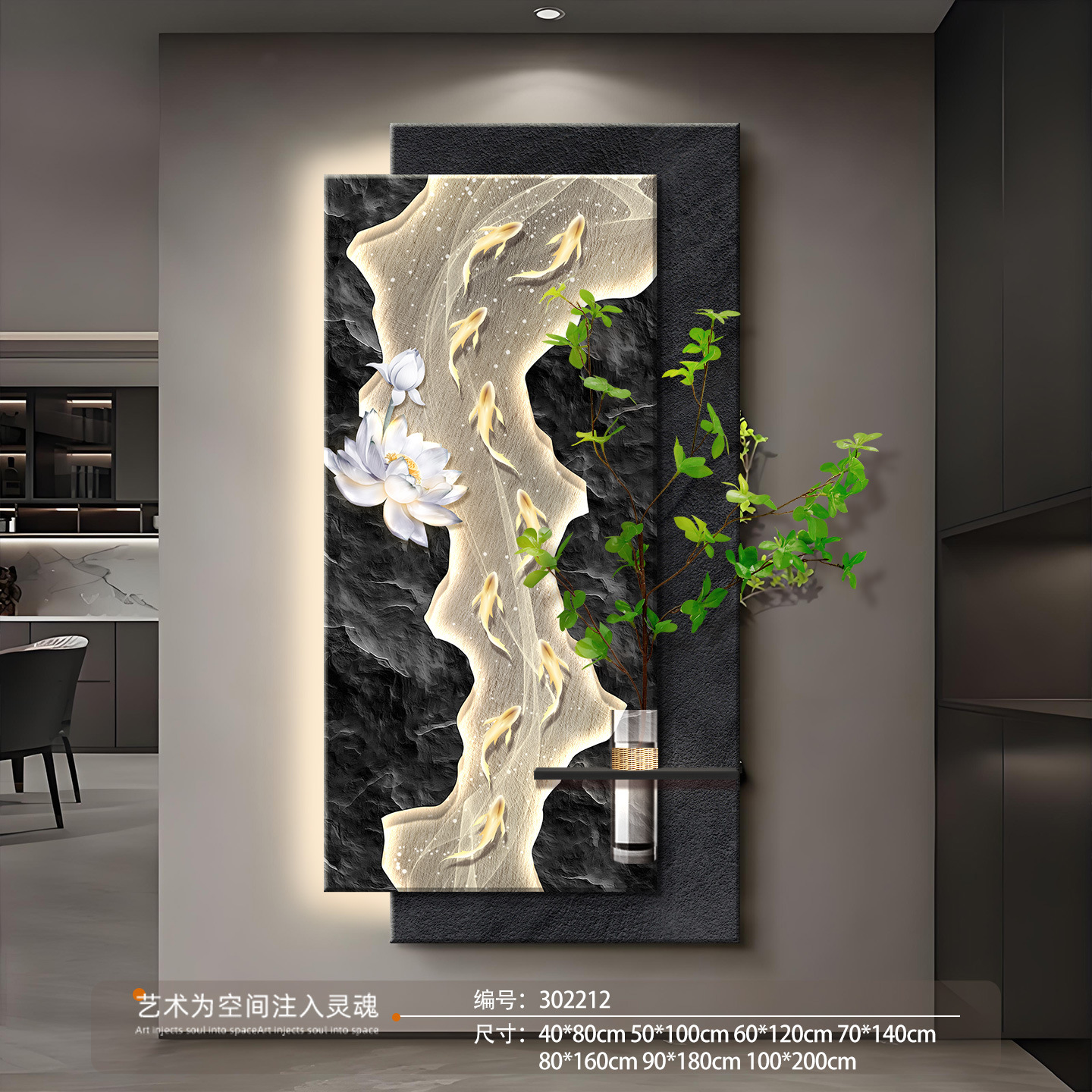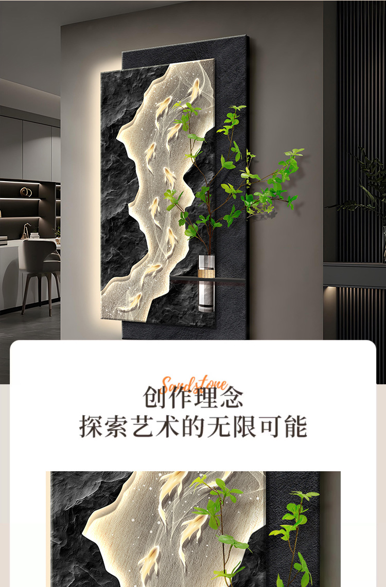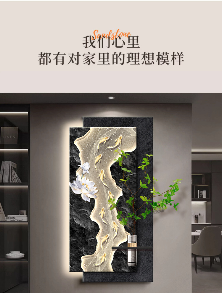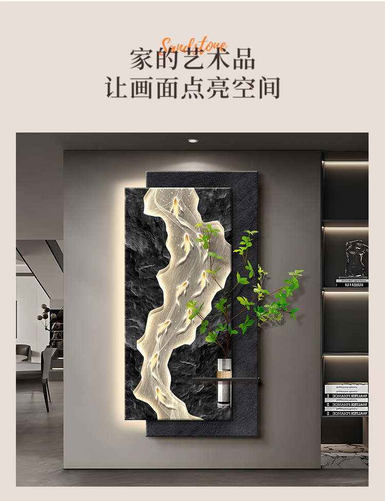 水培绿植玄关装饰画九鱼图走廊带灯立体挂画竖版发光灯画