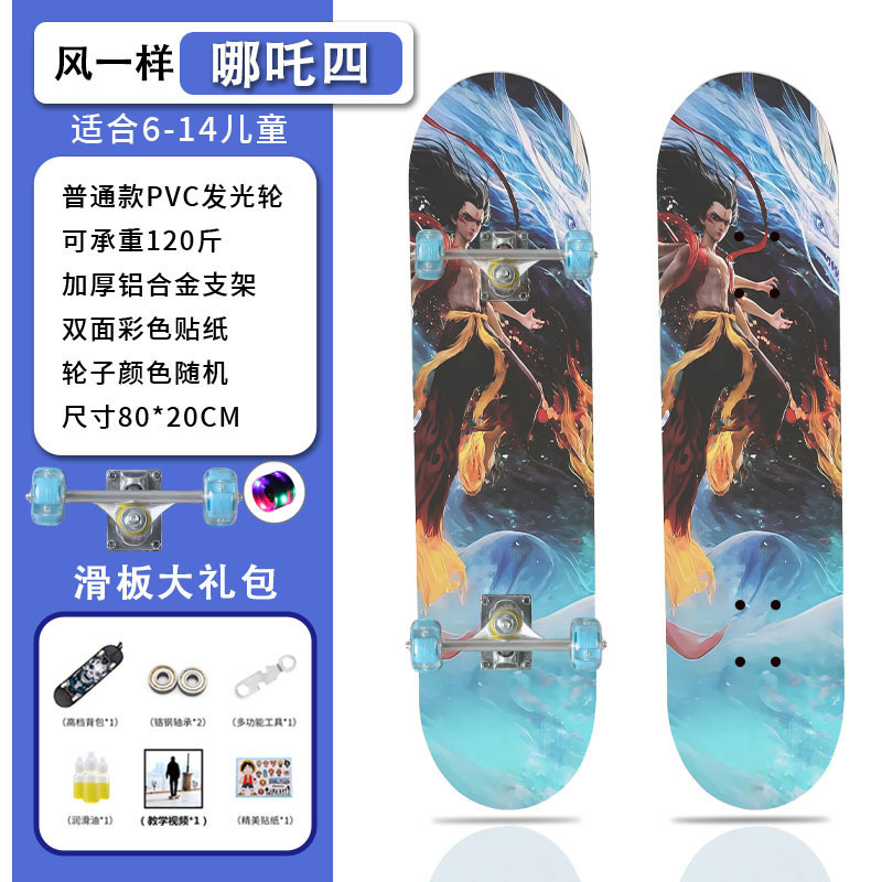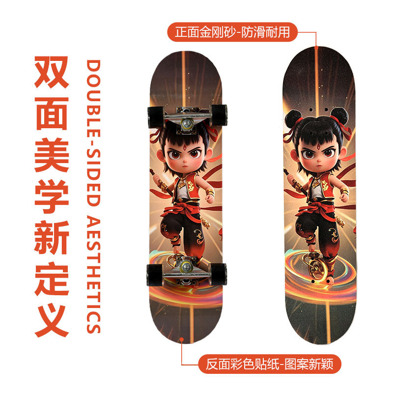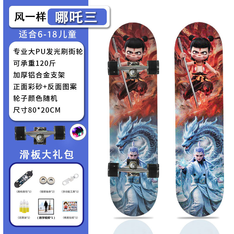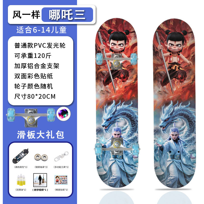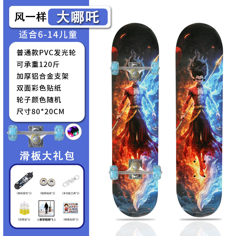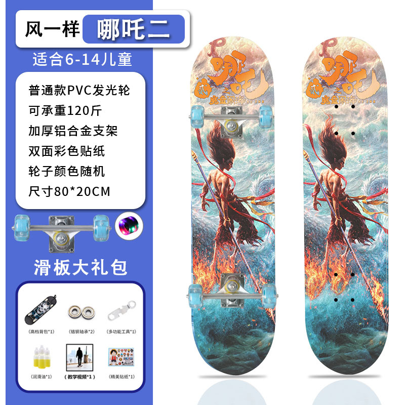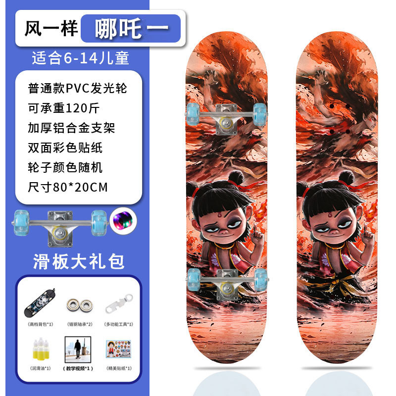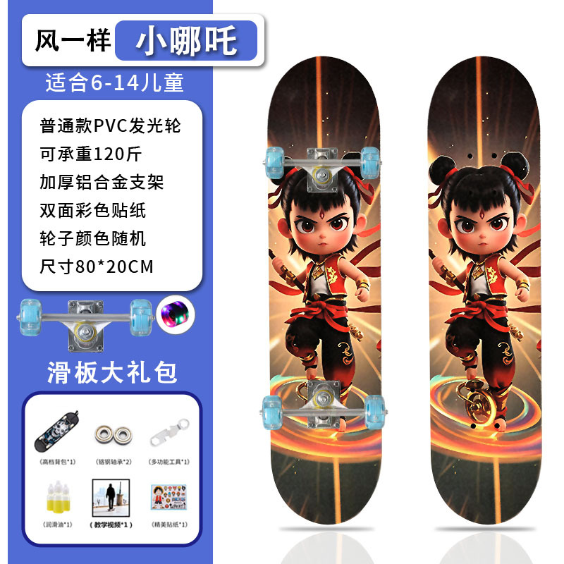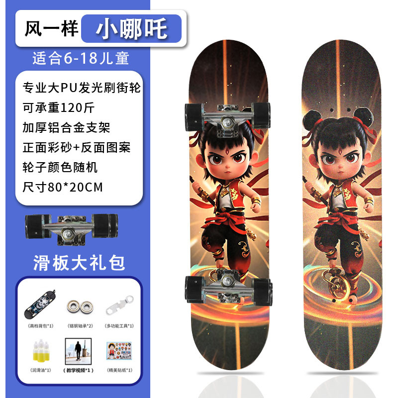 滑板创意哪吒2卡通发光轮平板滑板车青少年儿童通用初学者滑板
