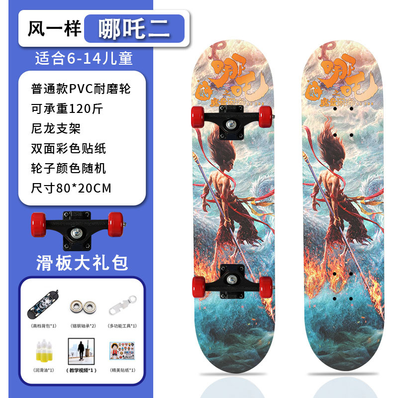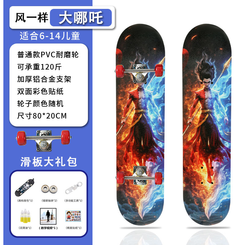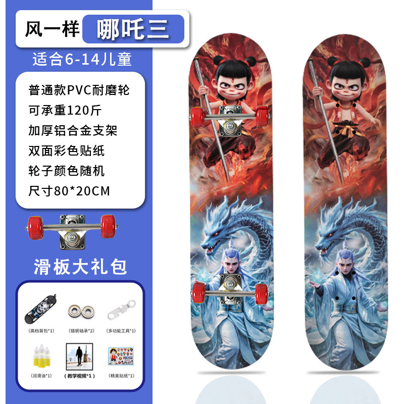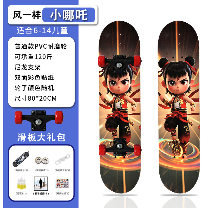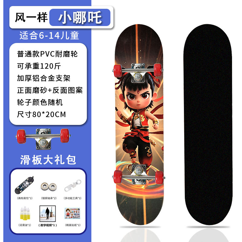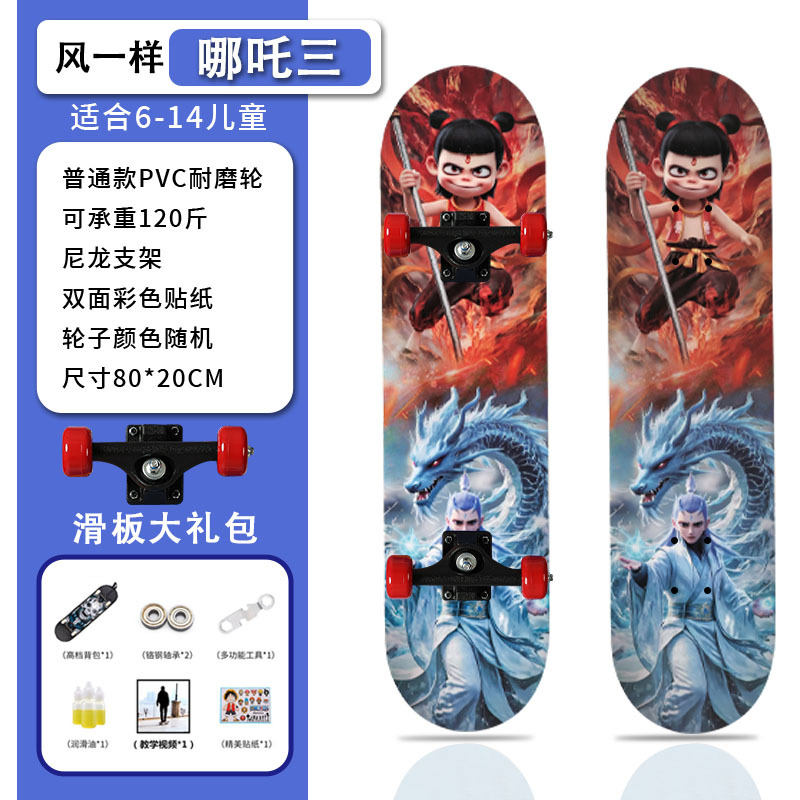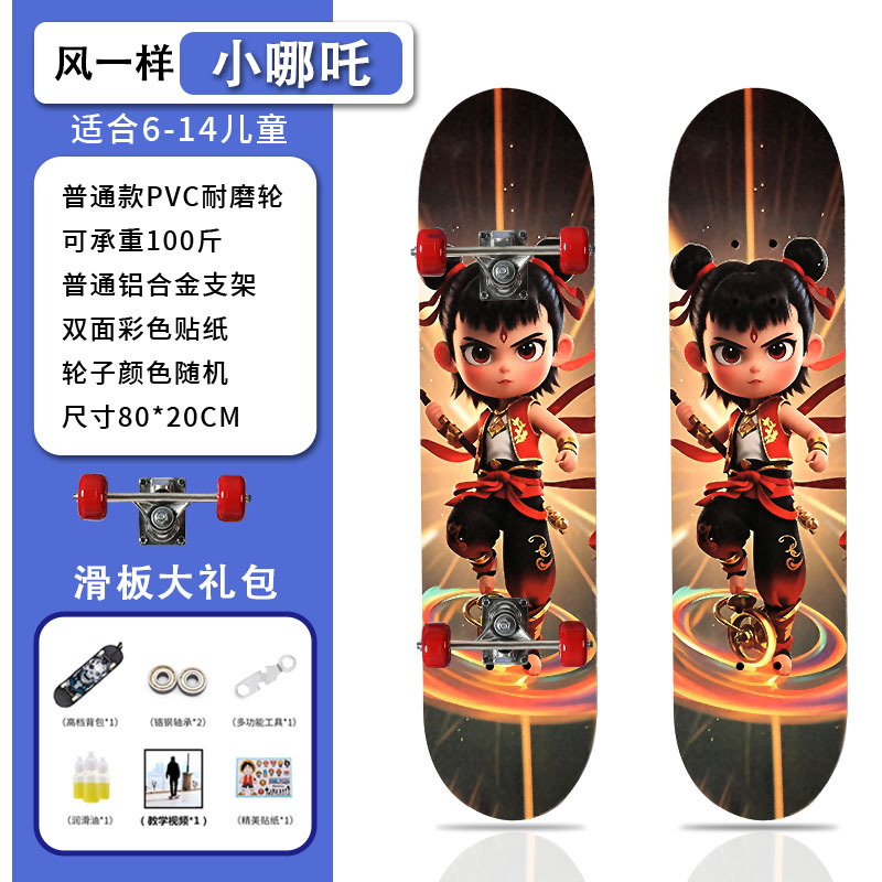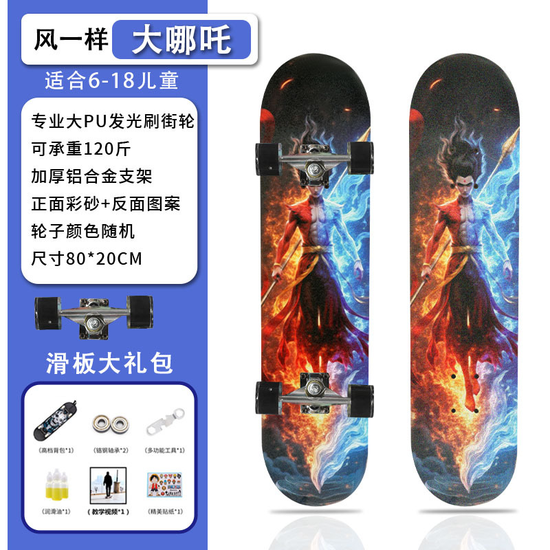 滑板创意哪吒2卡通发光轮平板滑板车青少年儿童通用初学者滑板