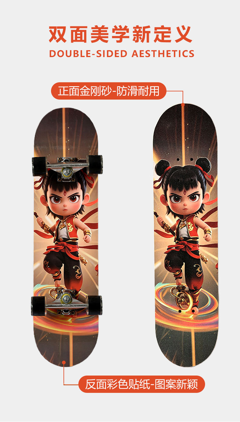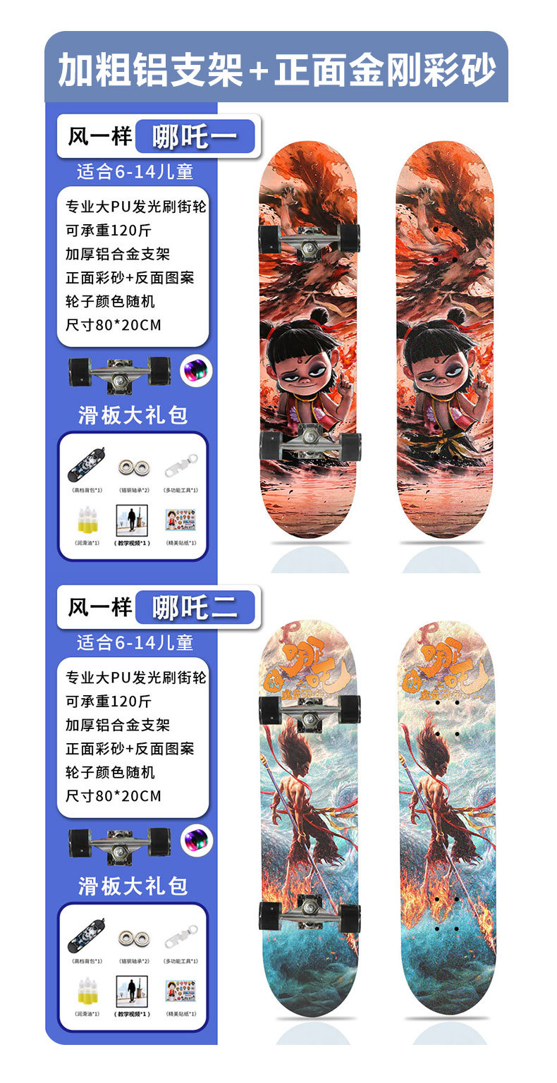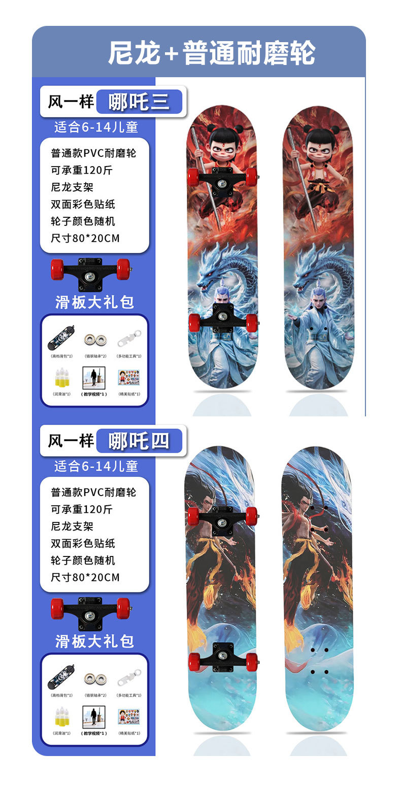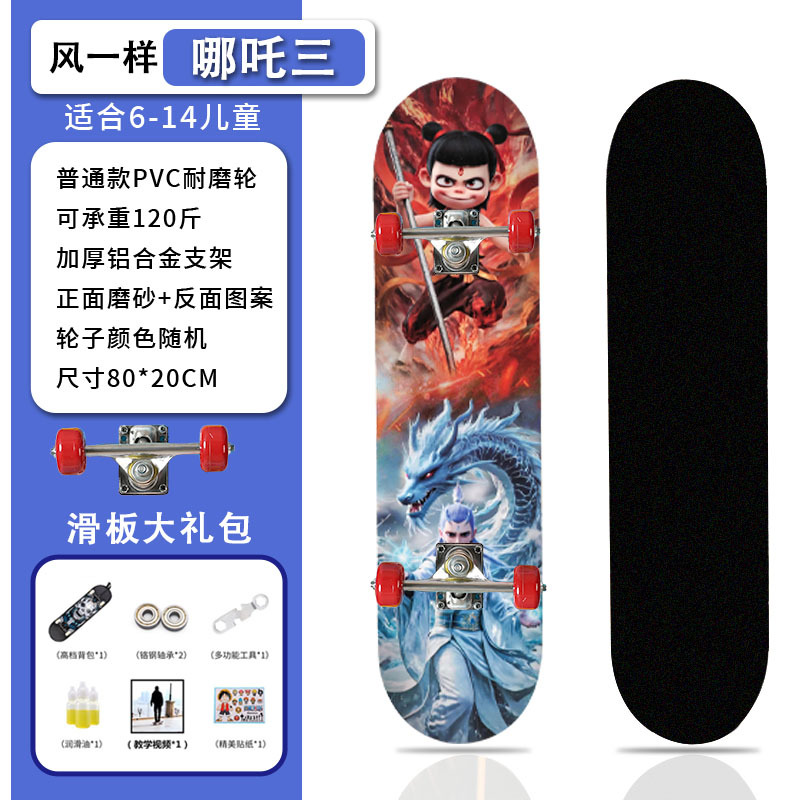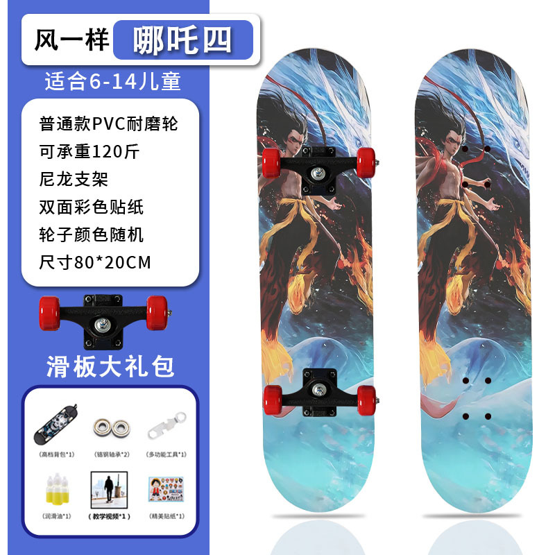滑板创意哪吒2卡通发光轮平板滑板车青少年儿童通用初学者滑板