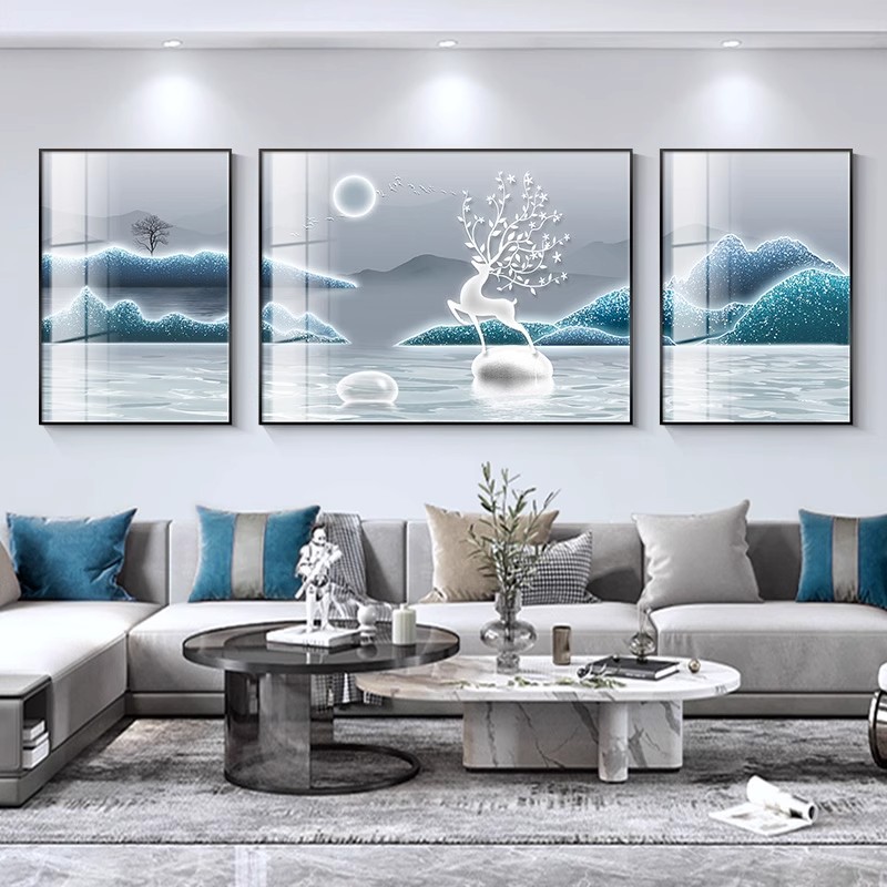 福鹿山水客厅装饰画轻奢高级感沙发背景墙抽象三联挂画高档壁画