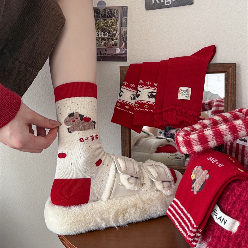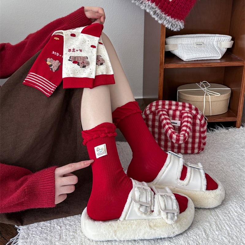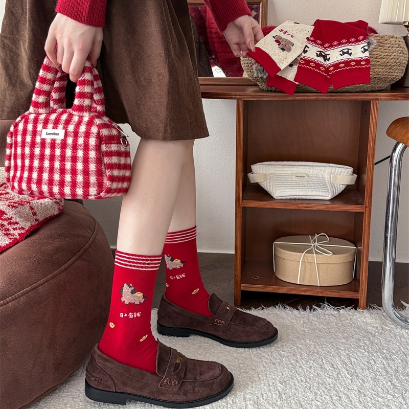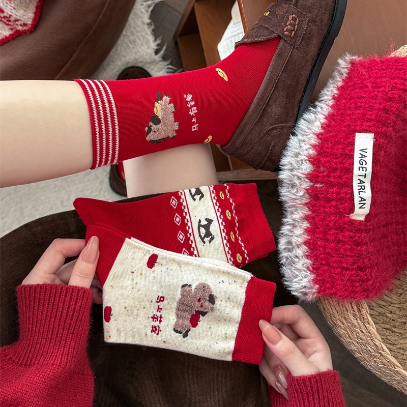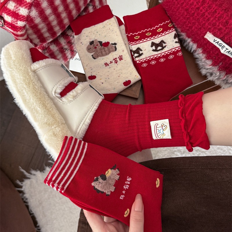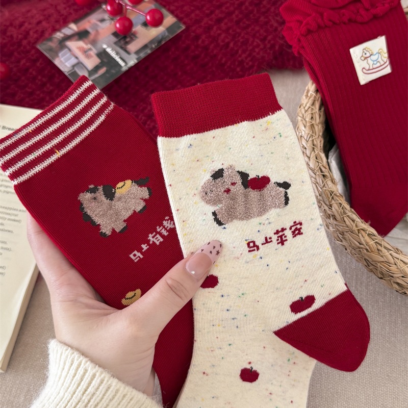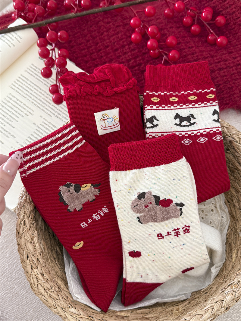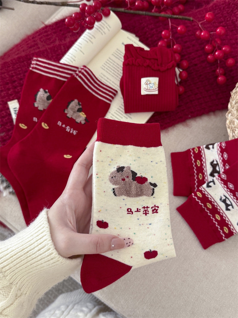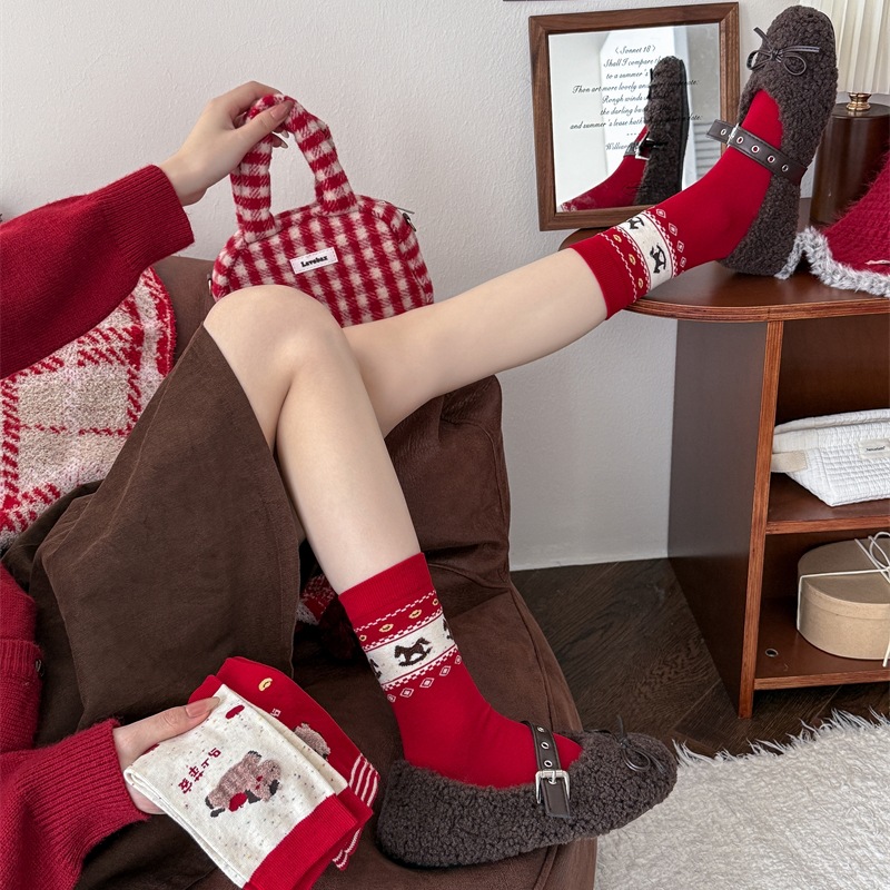 “马上平安”红色费尔岛圣诞袜子女中筒堆堆袜新年本命年大红袜子