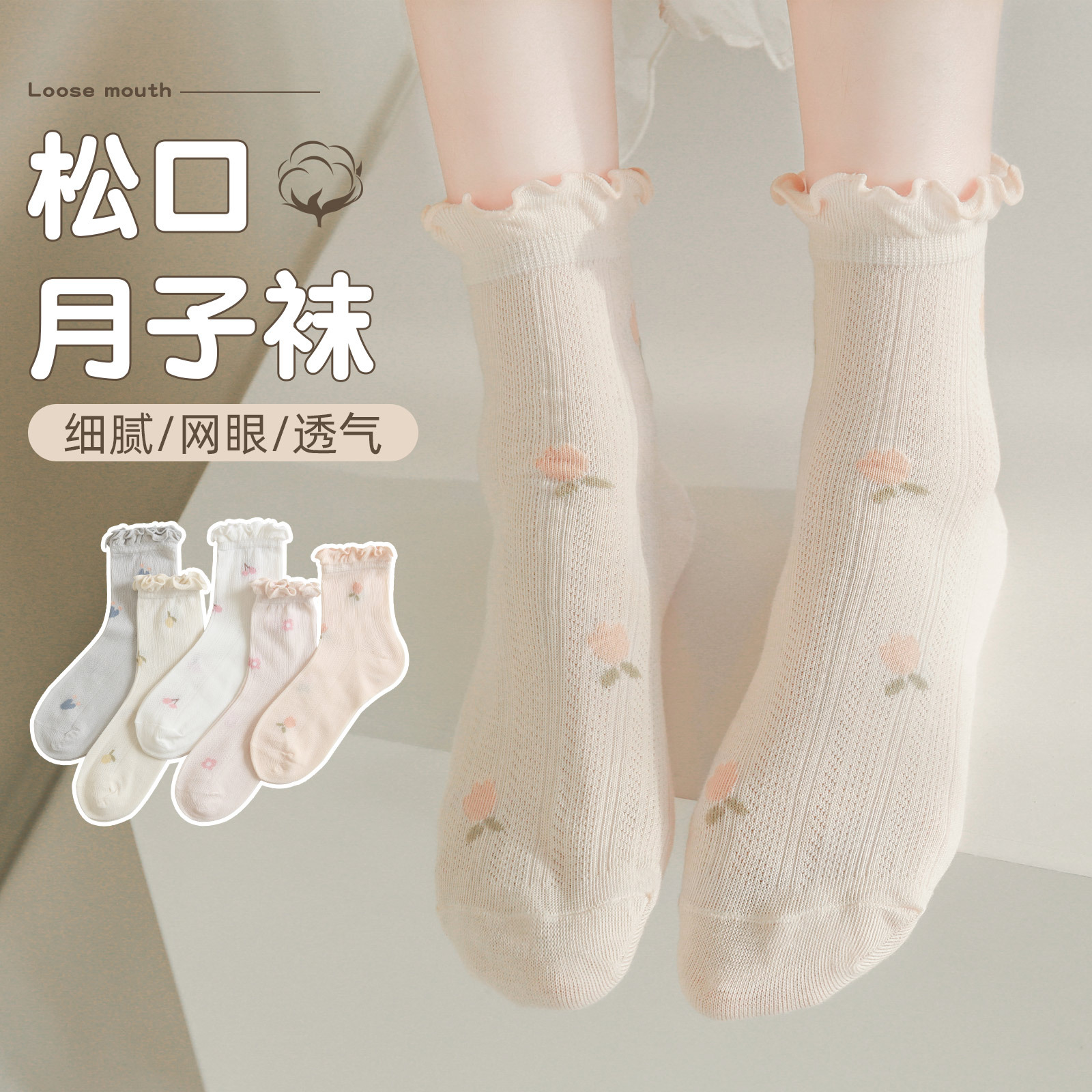 月子袜女夏季网眼透气吸汗花边袜产妇产后袜松口睡眠孕妇中筒袜子