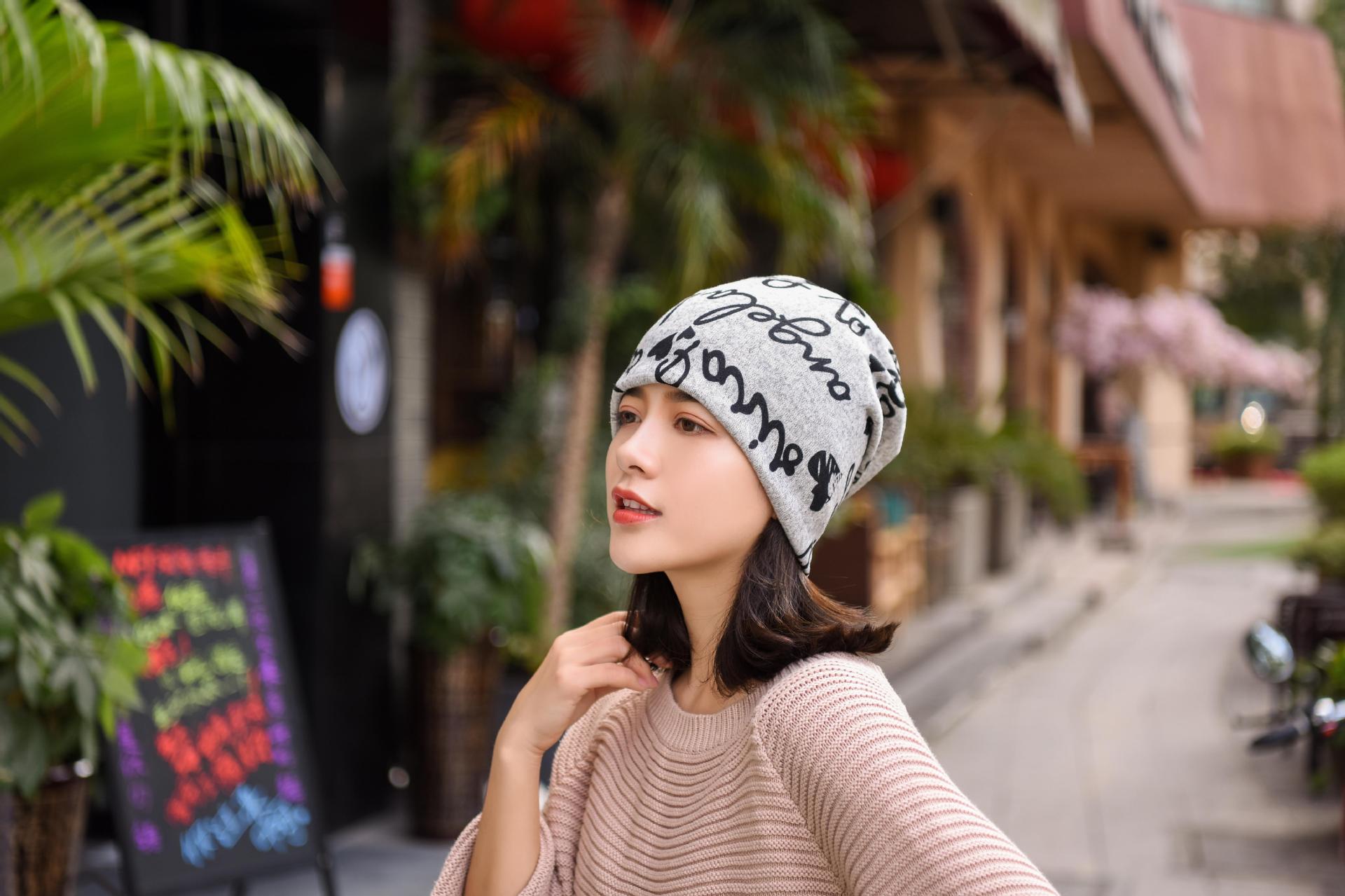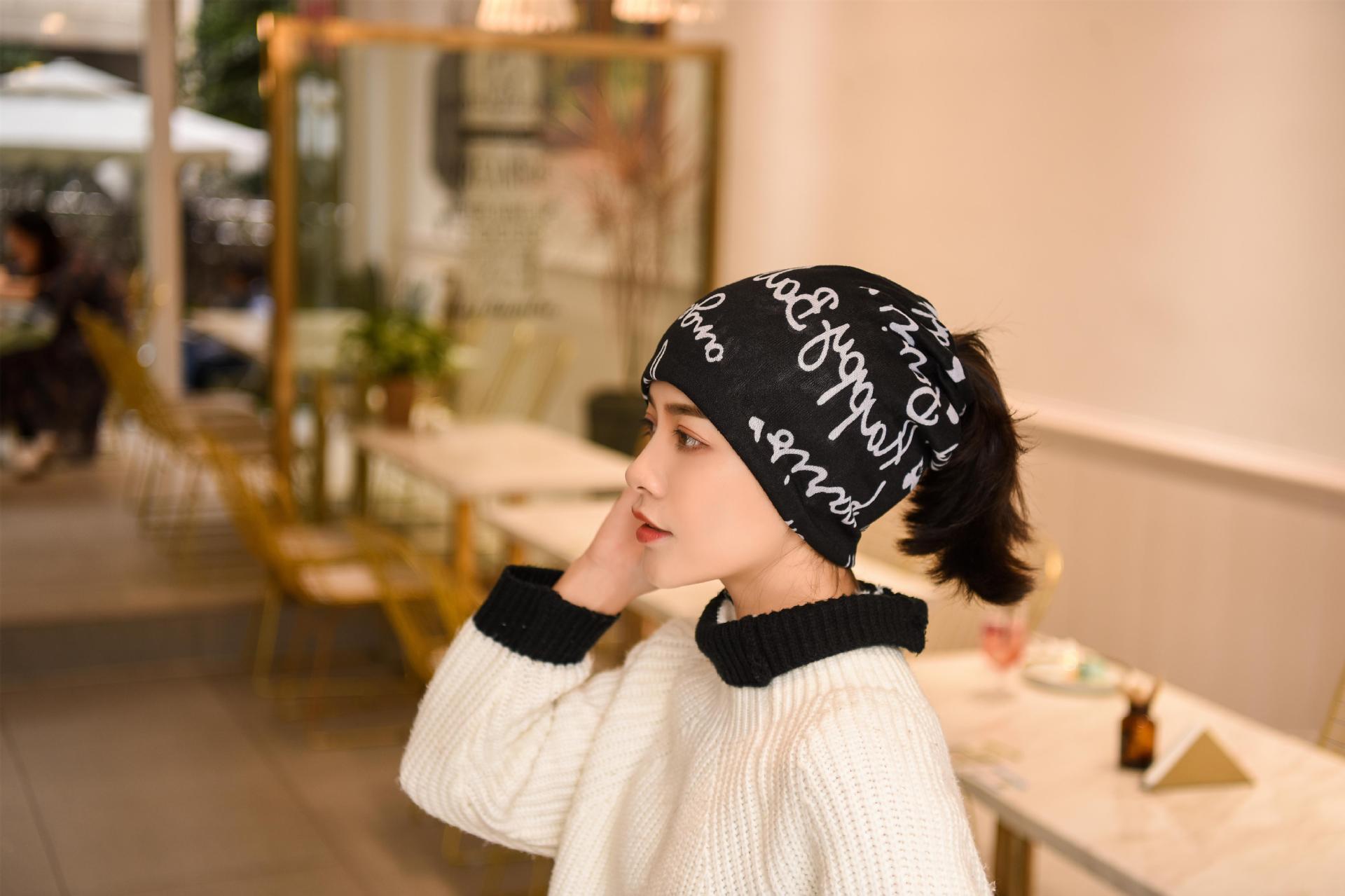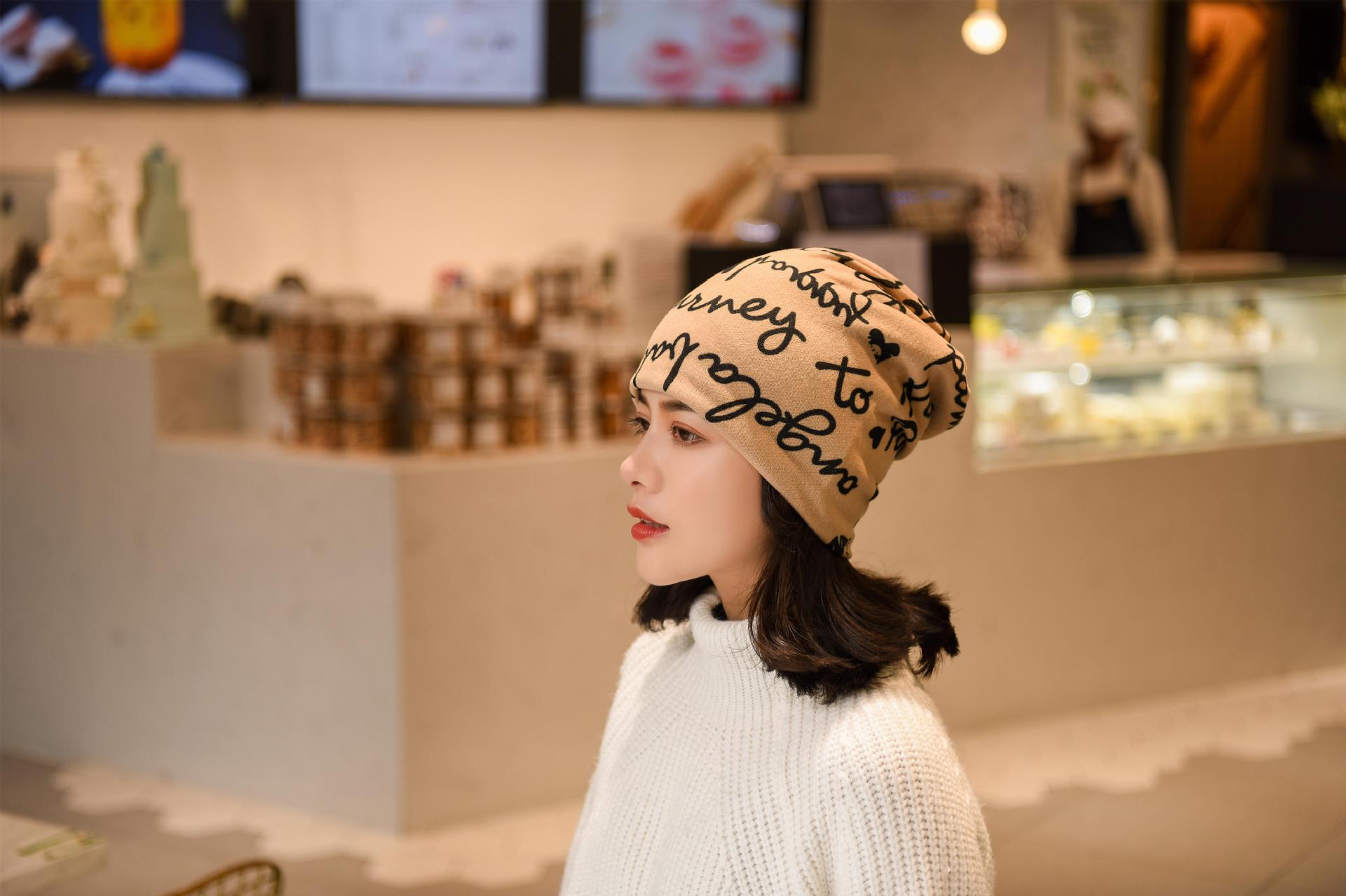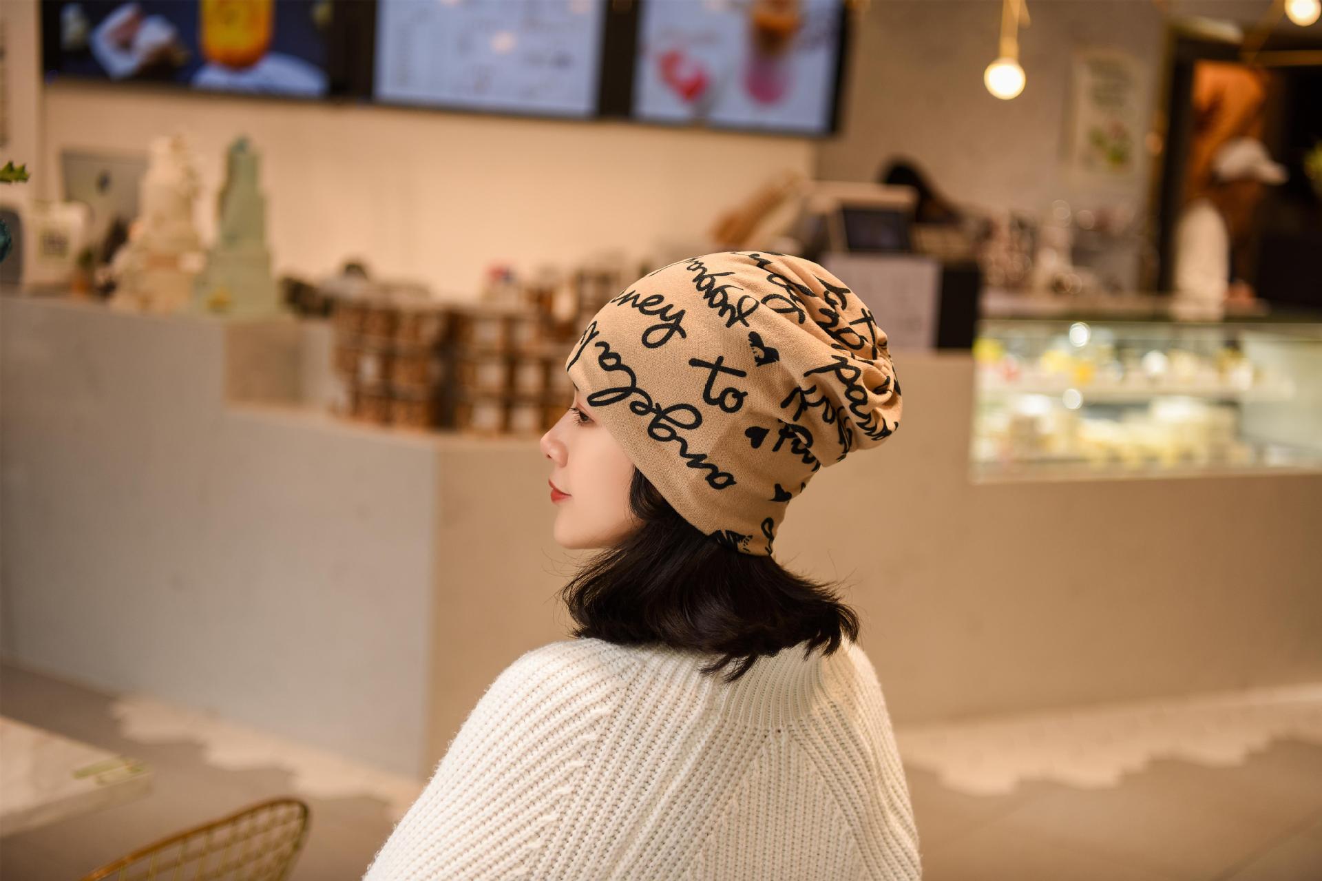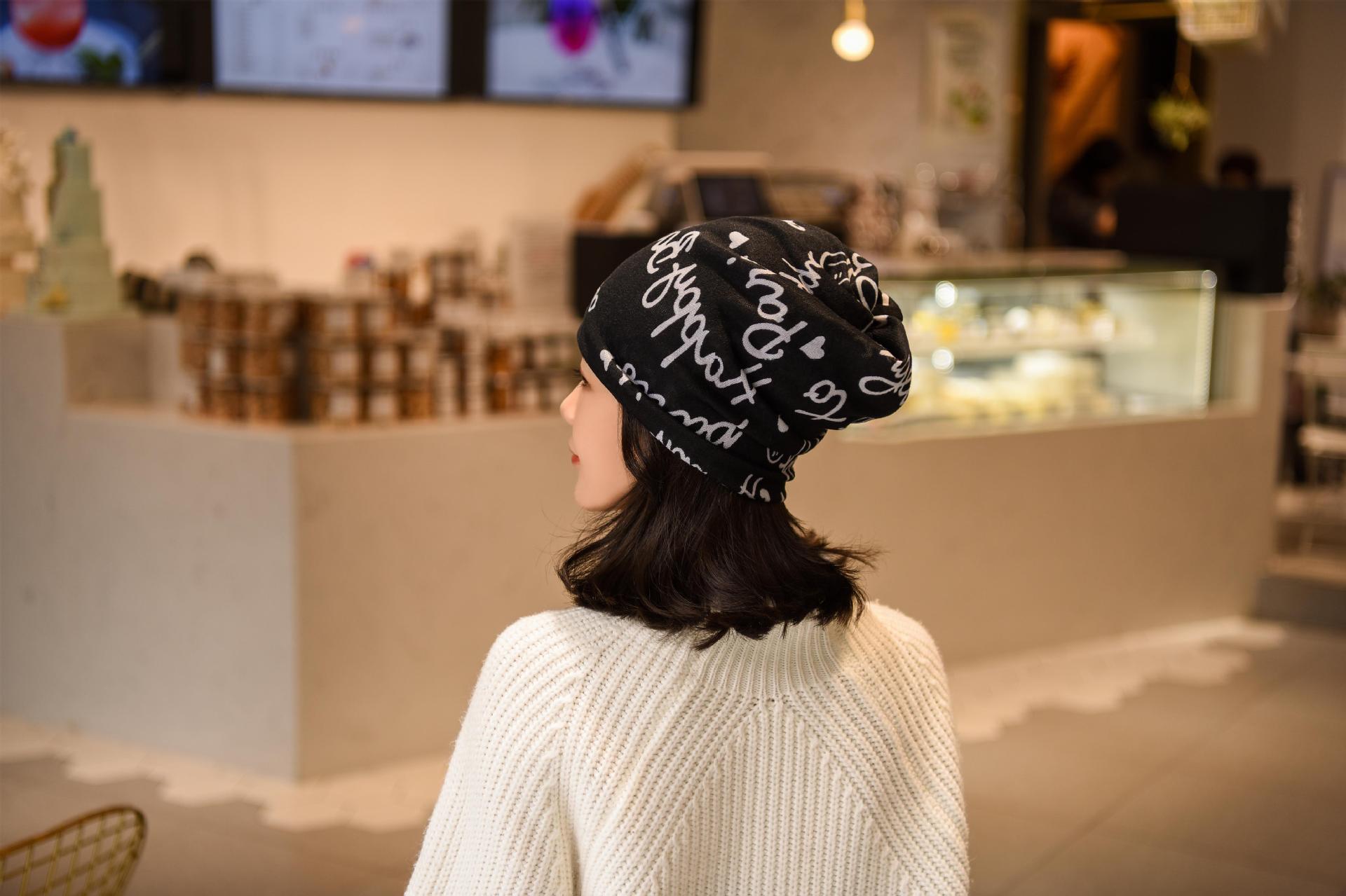 字母印花针织头巾帽户外运动时尚女士堆堆帽孕妇月子帽
