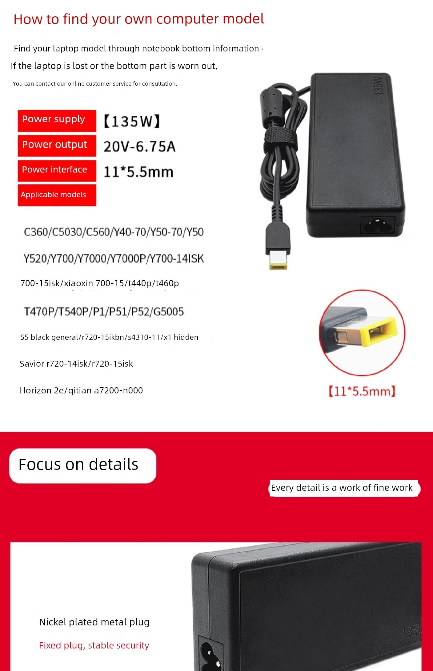 适用于联想救世主R720-15 Y520 Y7000笔记本充电器20V6.75A 135W