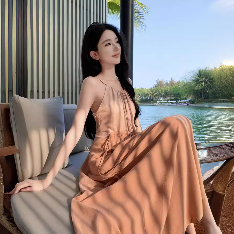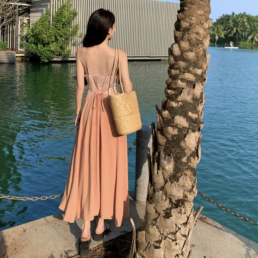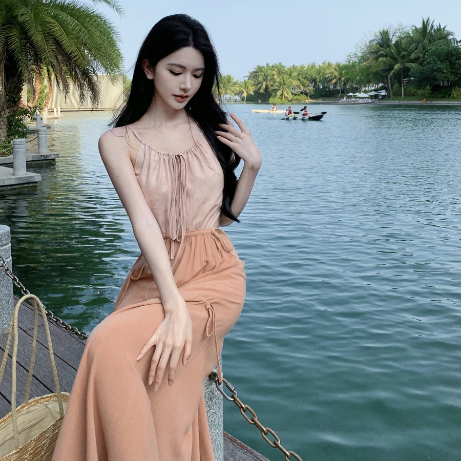 夏季新款 檀唇 粉橘藏花红抽皱棉麻感吊带连衣裙