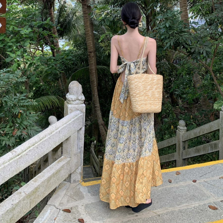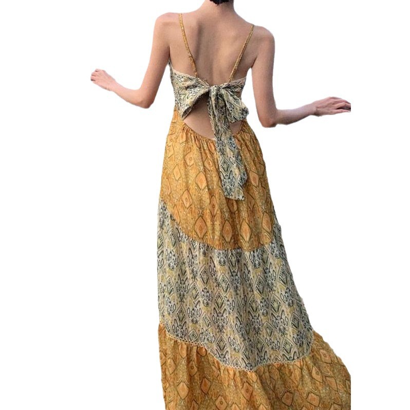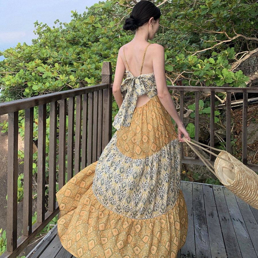 夏季新款度假风宽松细吊带V领印花分层拼接连衣裙