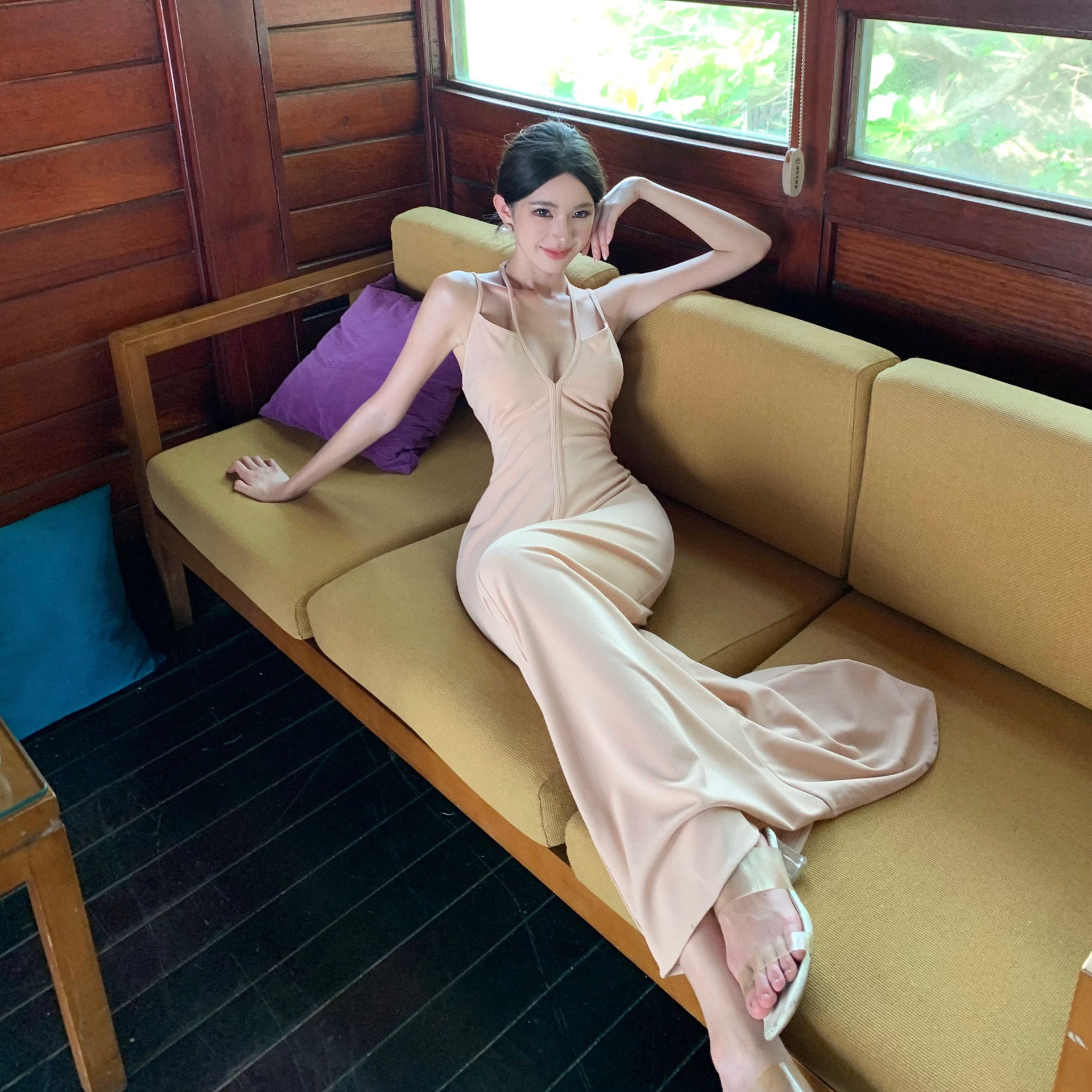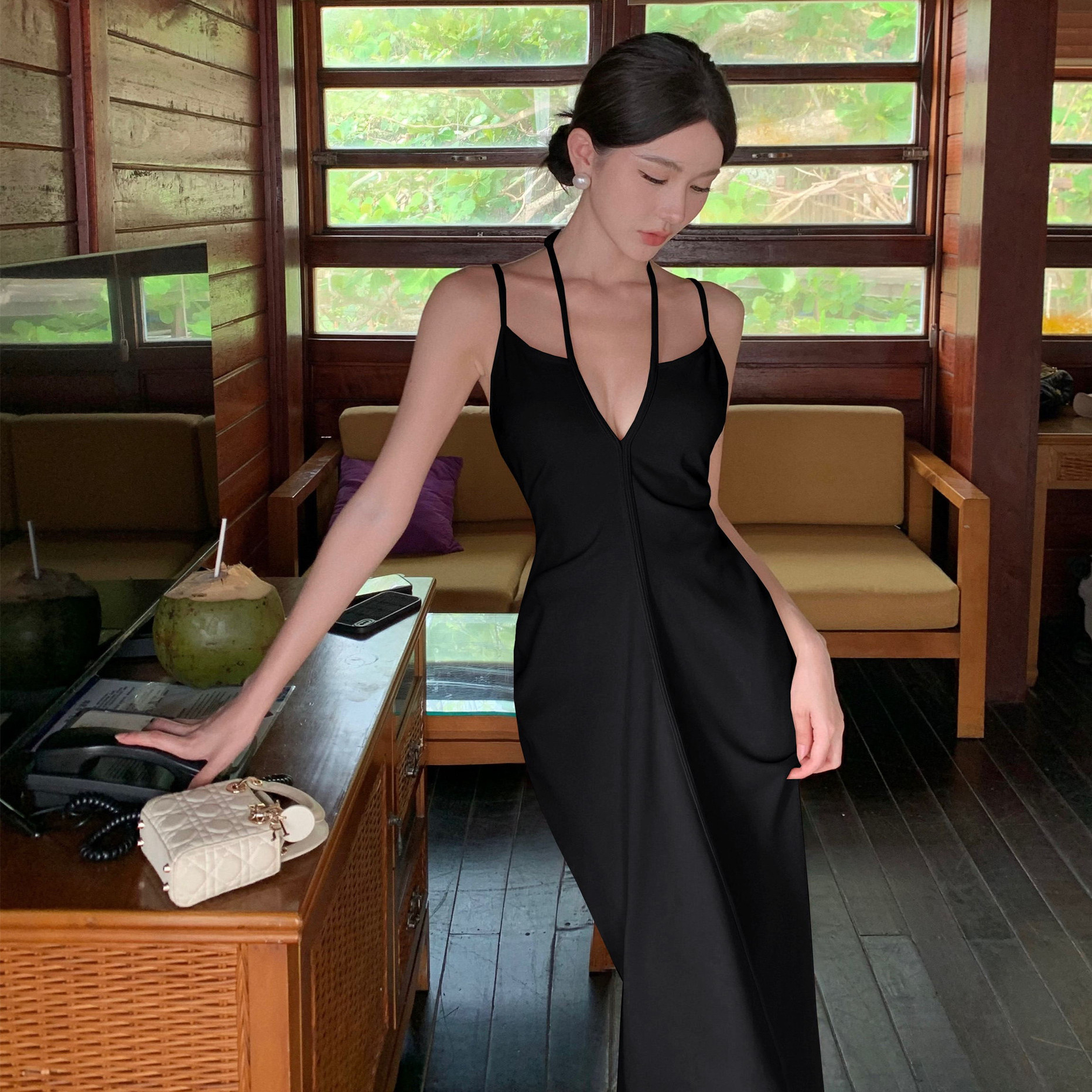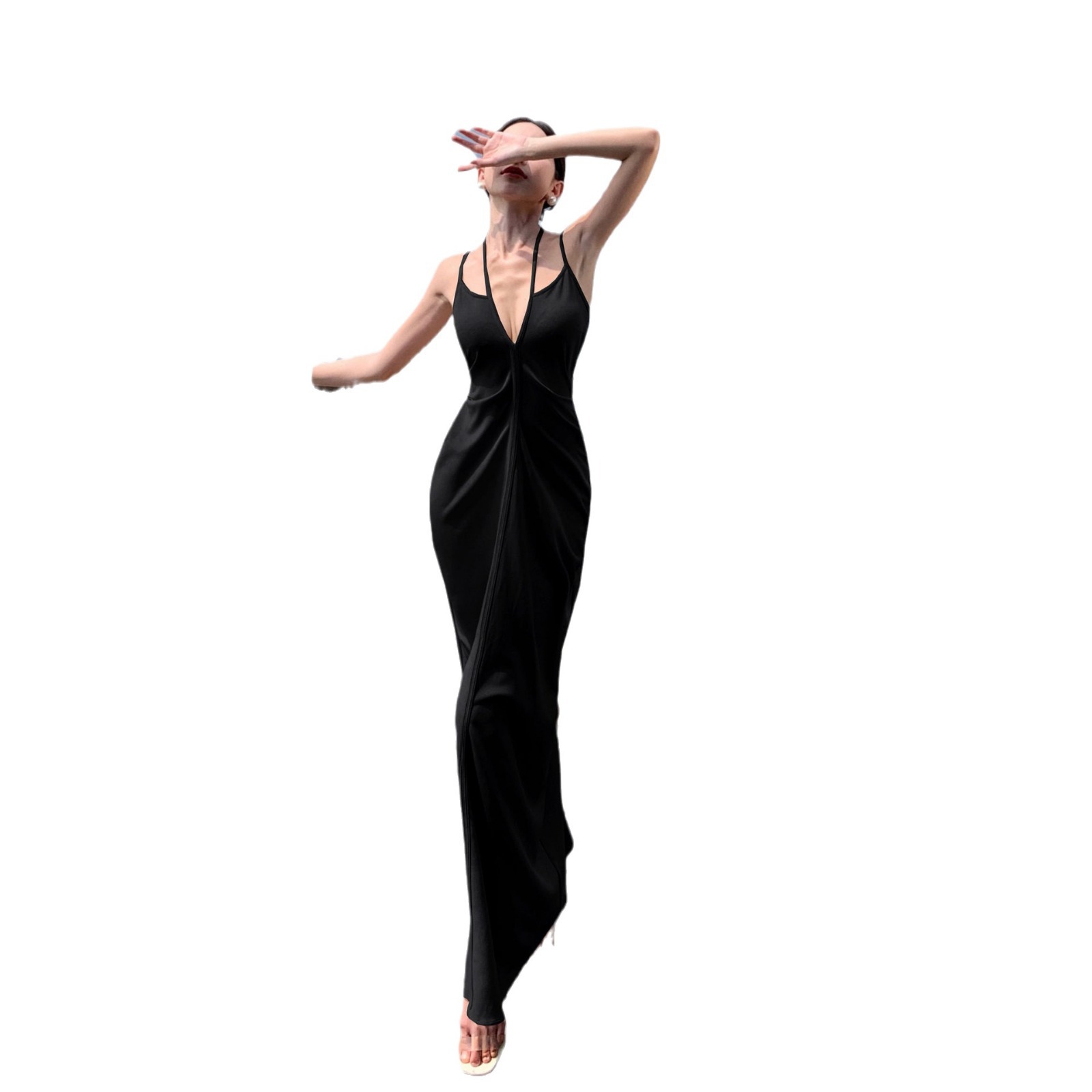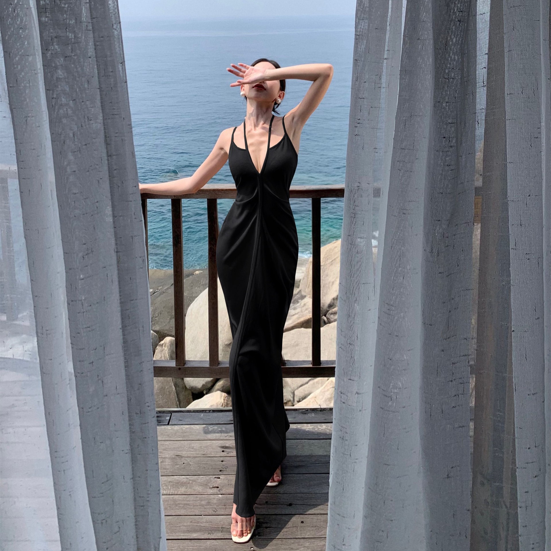 气质深V垂坠收腰立裁挂脖露背吊带连衣裙