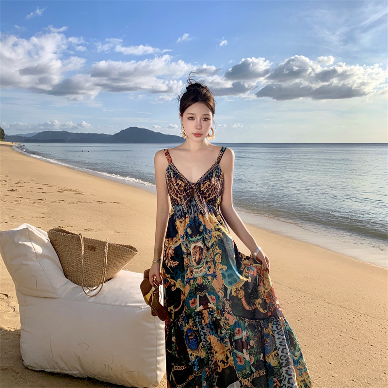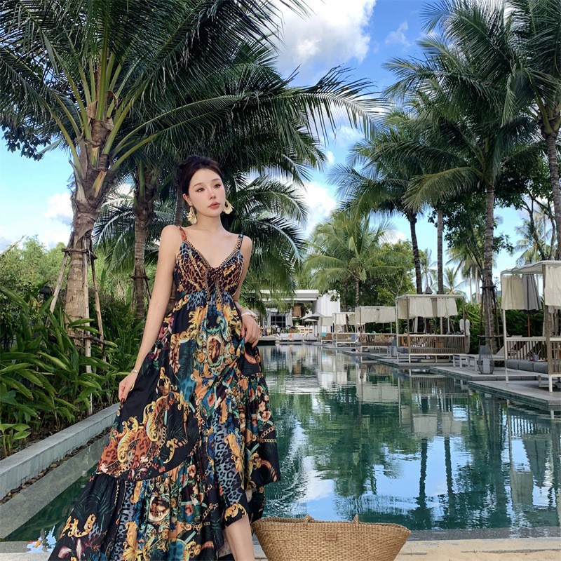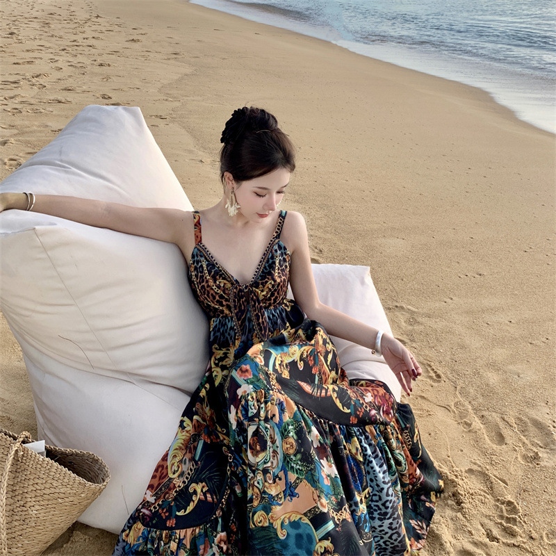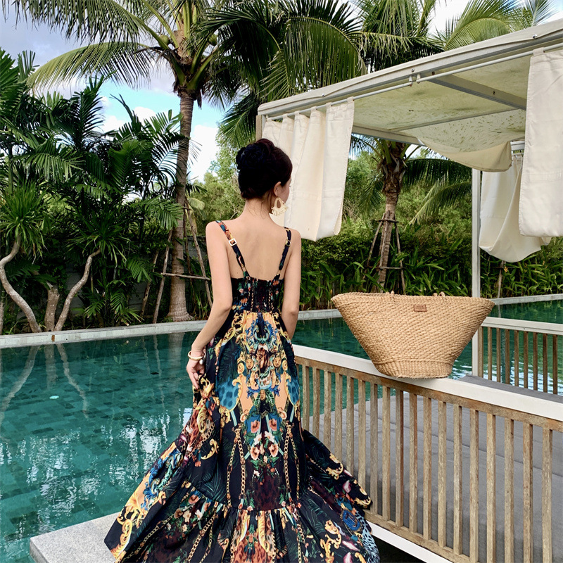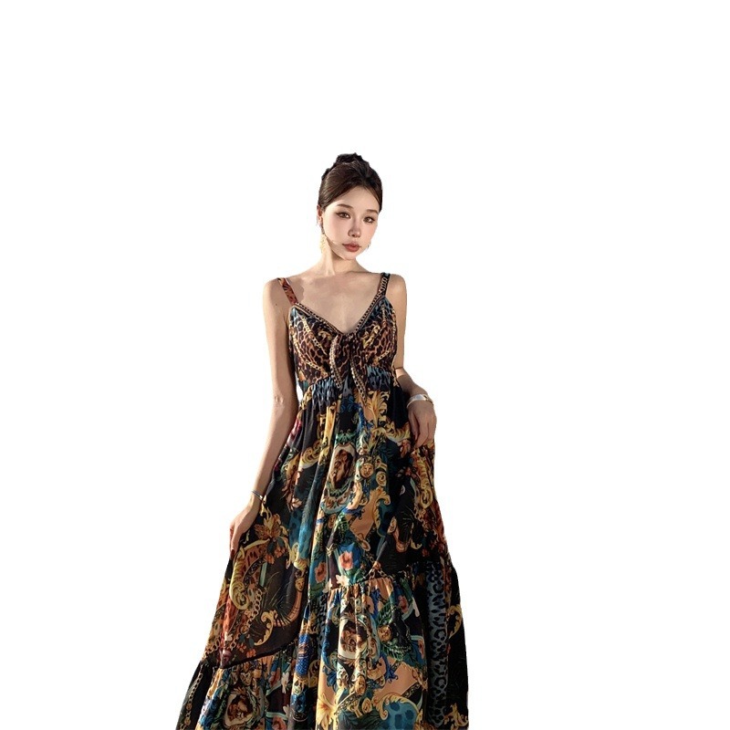 森林异域风情吊带连衣裙新款独特复古印花设计感海边度假长裙
