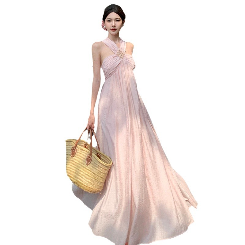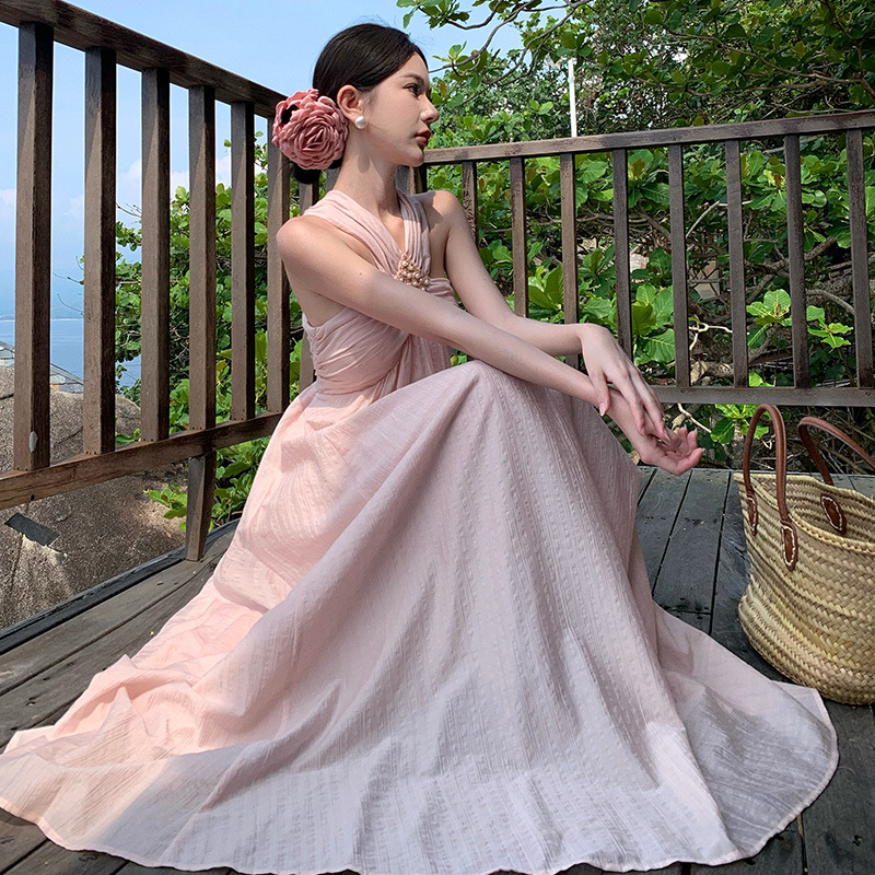 神女风度假连衣裙春装女年新款粉色挂脖长裙