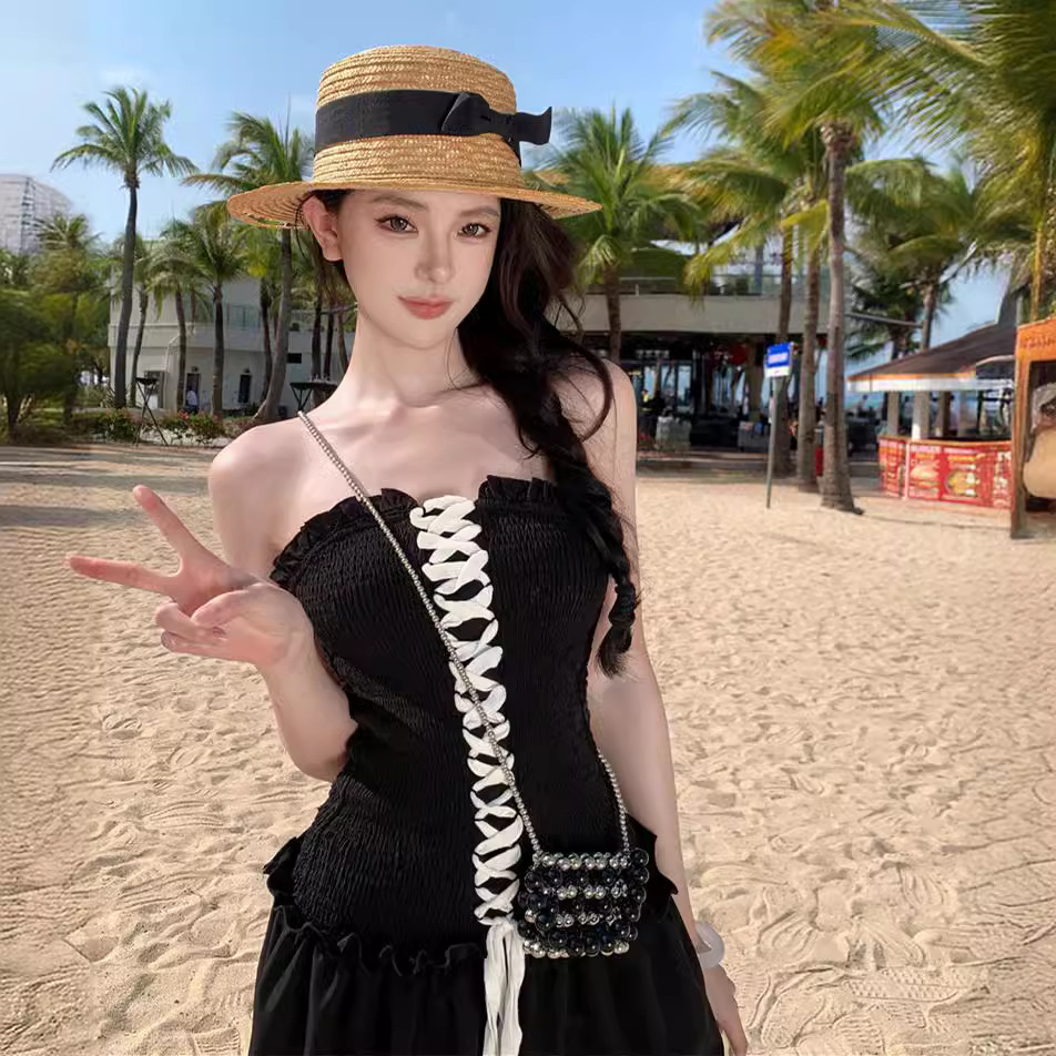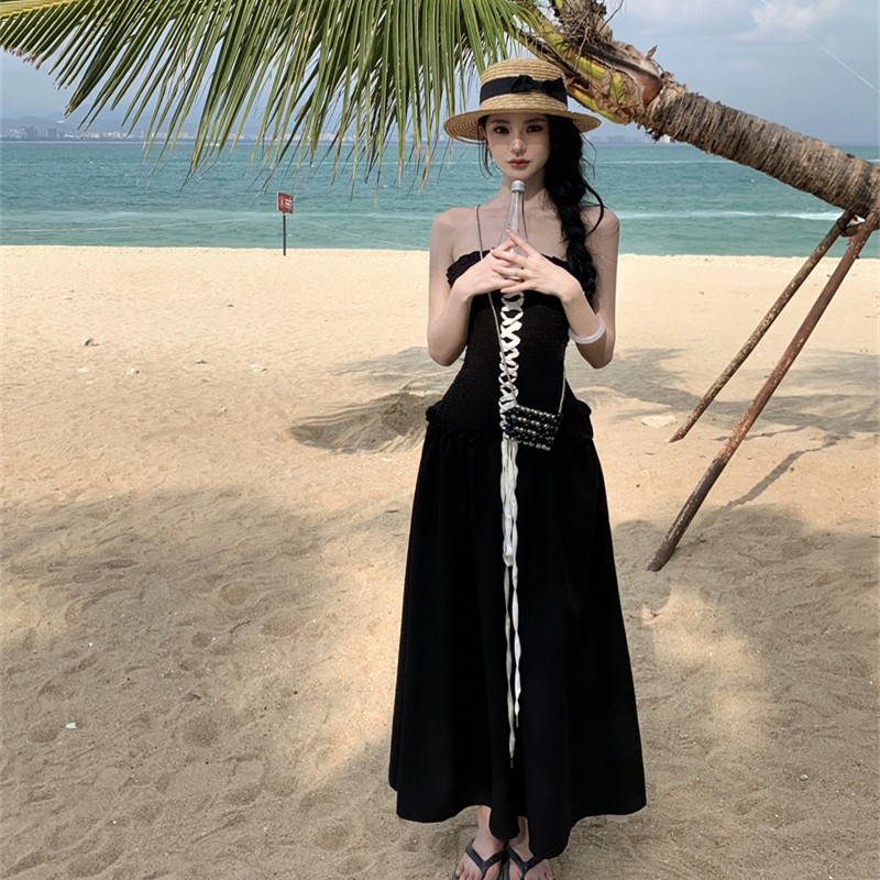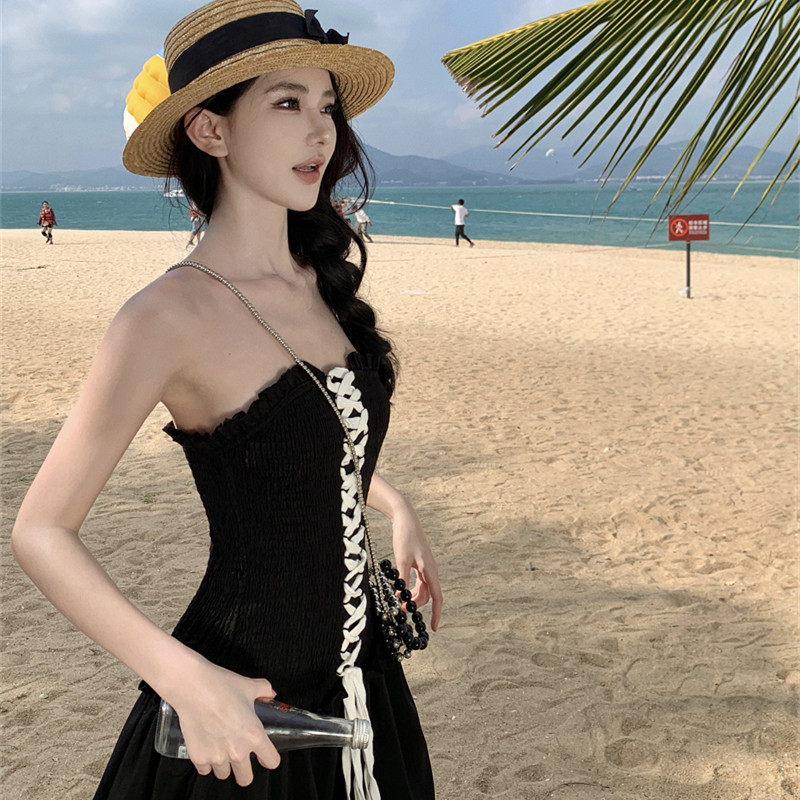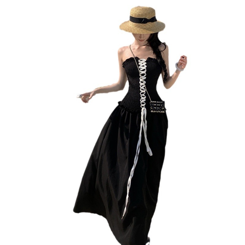 连衣裙出游拍照黑色胸口绑带打揽高级感抹胸裙ins