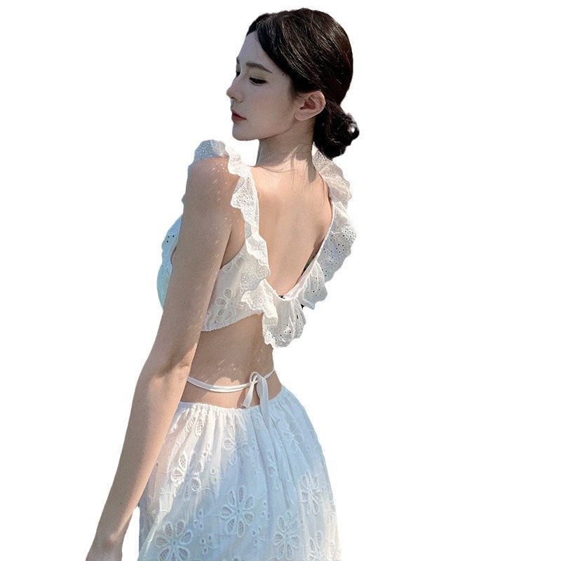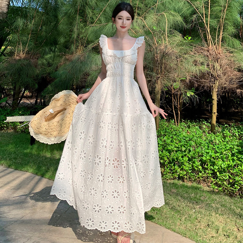 小众浪漫荷叶边方领刺绣连衣裙法式度假风露背开衩仙女长裙