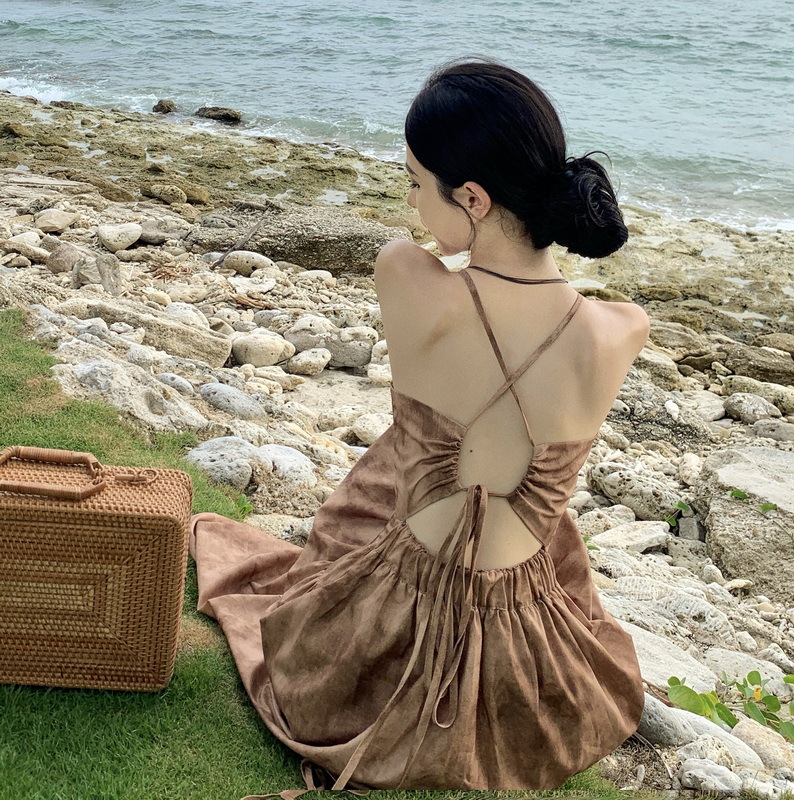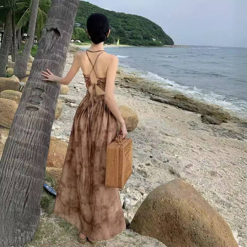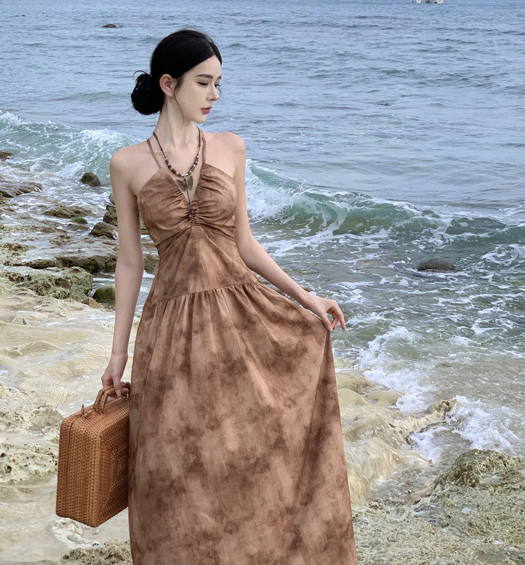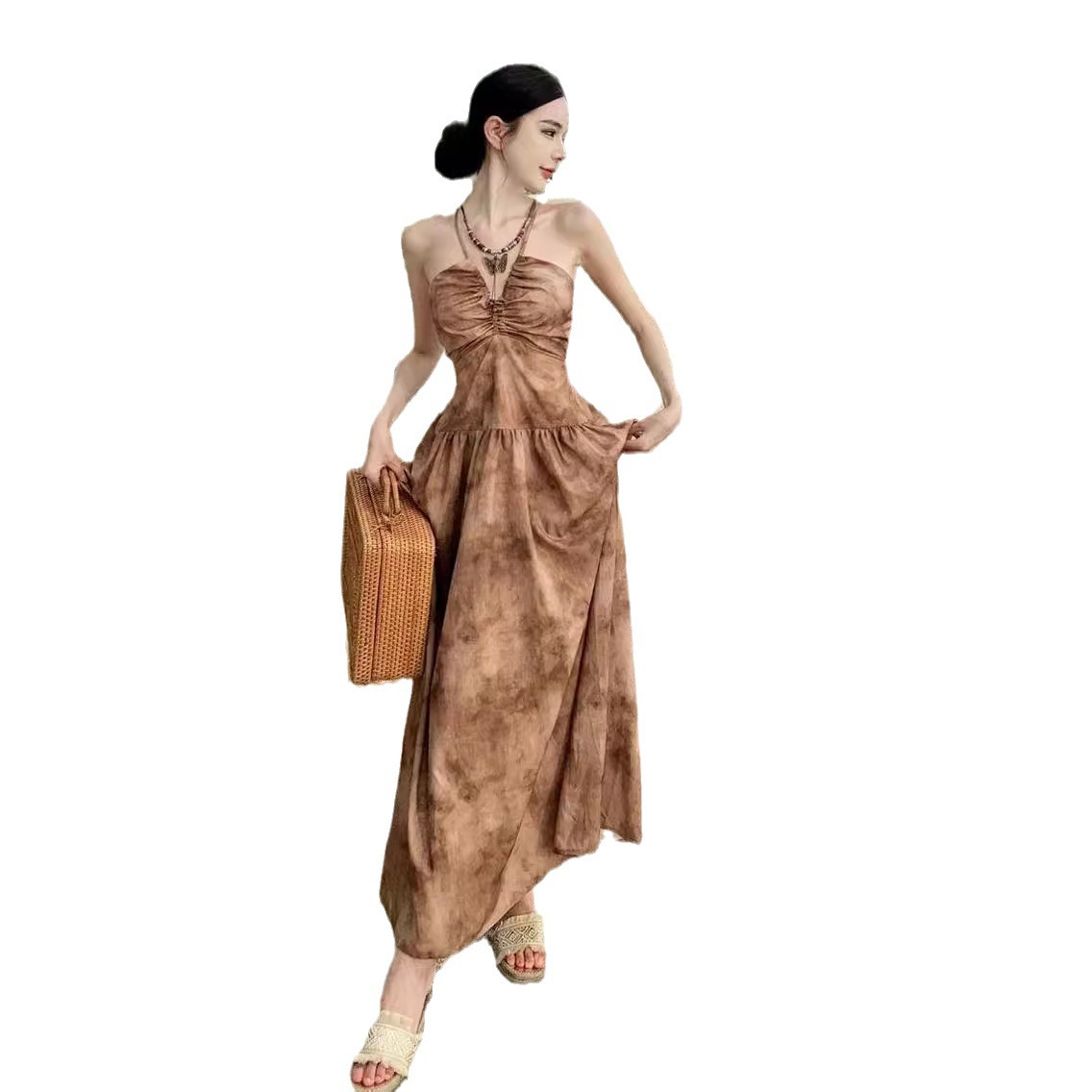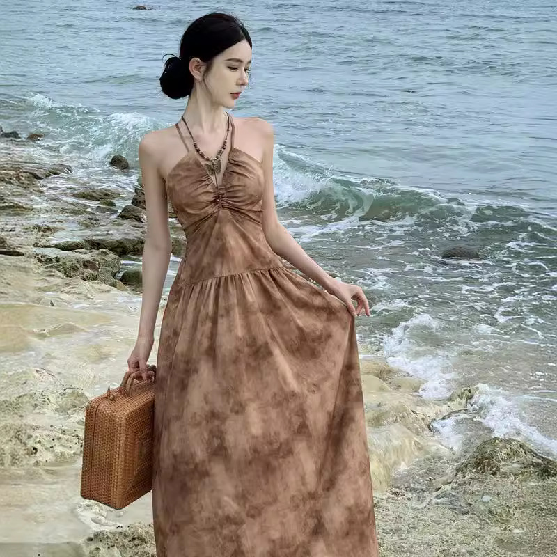 纯欲挂脖吊带v领连衣裙女夏季新款收腰露背性感咖色a字长裙