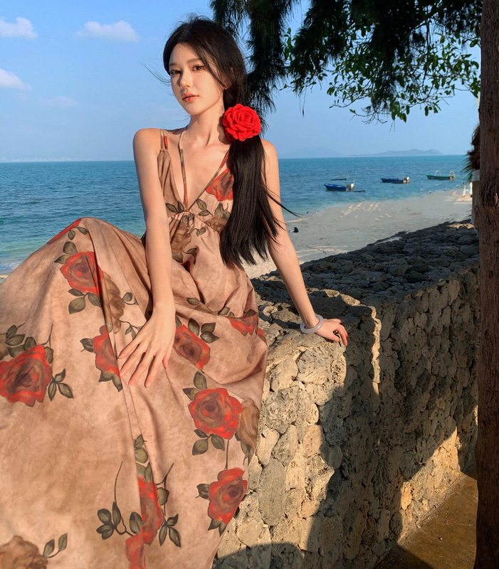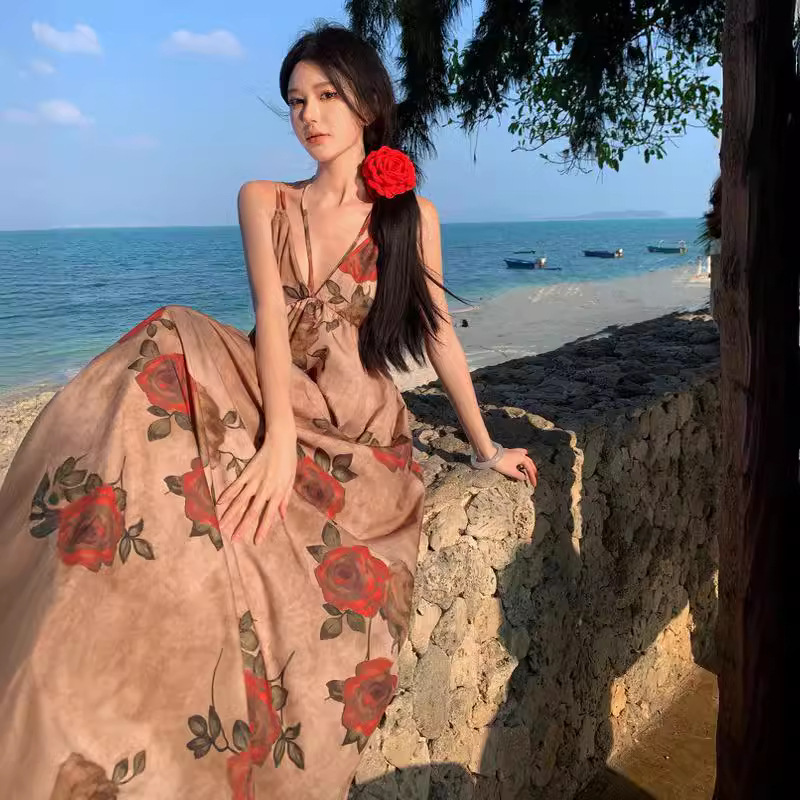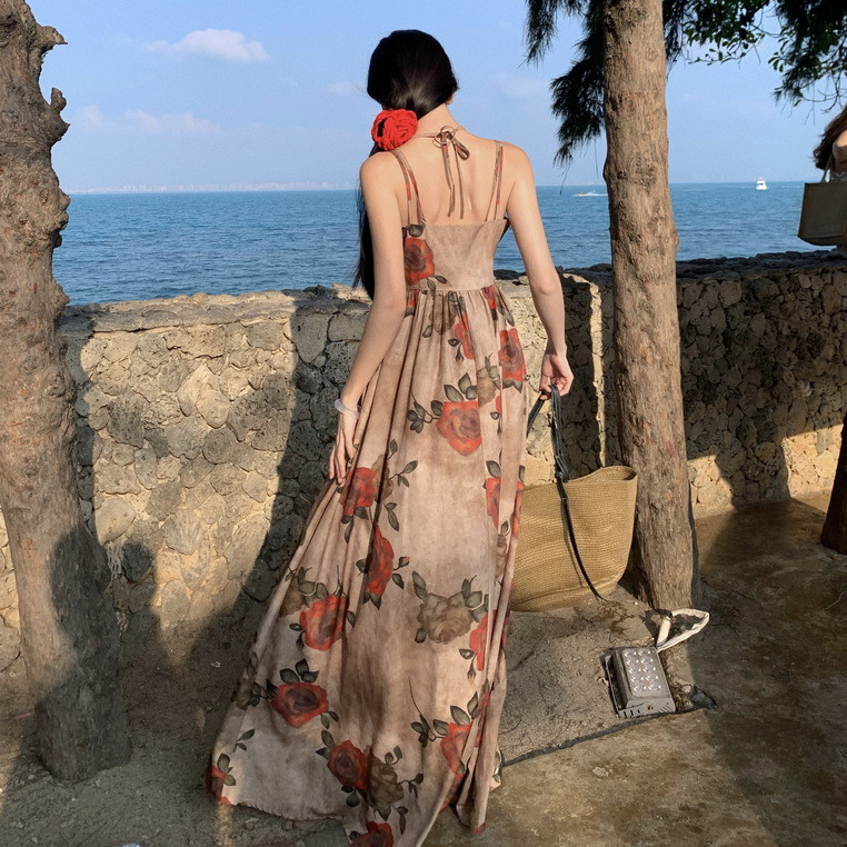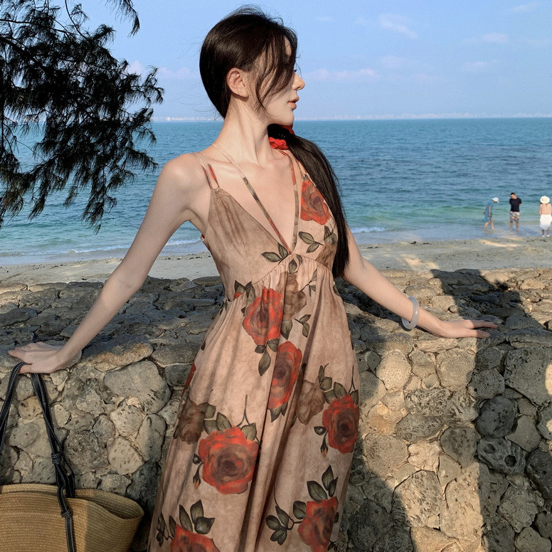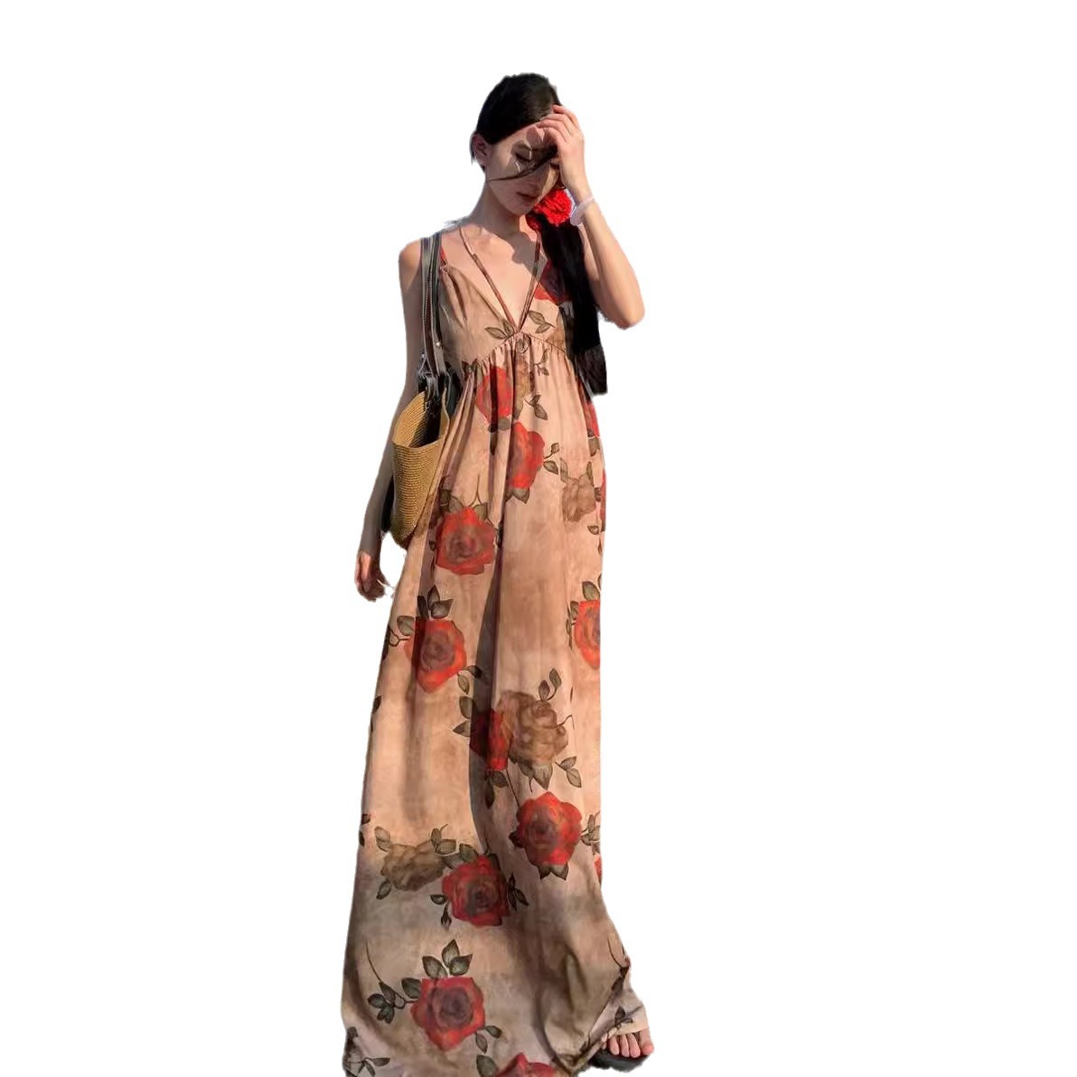 新款 法式高级感铜氨丝印花吊带露背连衣裙度假长裙沙滩裙