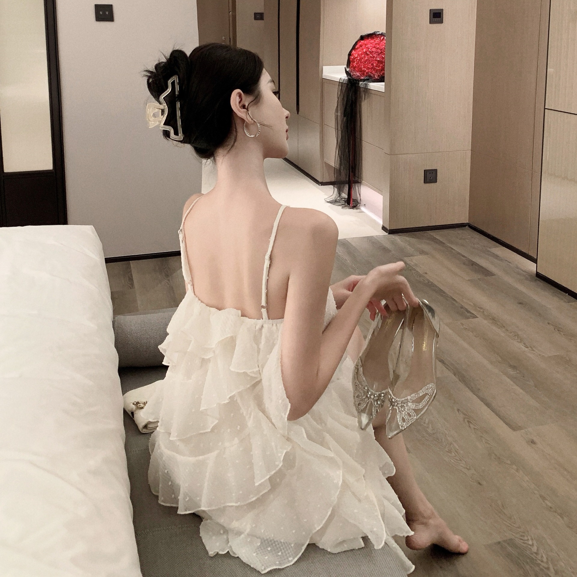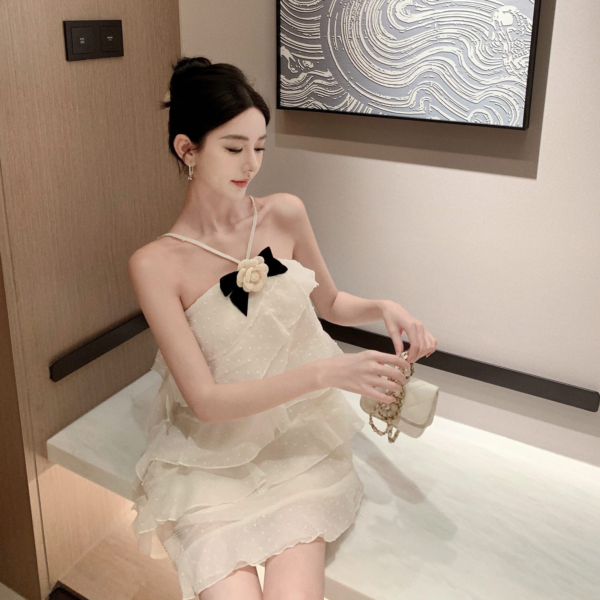 夏季性感波点垂感无袖挂脖抹胸连衣裙短款高级感蛋糕裙