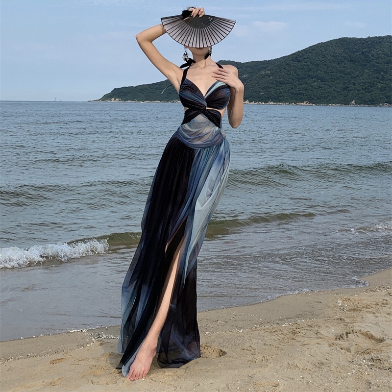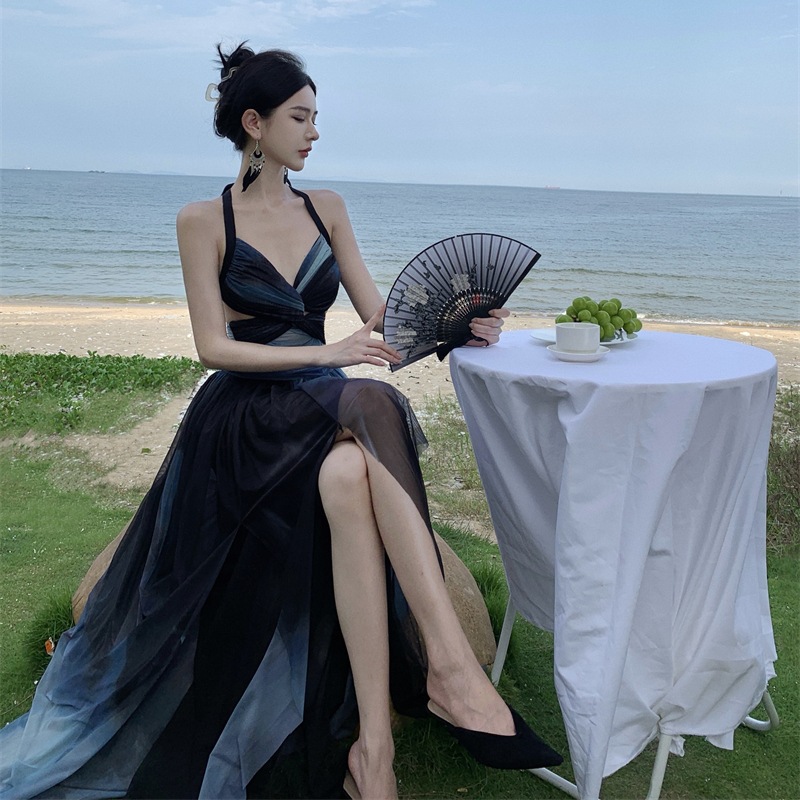 蓝色系海洋度假风原创印花露背御姐连衣裙波西米亚长裙