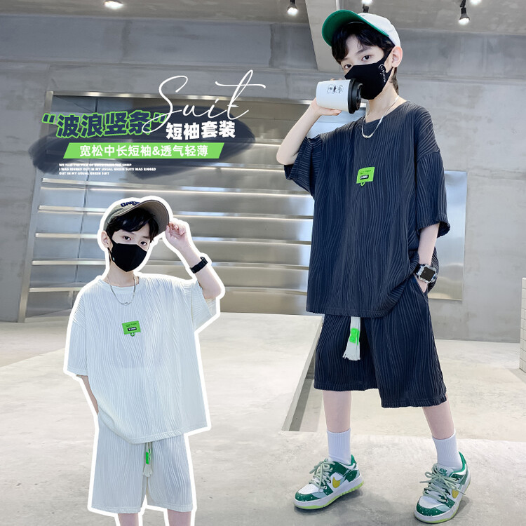 夏季新款大男童短袖短裤套装童装儿童男孩竖条两件套字母休闲运动