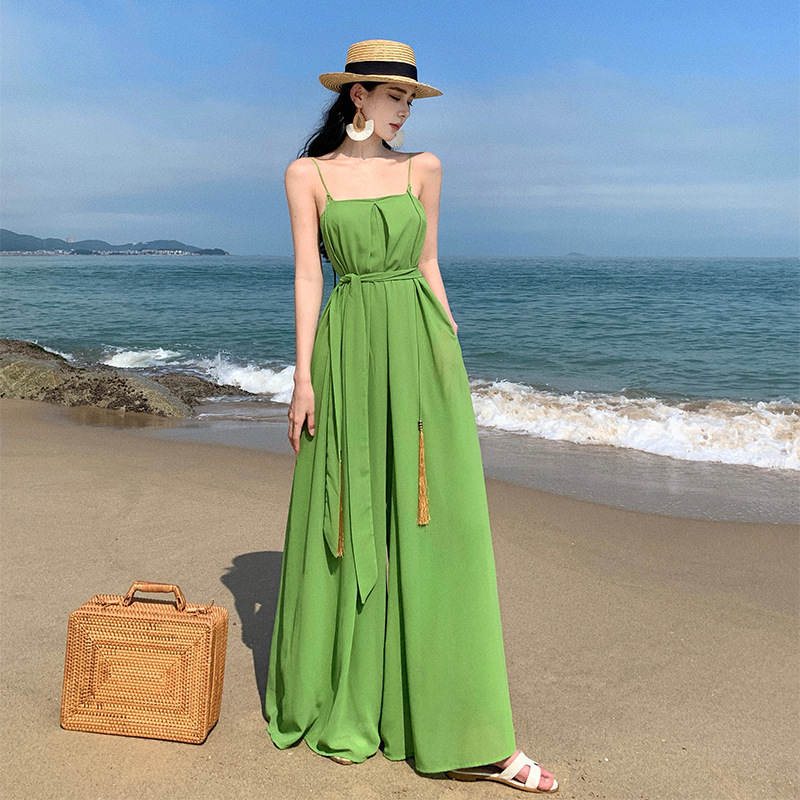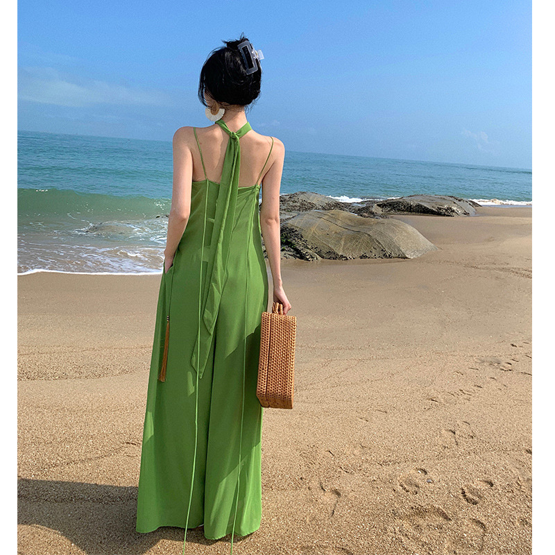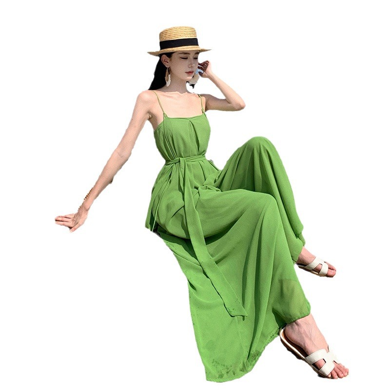 高个子拖地裤阔腿裤海边度假中国风吊带连体裤拖地长裤
