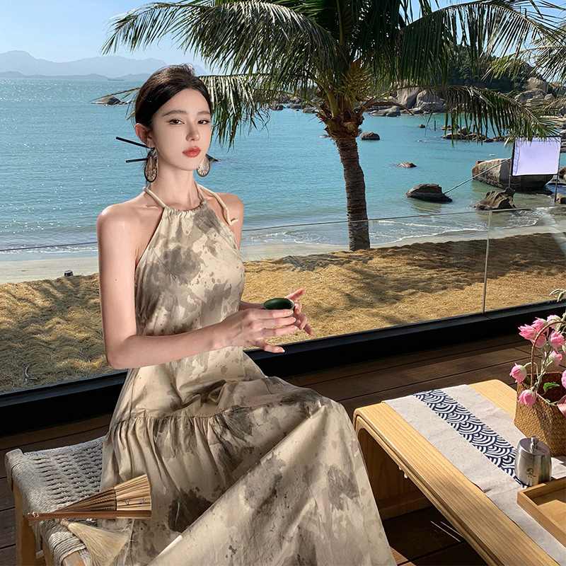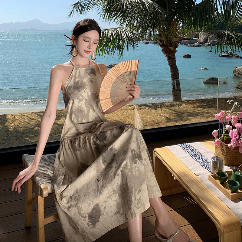 小众水墨风露背裙后背设计感挂脖度假裙