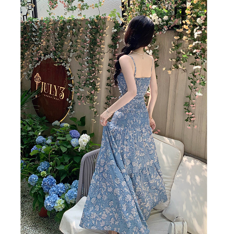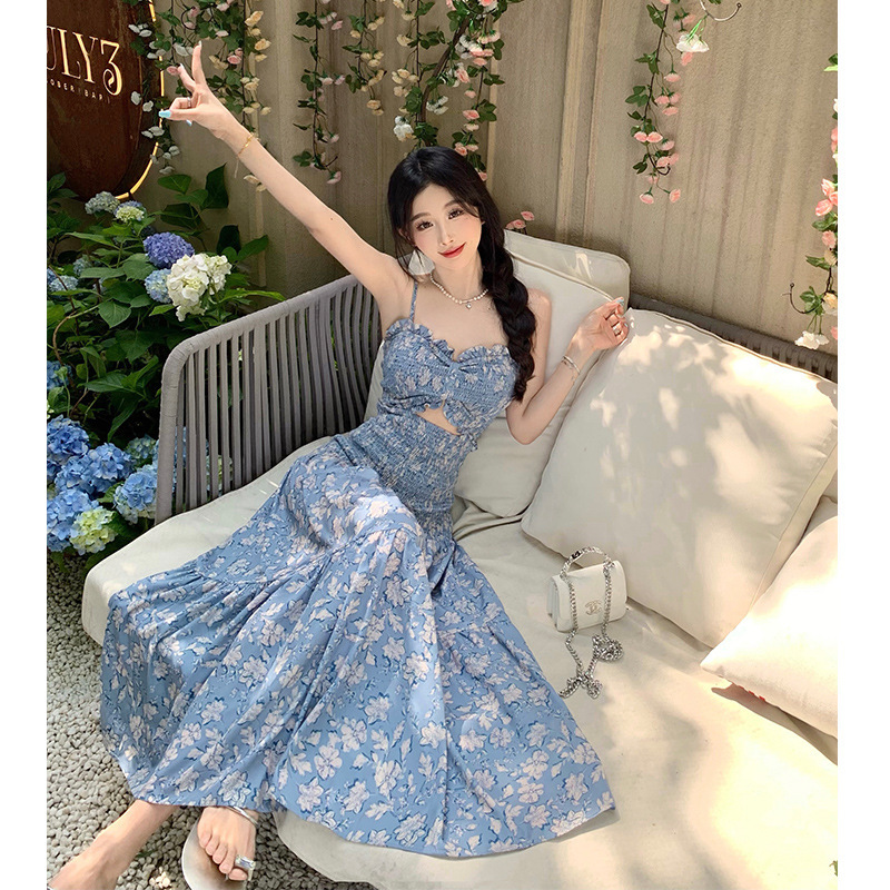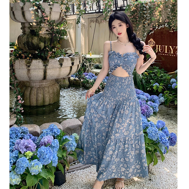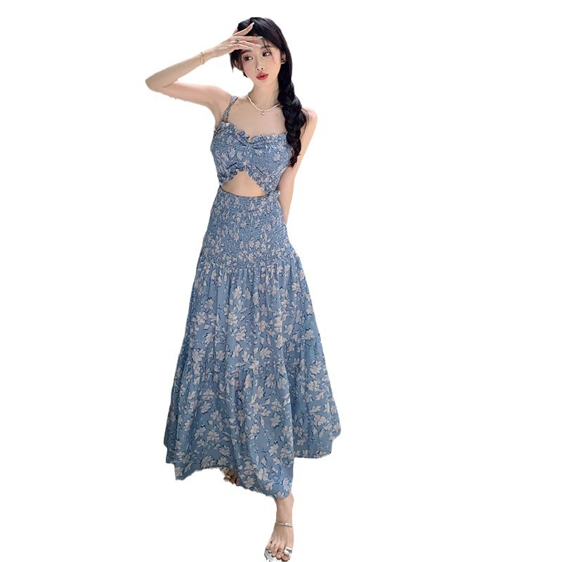 吊带连衣裙度假长裙镂空设计感收腰碎花打缆长款吊带裙