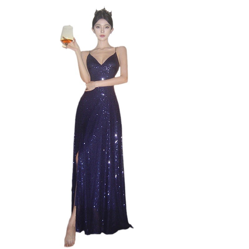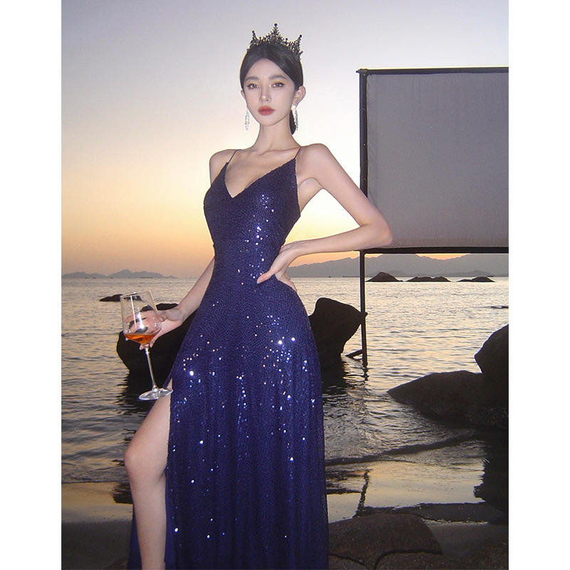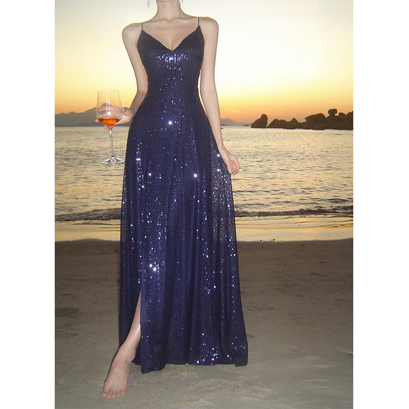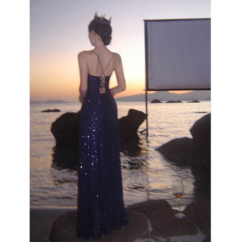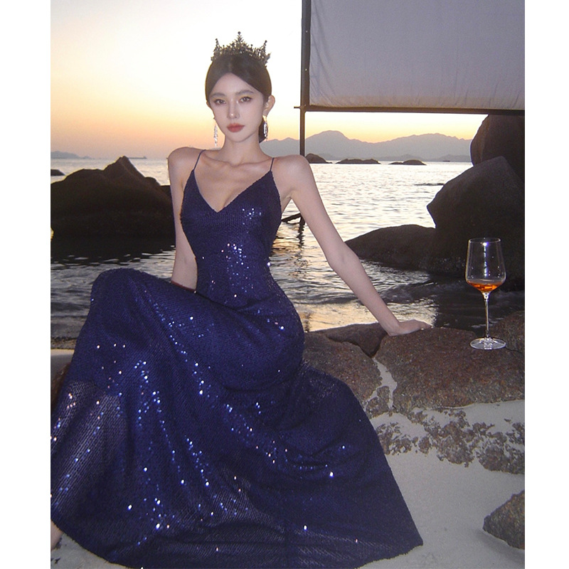 赫本风法式高级性感亮片拖地晚礼服女超长低胸V领吊带连衣裙