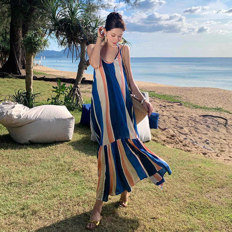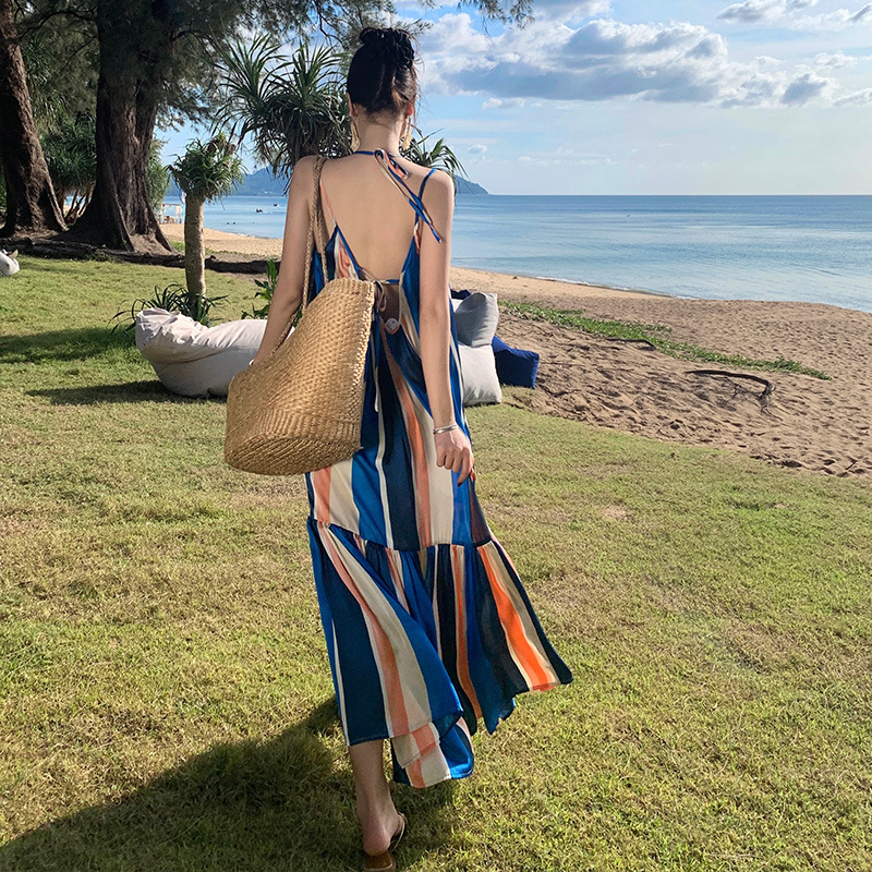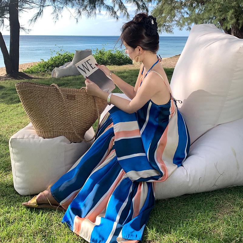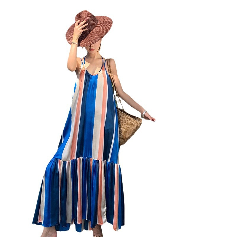 沙滩裙女夏吊带性感露背宽松显瘦海边度假超仙长款蓝色连衣裙