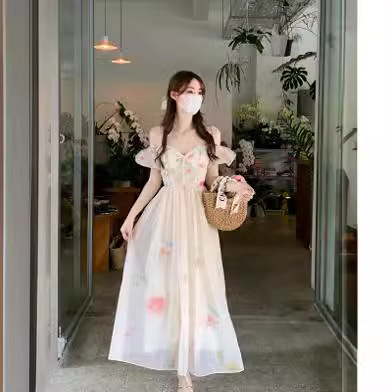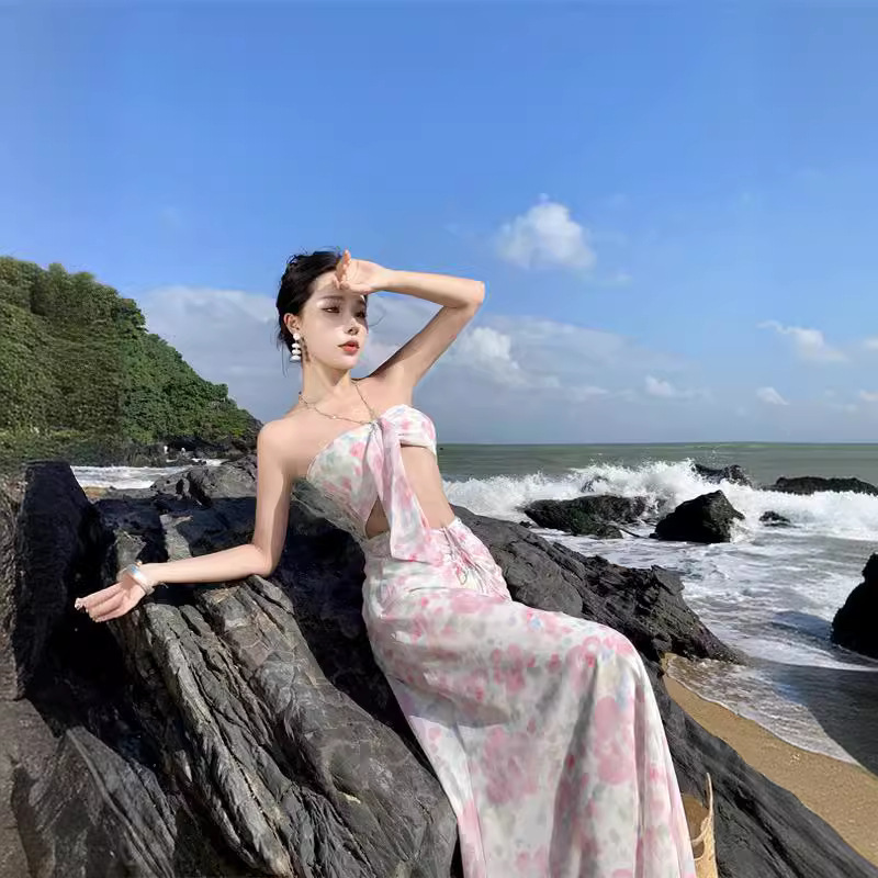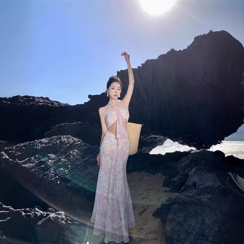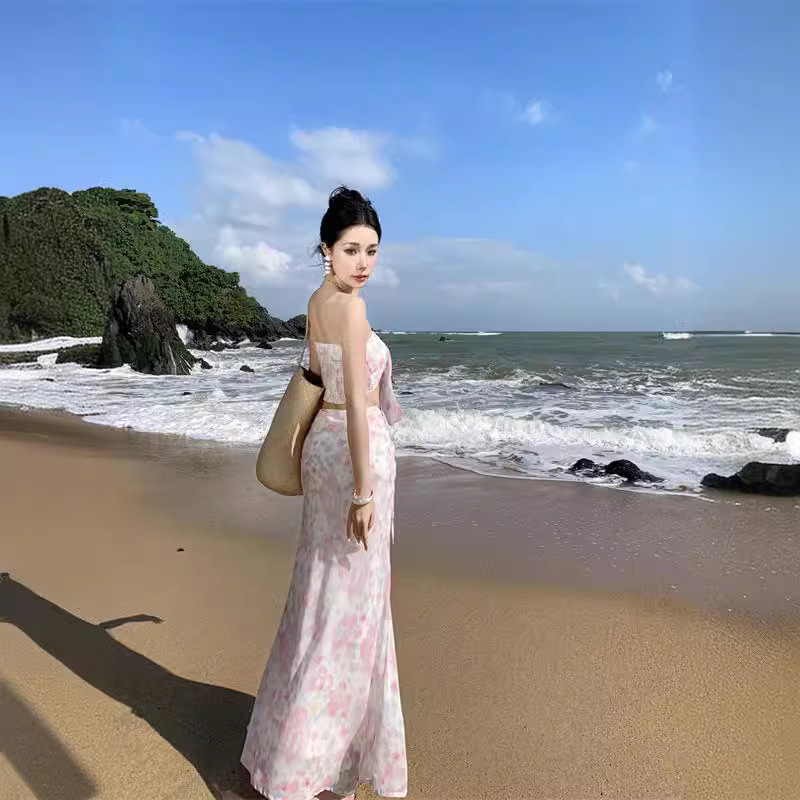 碎花挂脖抹胸吊带连衣裙粉色新款套装女夏二件套度假风长裙子
