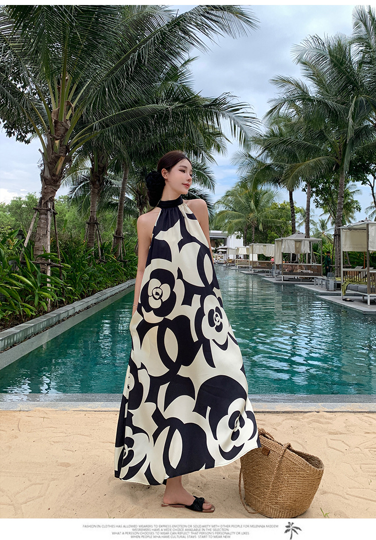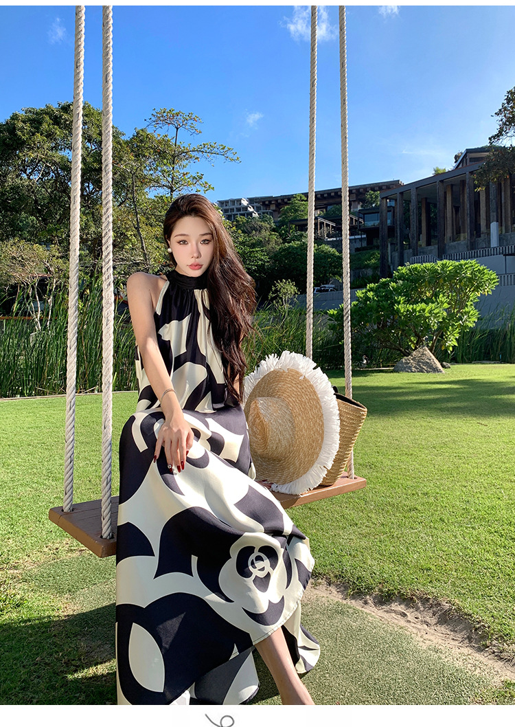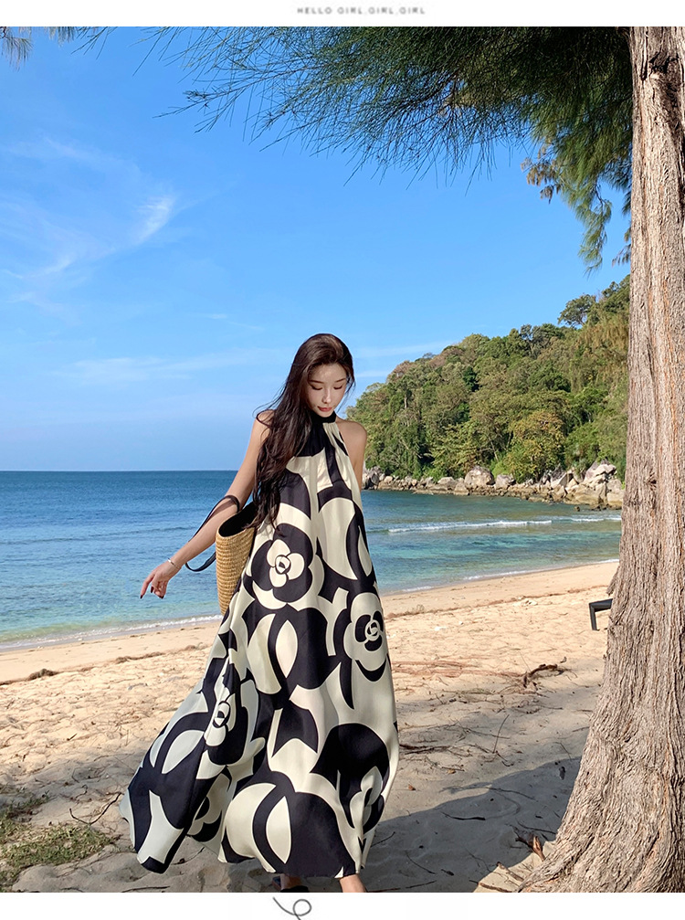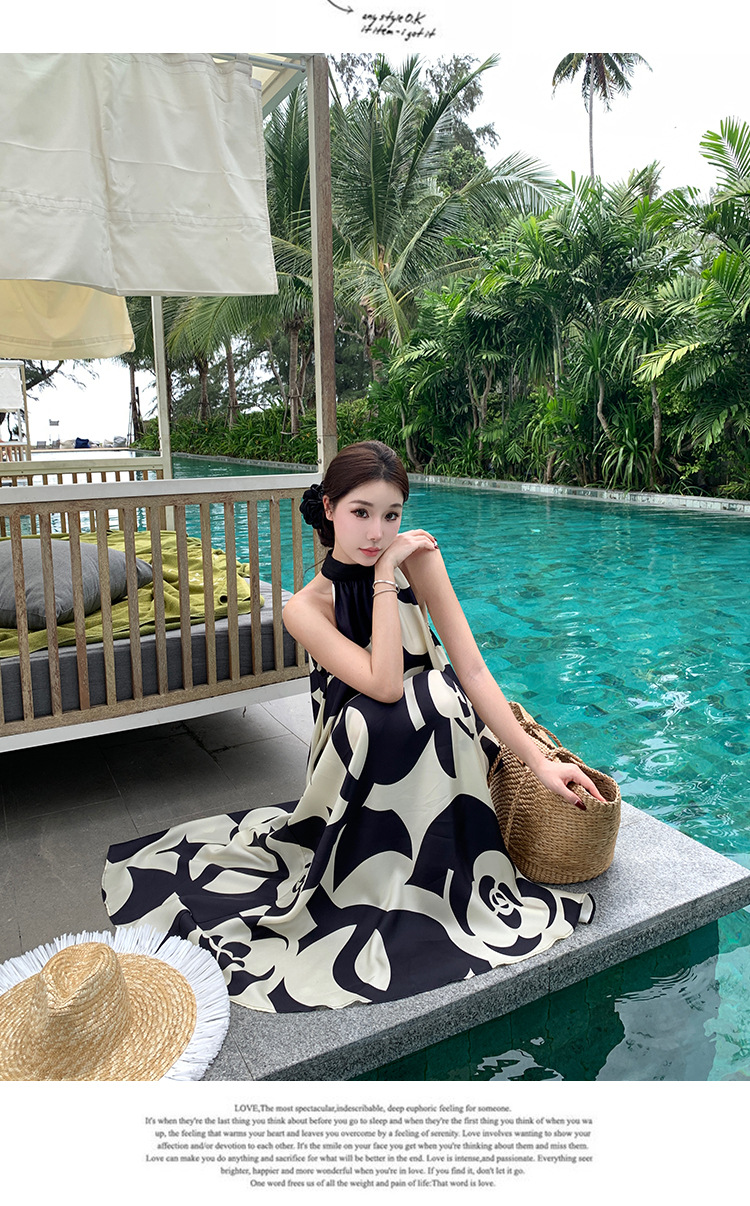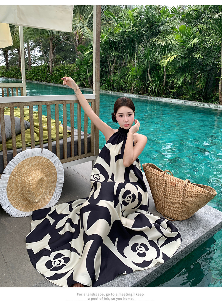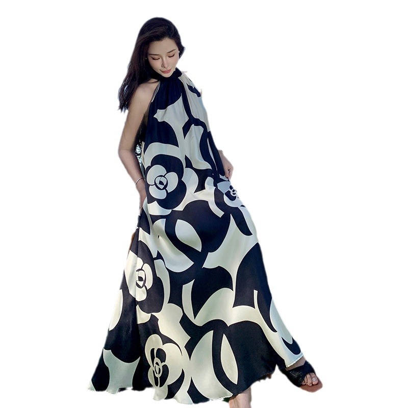 山茶花真丝挂脖连衣裙女夏季高级感宽松印花长裙裙子