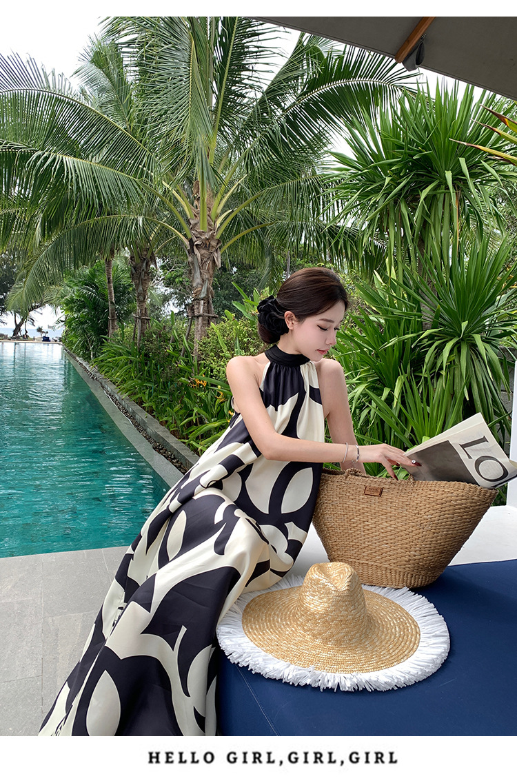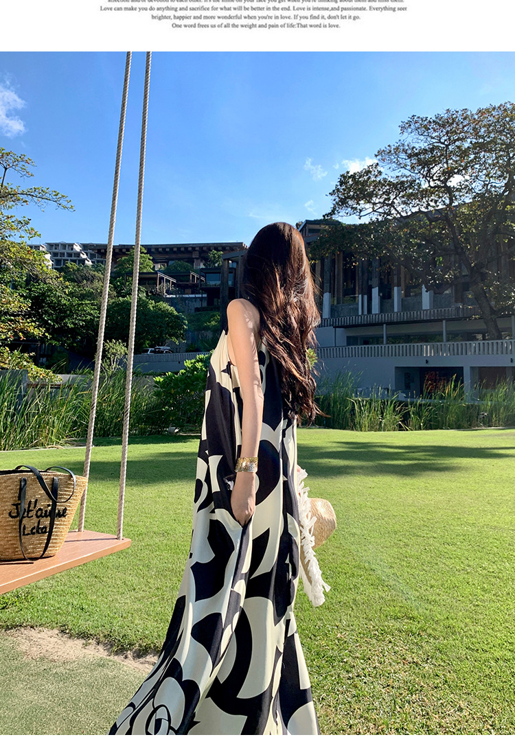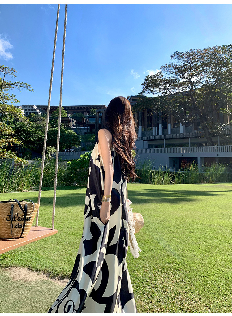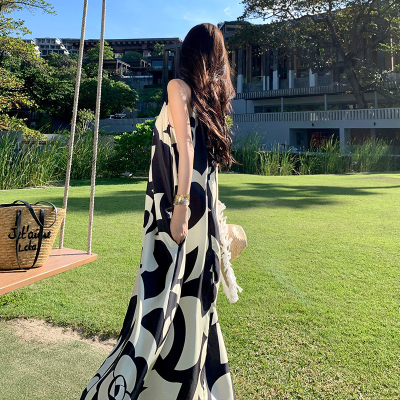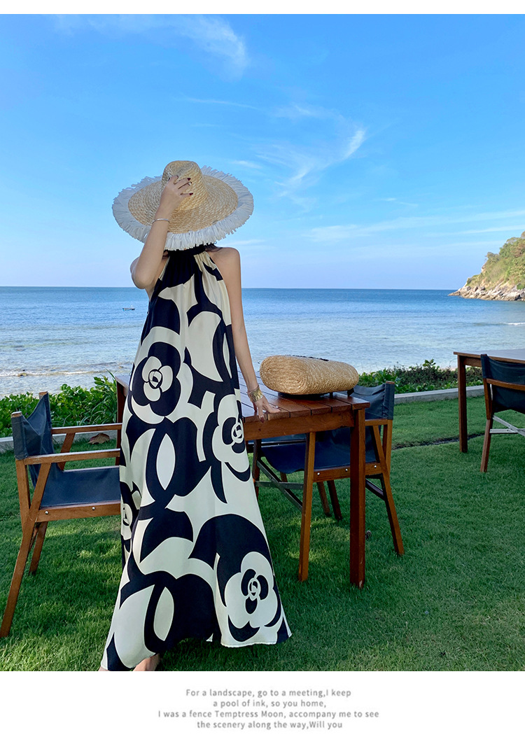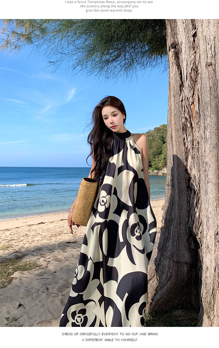 山茶花真丝挂脖连衣裙女夏季高级感宽松印花长裙裙子
