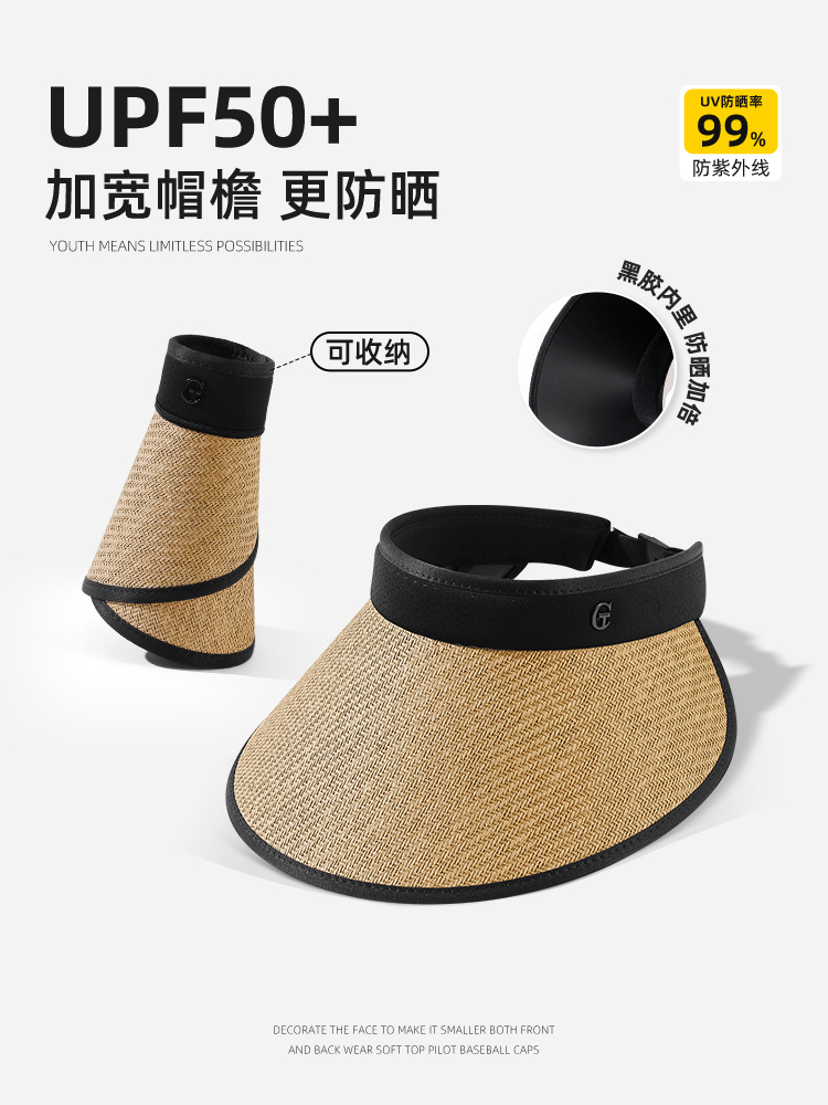 防晒帽子女夏季拉菲草空顶帽遮阳发箍大檐户外沙滩太阳帽防紫外线