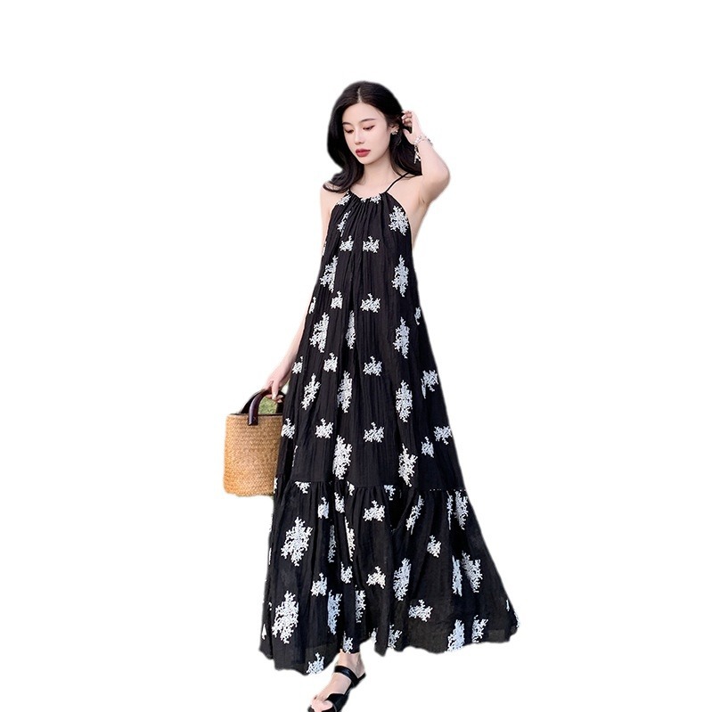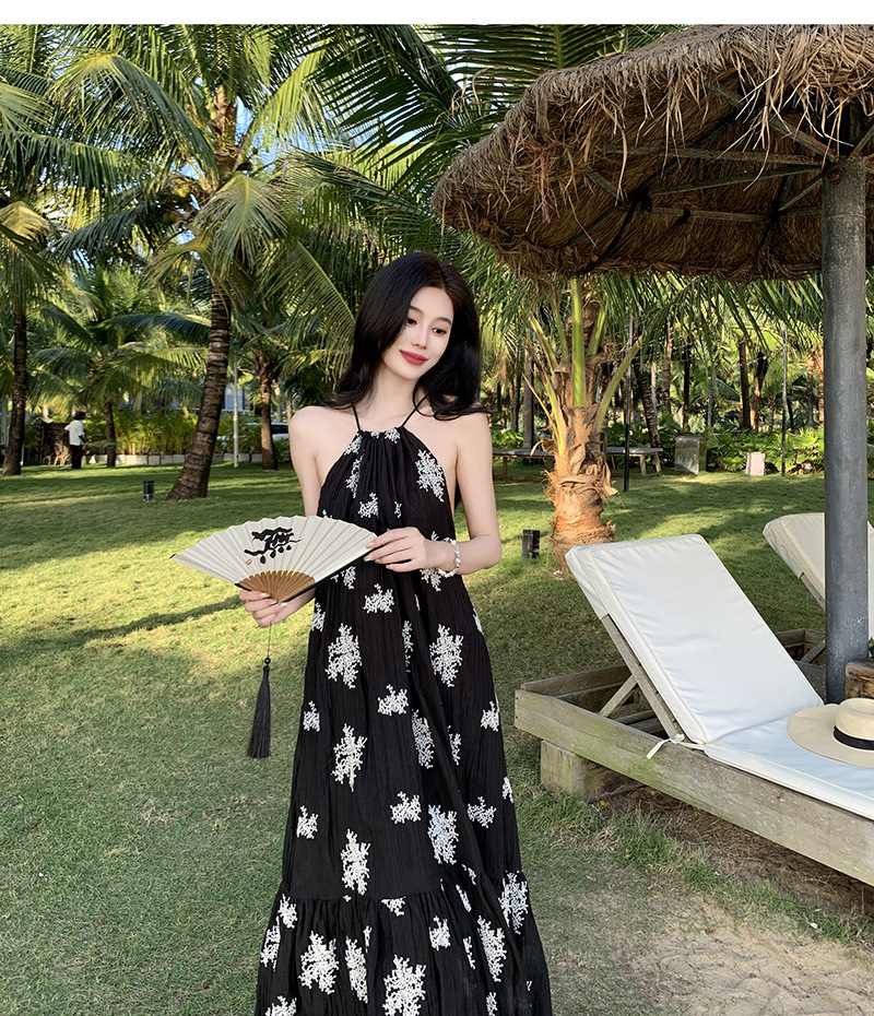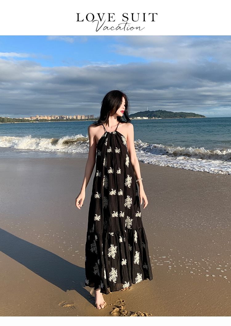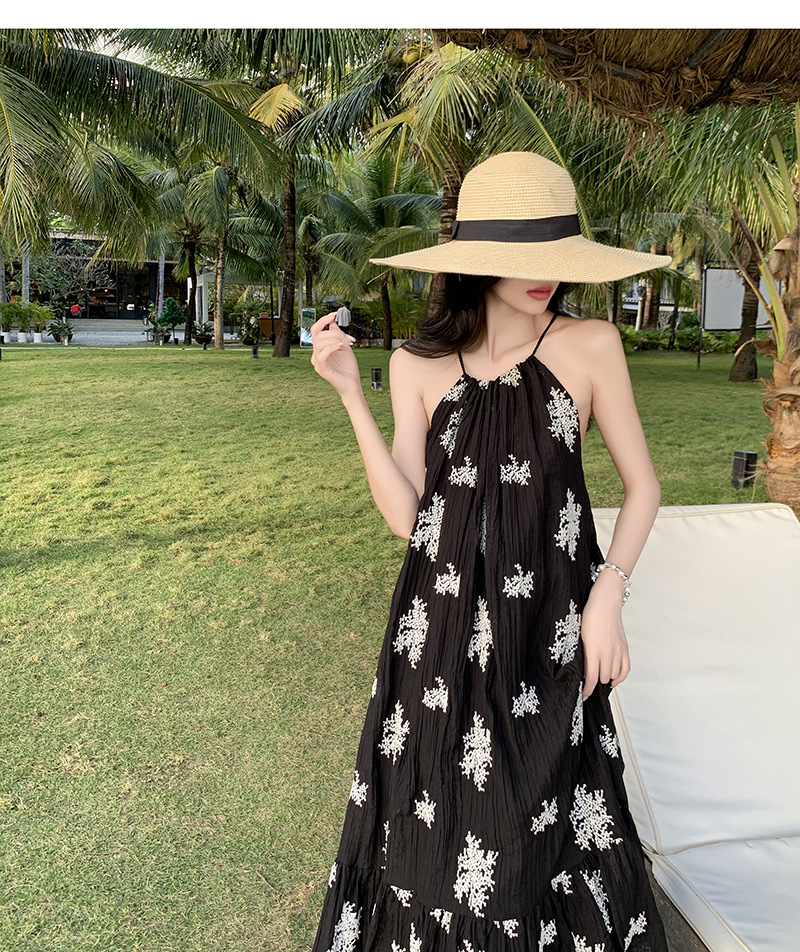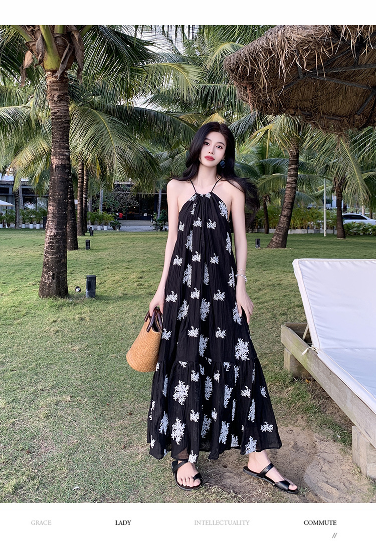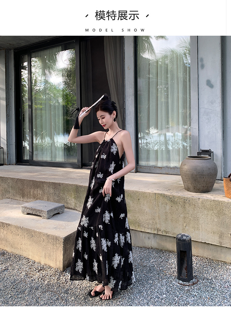 绣花吊带长裙无袖挂脖大摆度假连衣裙