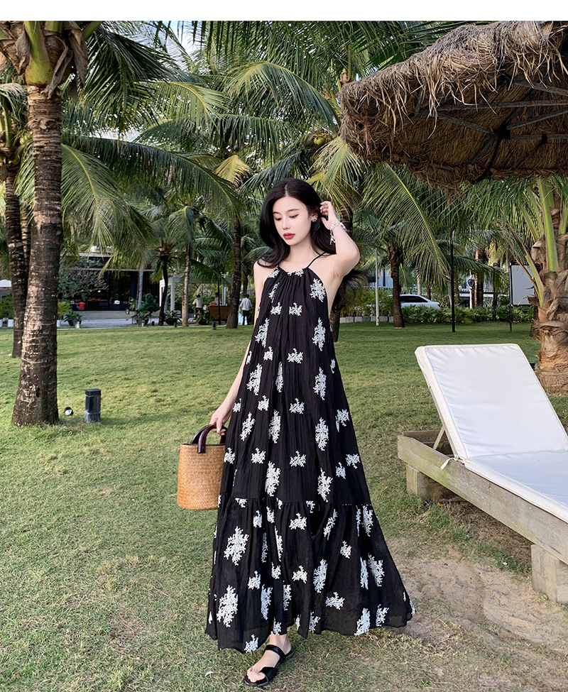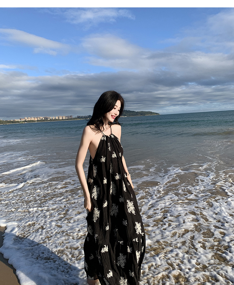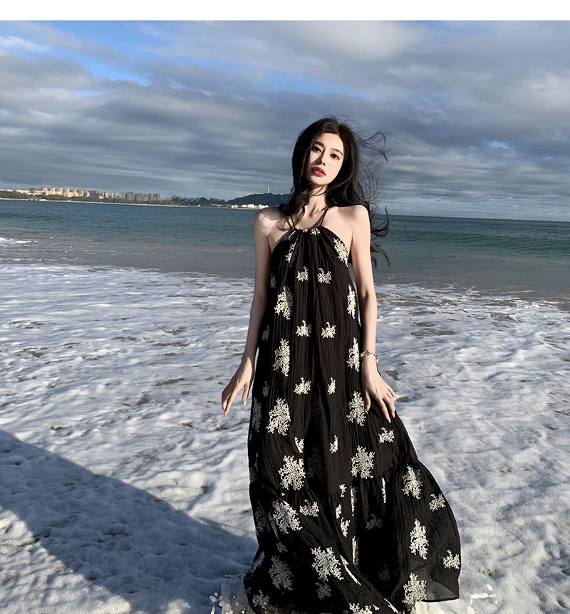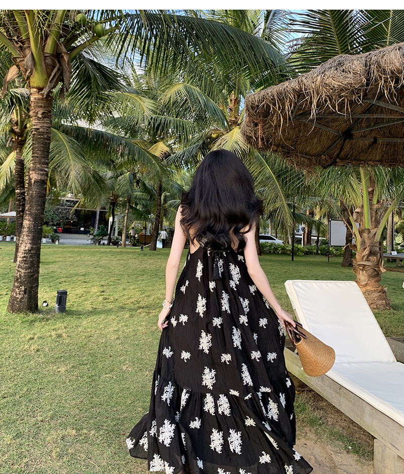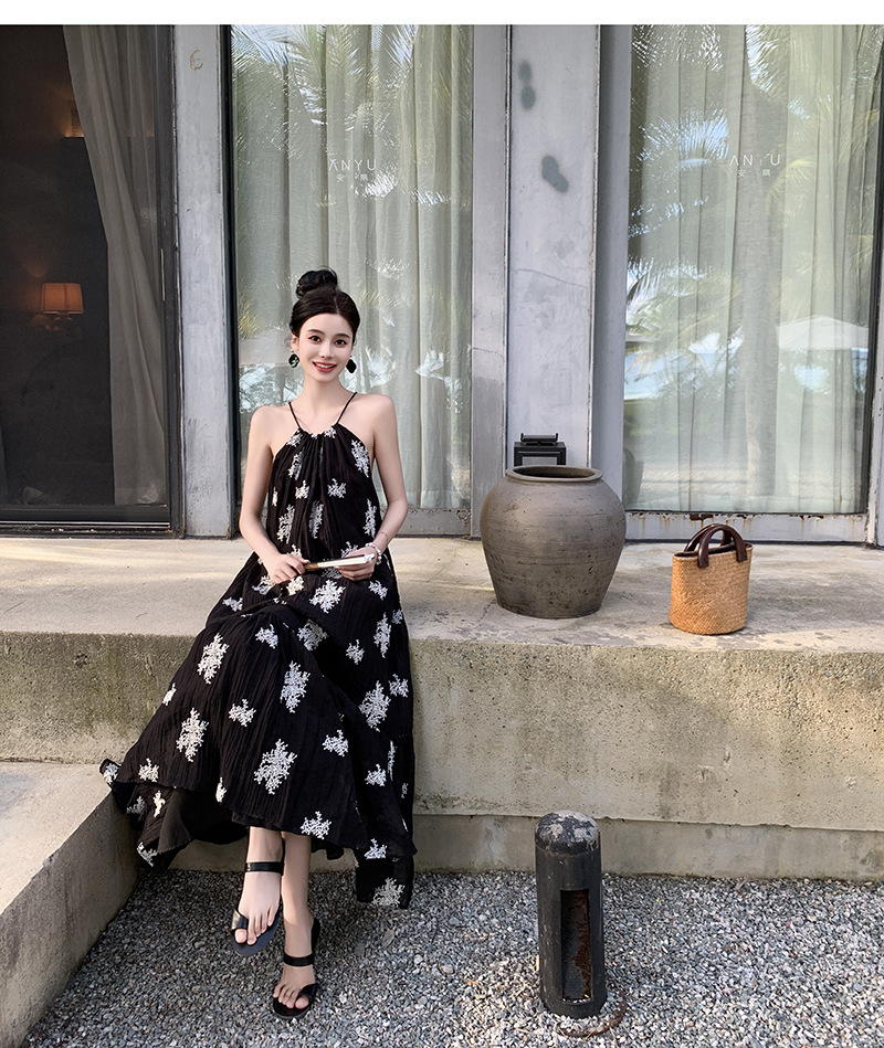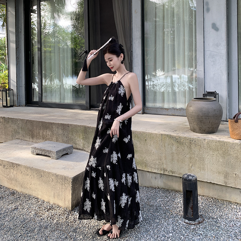 绣花吊带长裙无袖挂脖大摆度假连衣裙