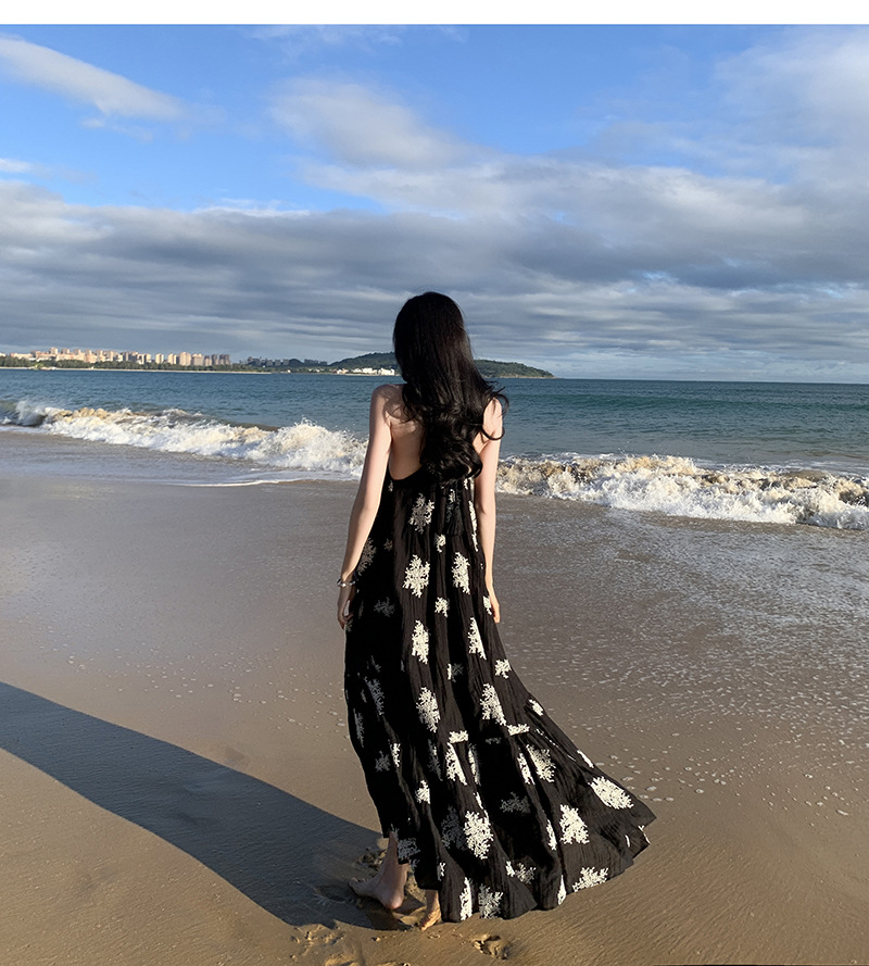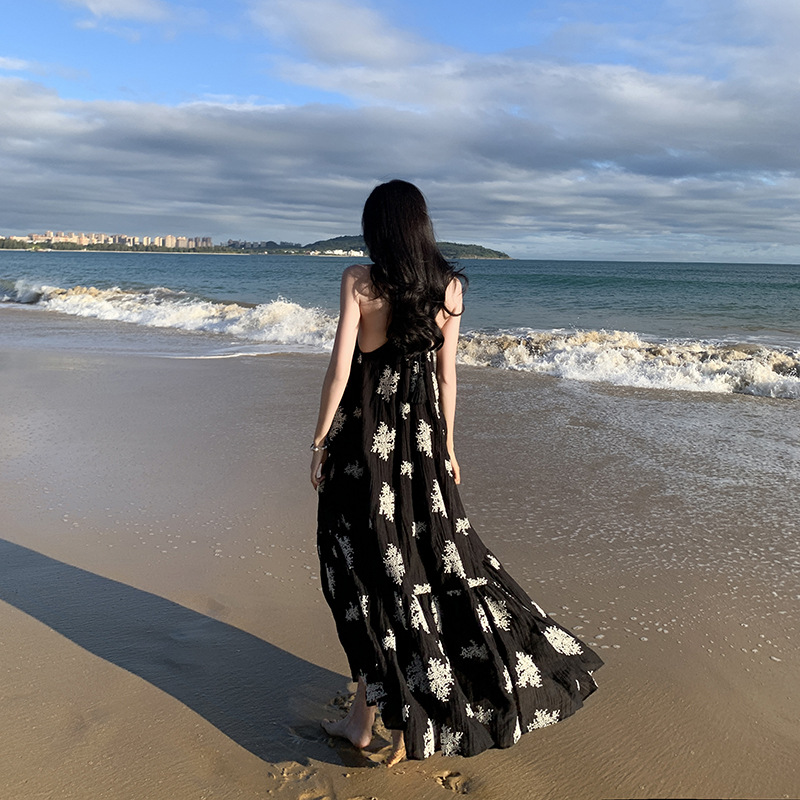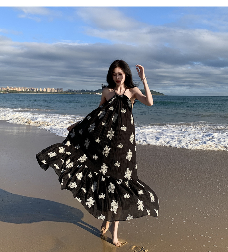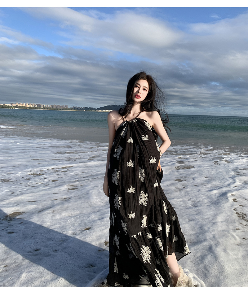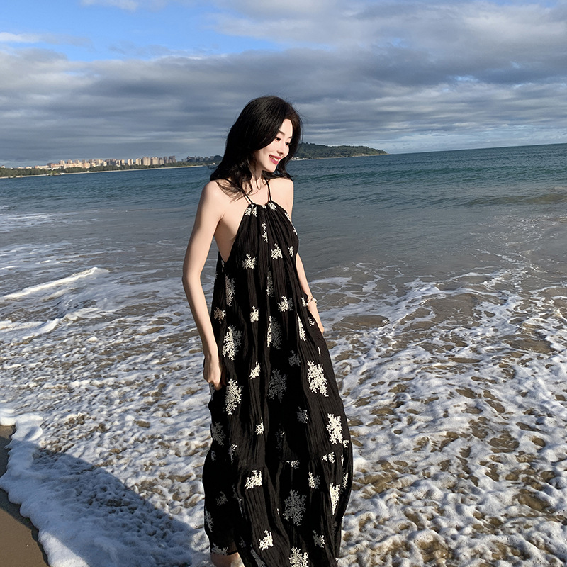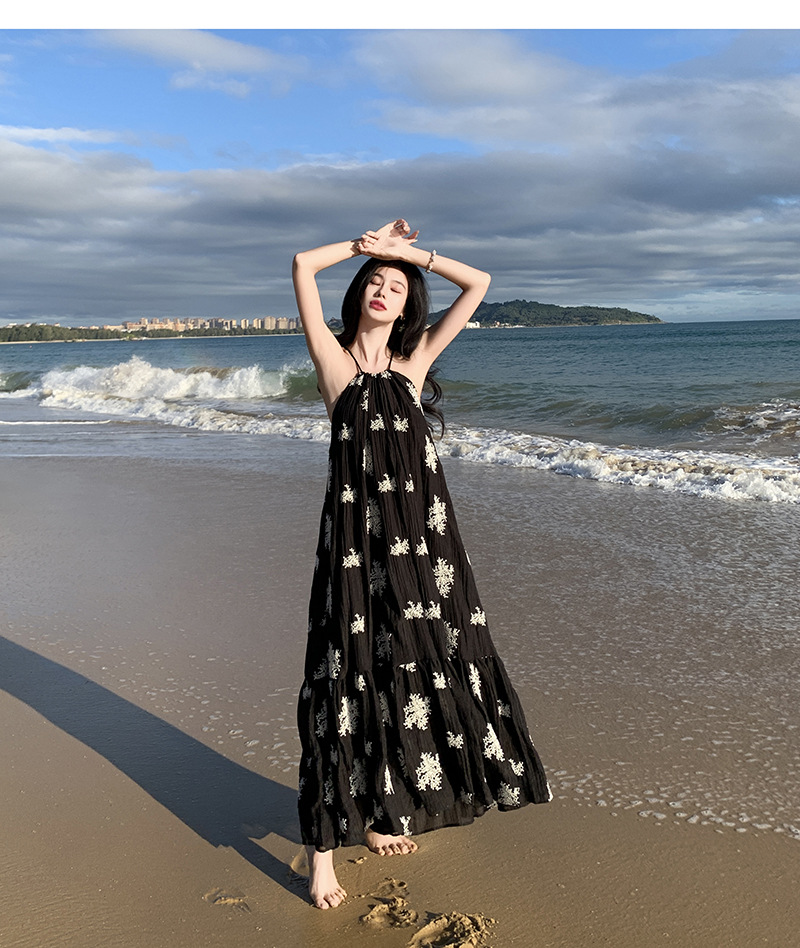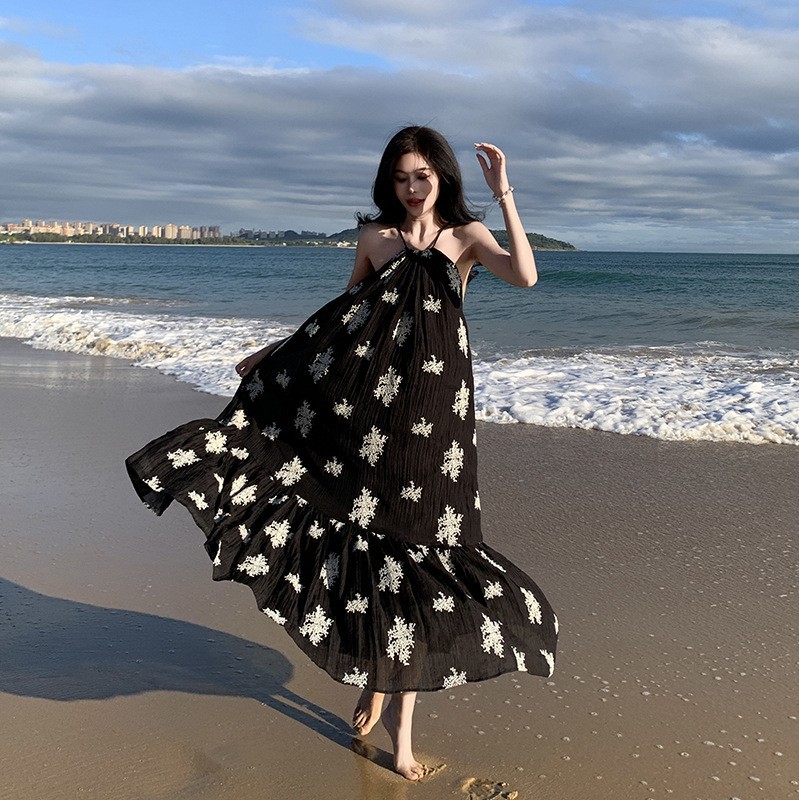 绣花吊带长裙无袖挂脖大摆度假连衣裙