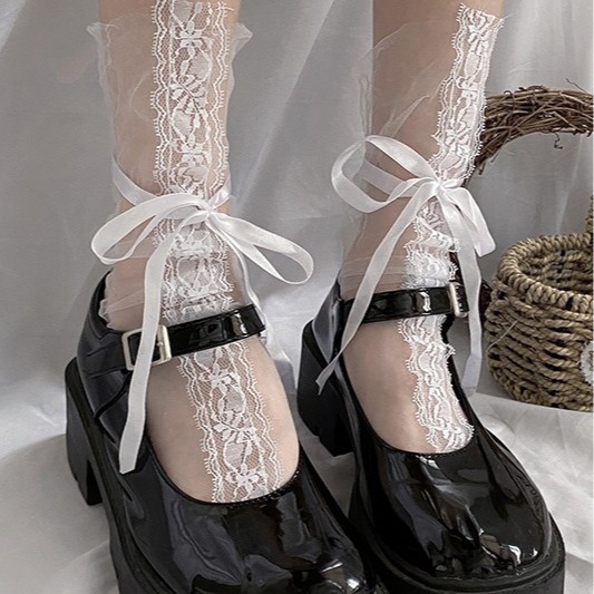 网纱堆堆袜夏季网纱薄玻璃丝女韩国中间蕾丝短袜日系绑带蝴蝶结袜
