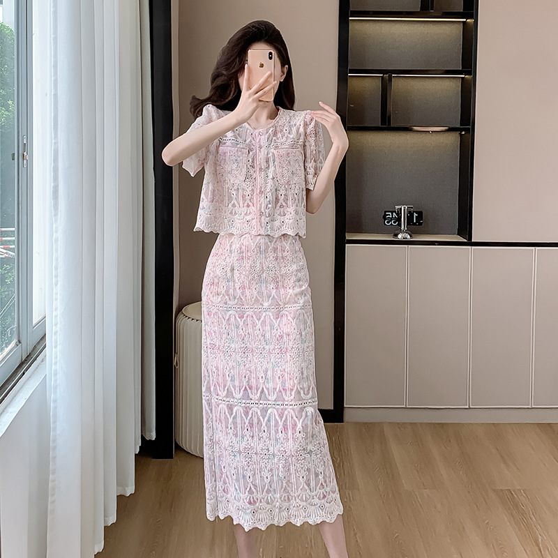 夏季新款韩版时尚甜美减龄气质蕾丝绣花洋气长裙两件套套装裙