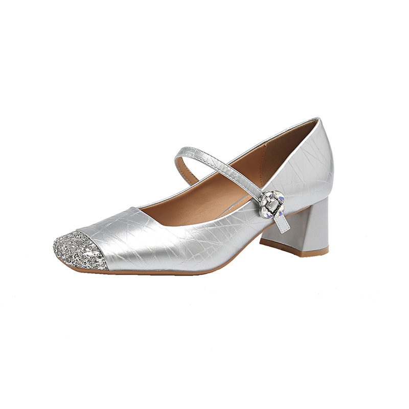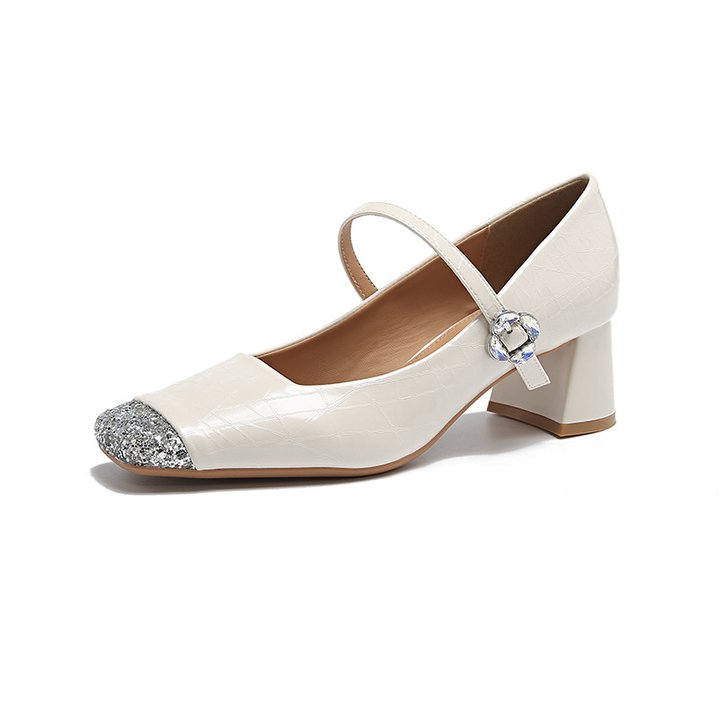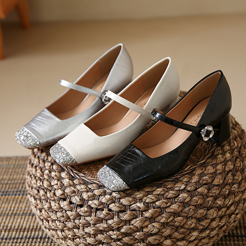 方头粗跟单鞋法式亮钻拼接小香风浅口搭扣一字带单鞋玛丽珍小皮鞋