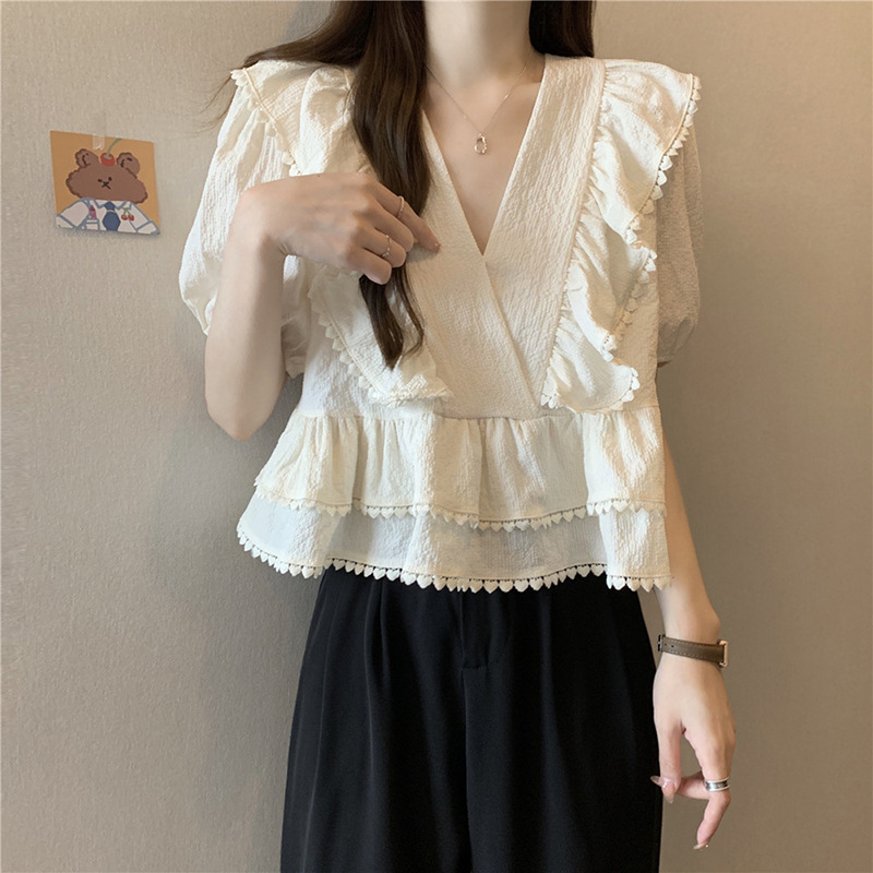 夏季法式荷叶边短袖衬衫女大码胖mm显瘦宽松气质v领蕾丝雪纺上衣