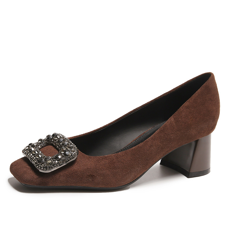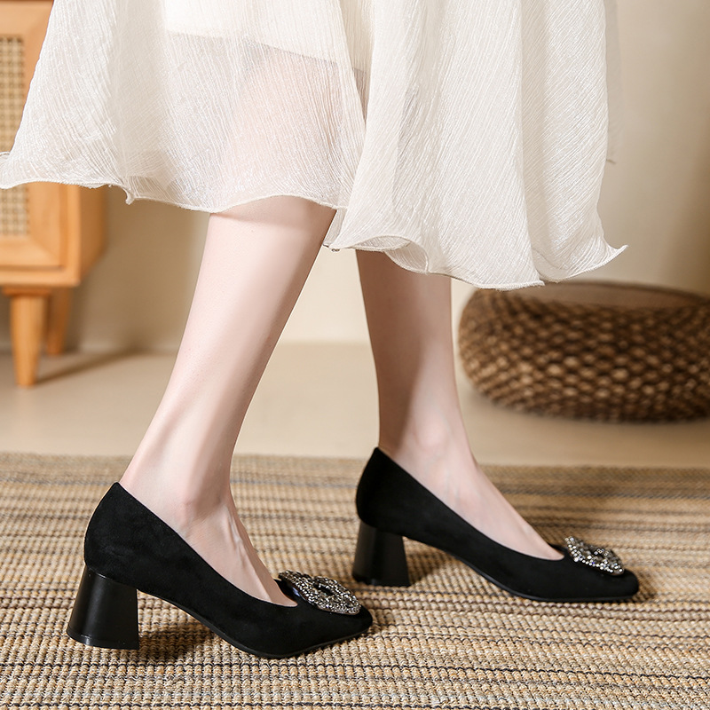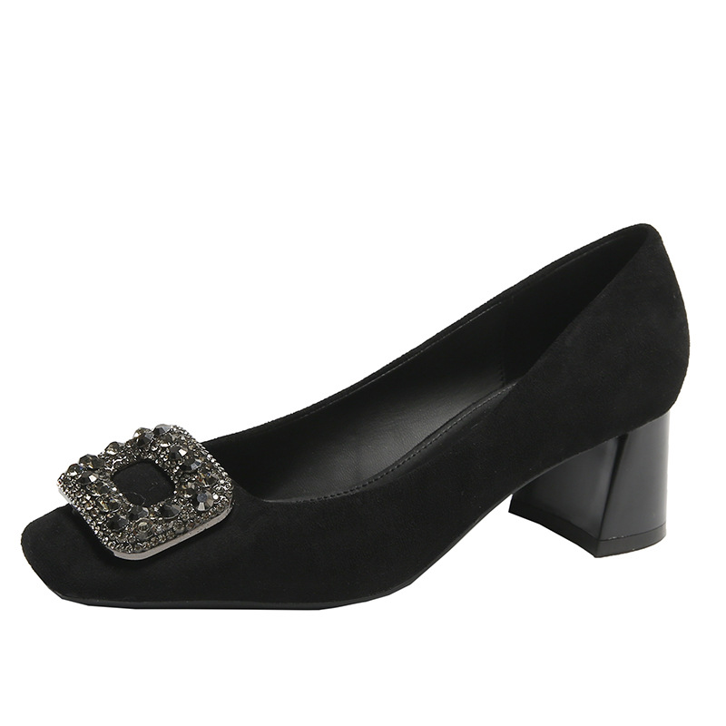 法式浅口粗跟高跟鞋年新款方头水钻小香风女鞋一脚蹬通勤单鞋