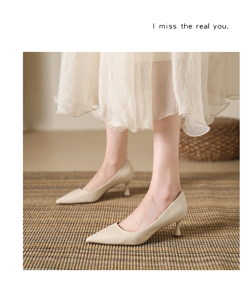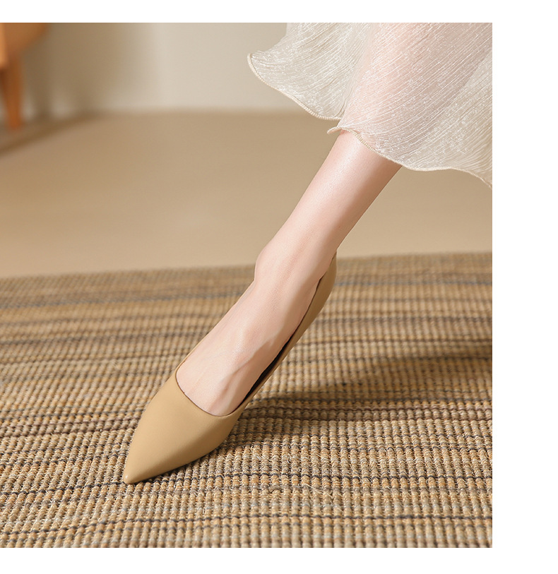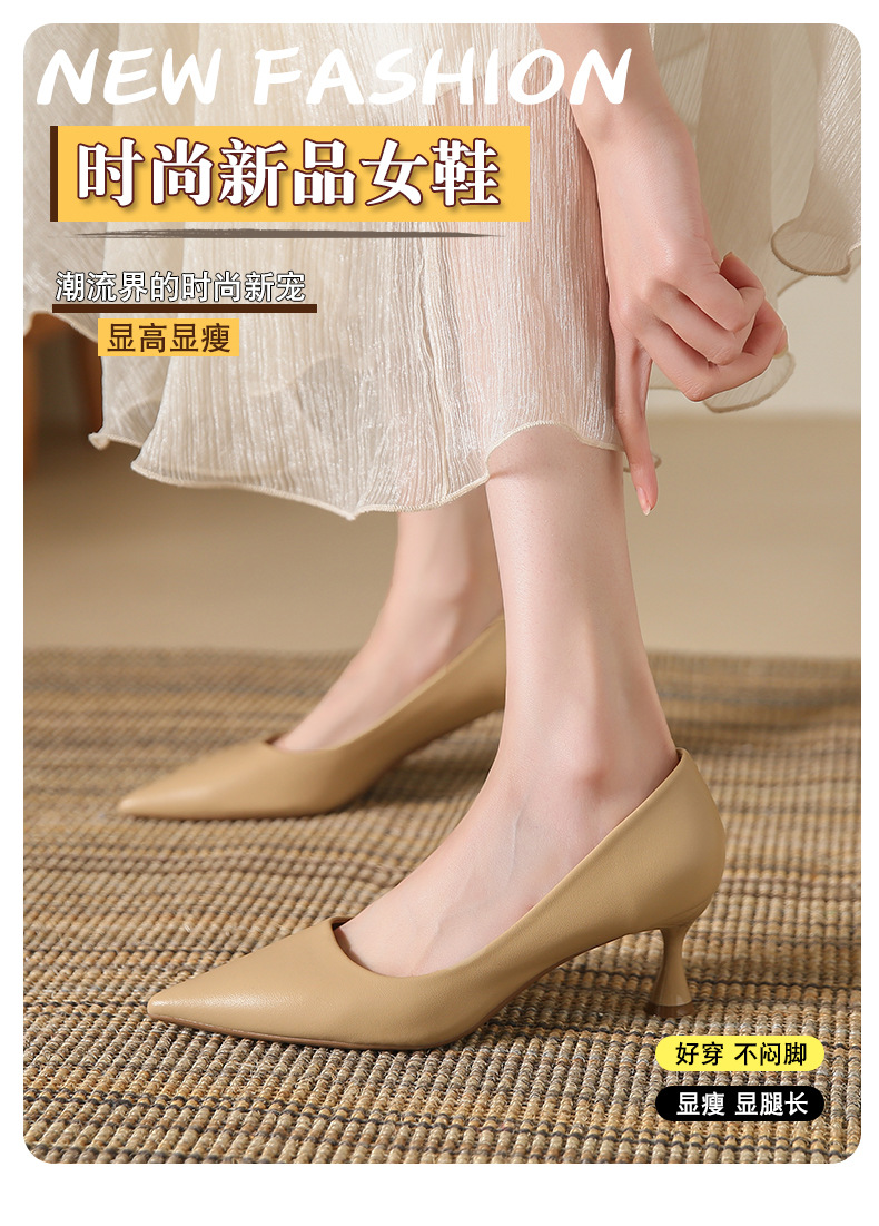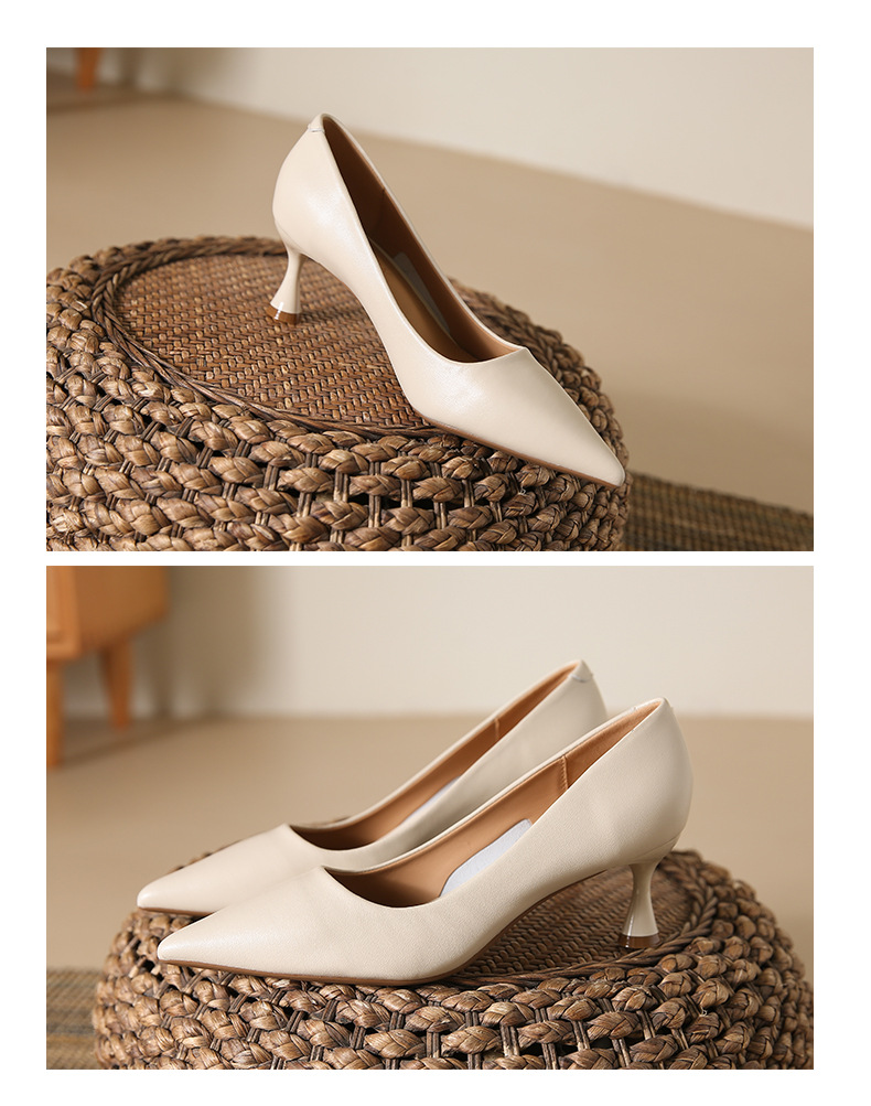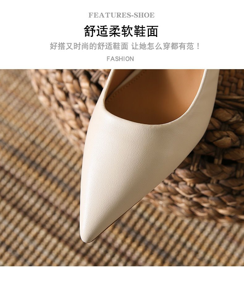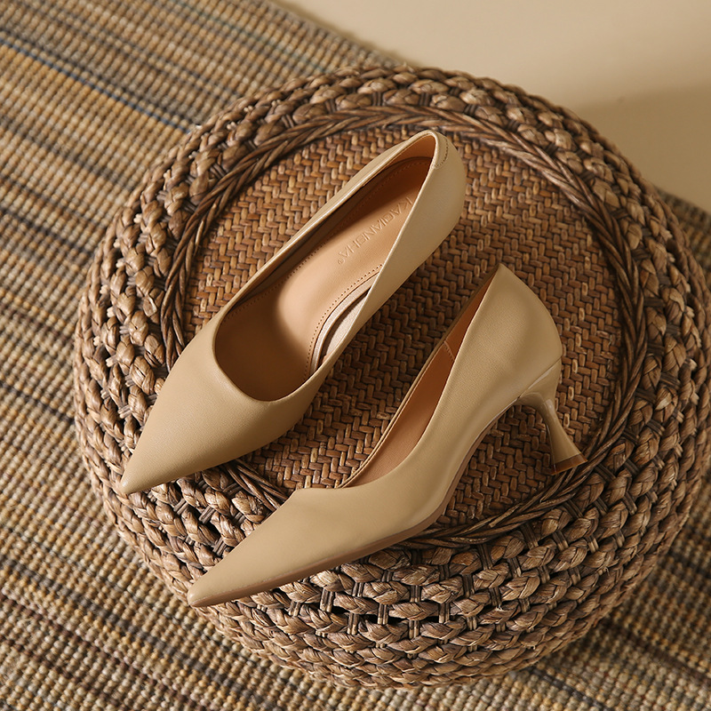 高跟鞋羊皮浅口细跟单鞋尖头女鞋通勤裸色女高跟低帮真皮婚鞋