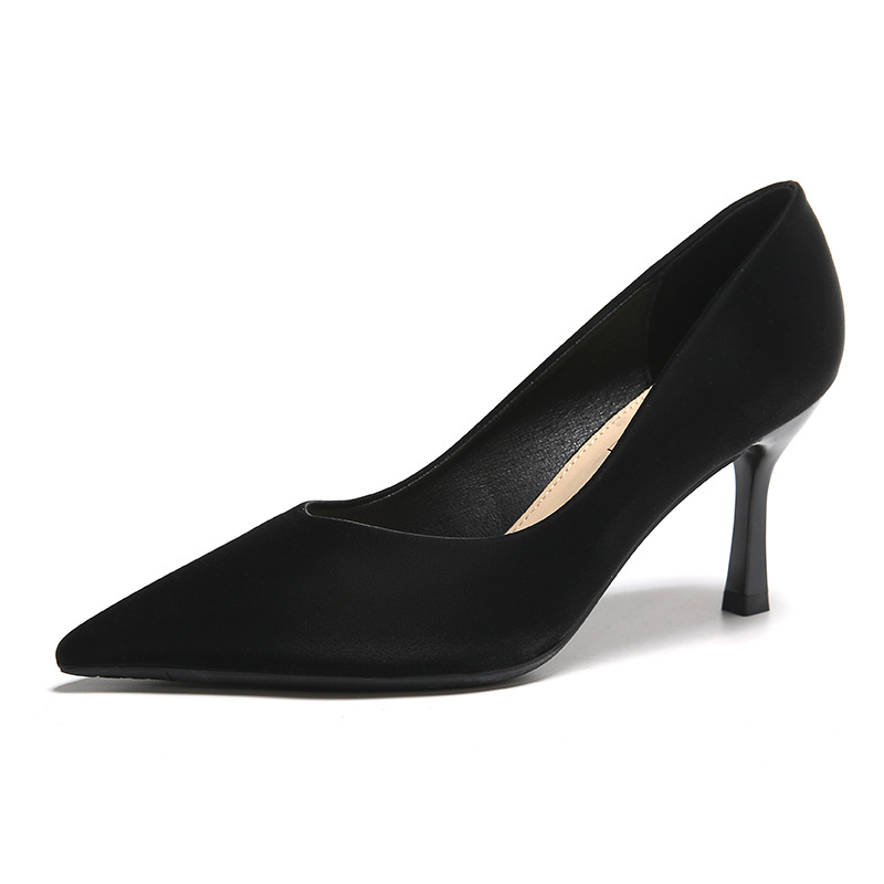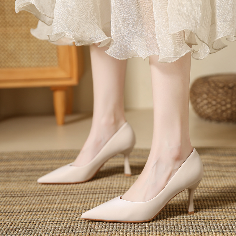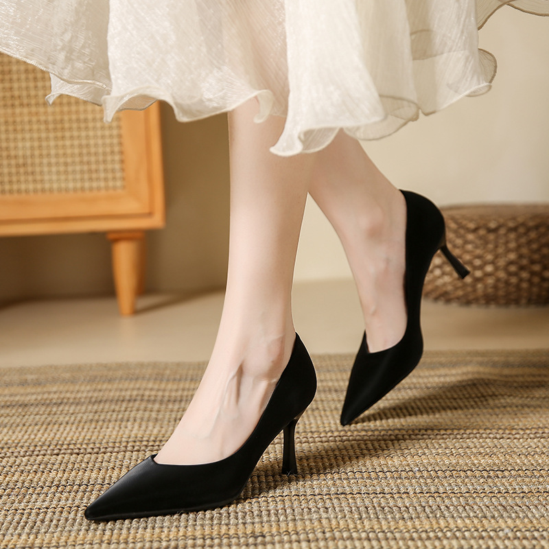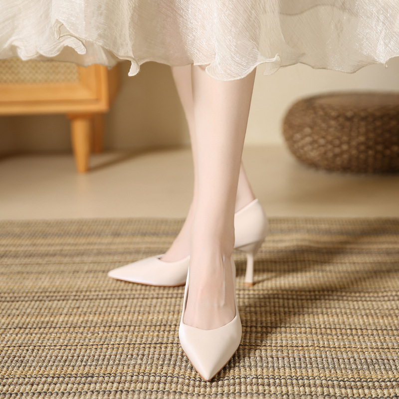 850-99【羊皮】高级绸缎职业通勤高跟鞋女秋冬款裸色尖头细跟女鞋