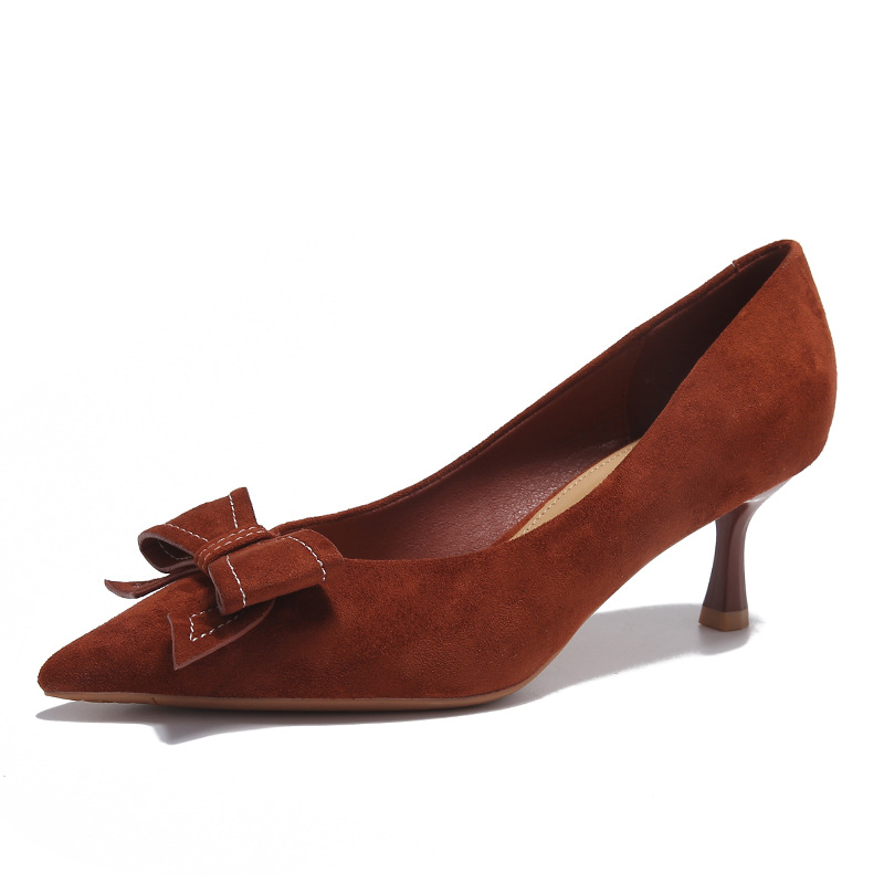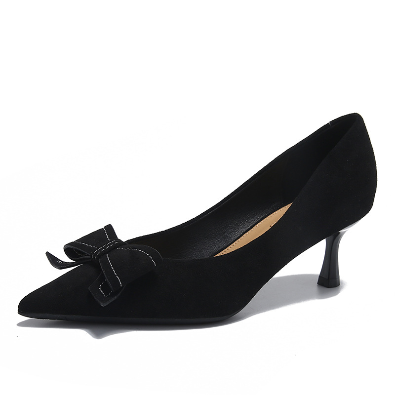 878-3【羊皮】蝴蝶结细跟高跟鞋女秋冬季新款软皮不累脚通勤单鞋
