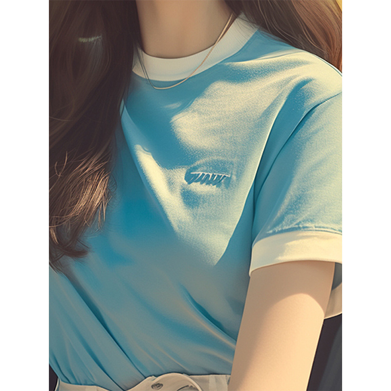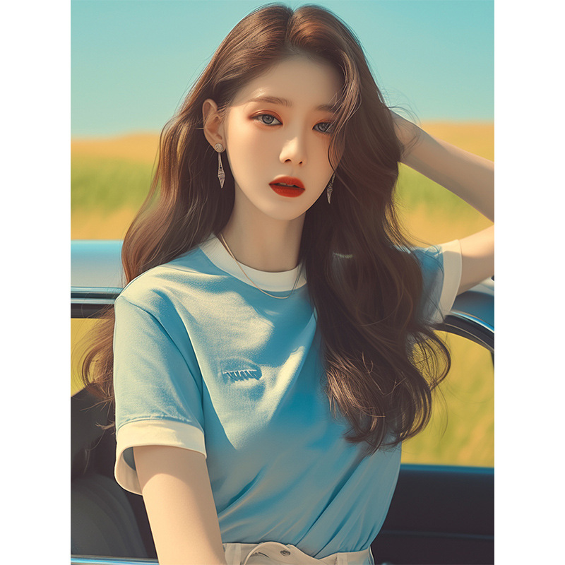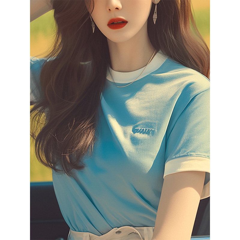 新款爆款绝美时髦时尚洋气小上衣小众独特别致蓝色短袖t恤女