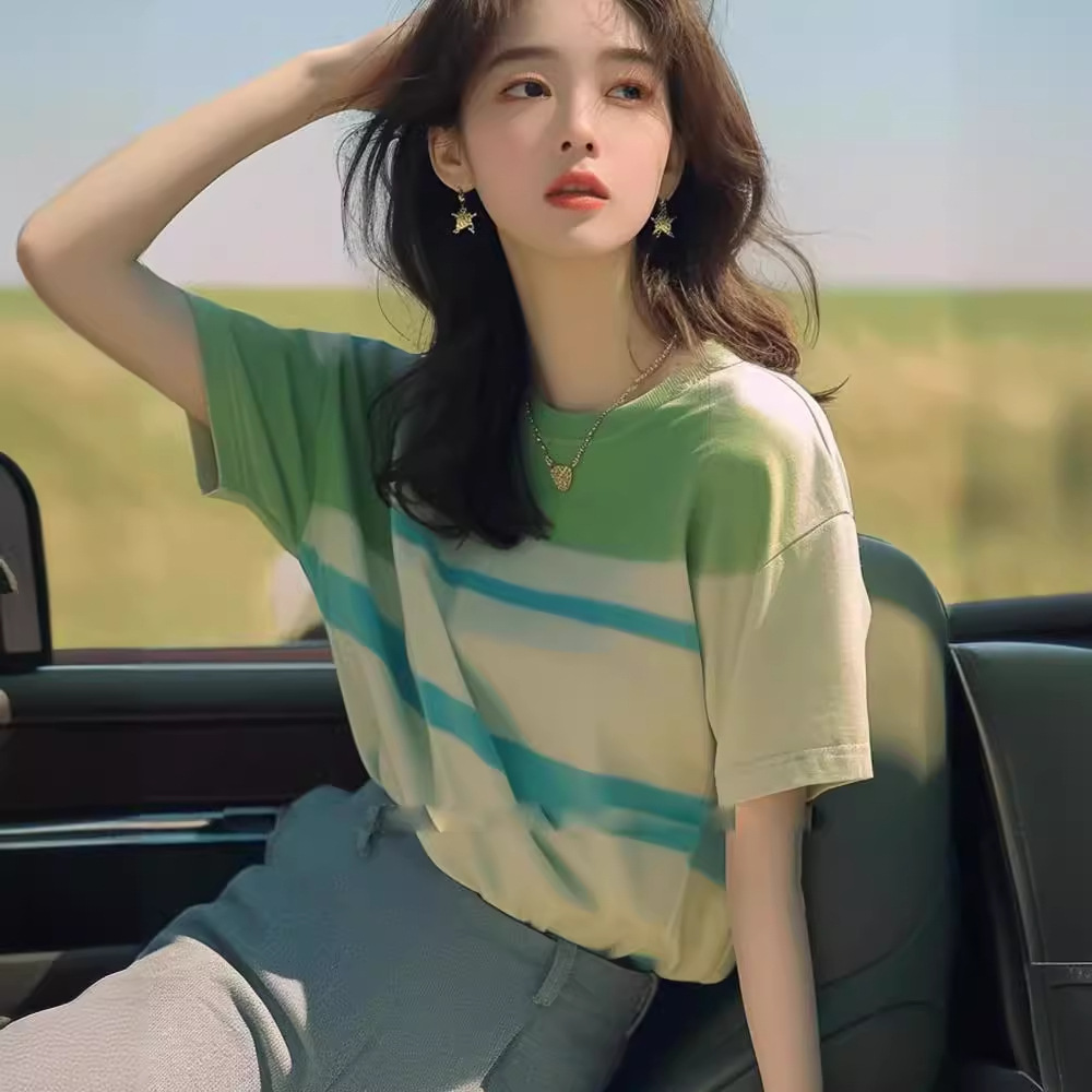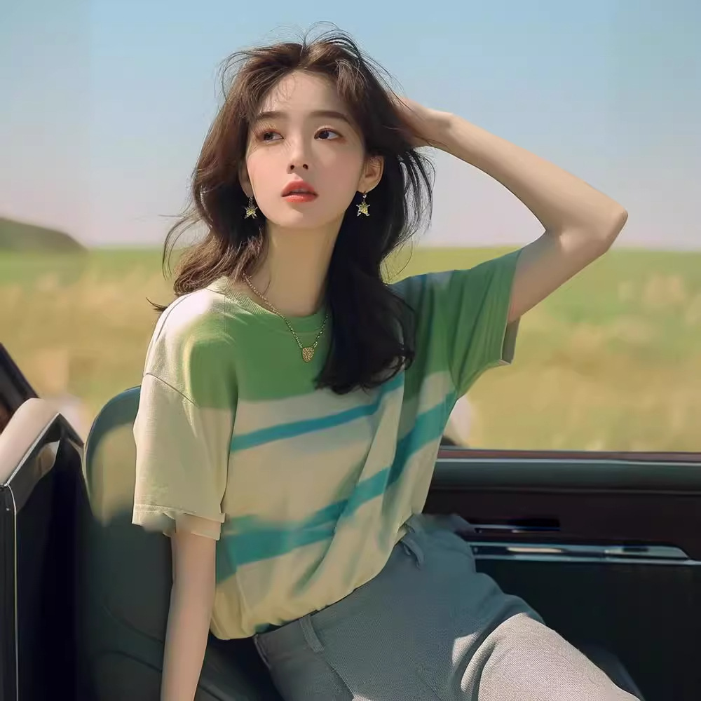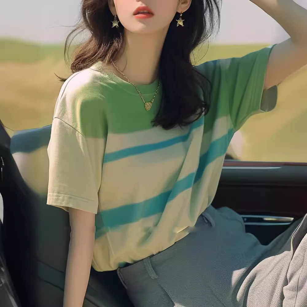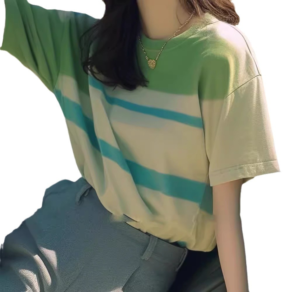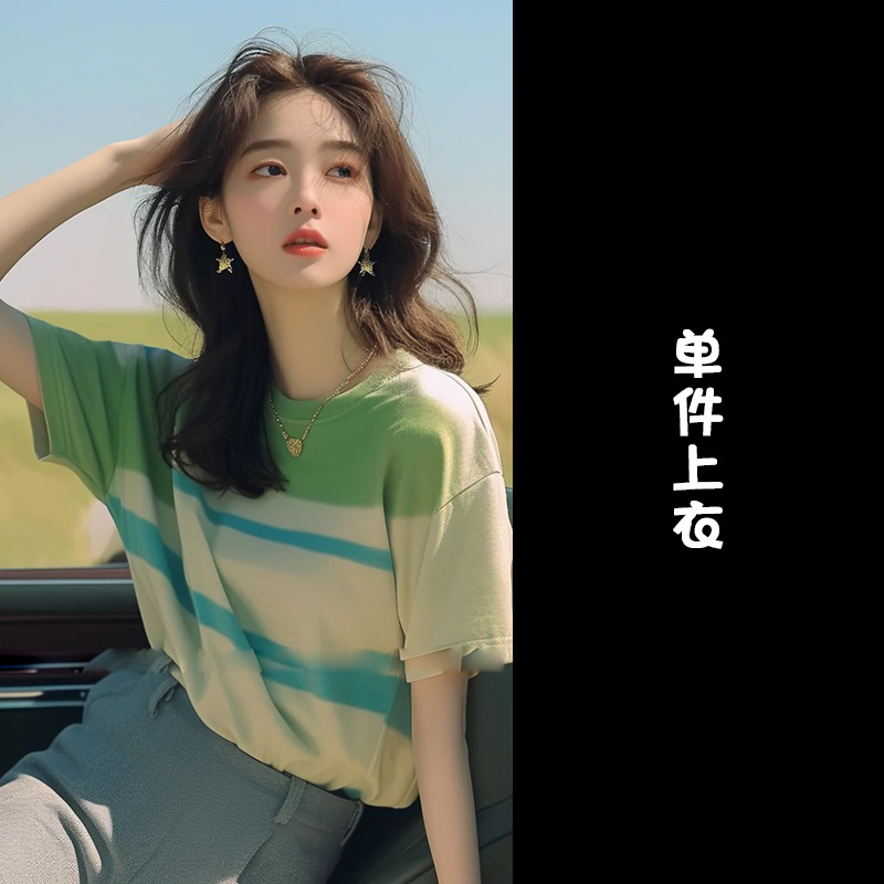 洋气独特超好看小众设计别致上衣宽松百搭绿色条纹短袖t恤女夏季