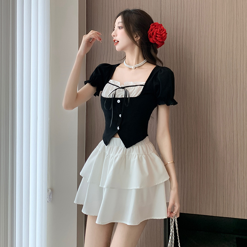 时尚休闲套装纯欲芭蕾风方领T恤短裙辣妹修身撞色两件套装甜辣
