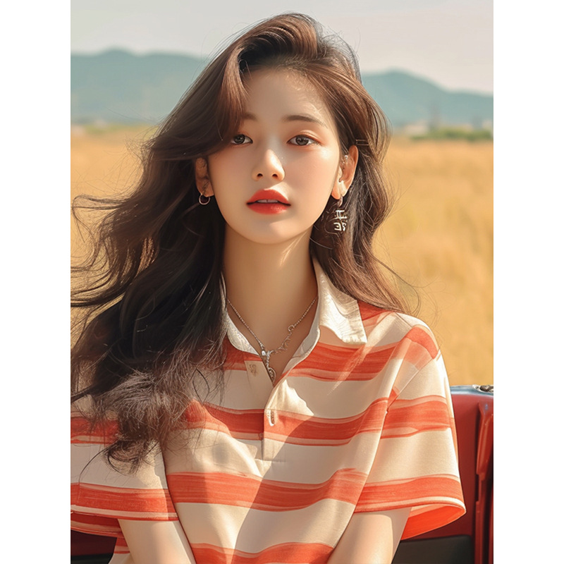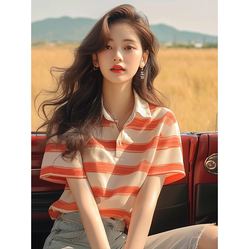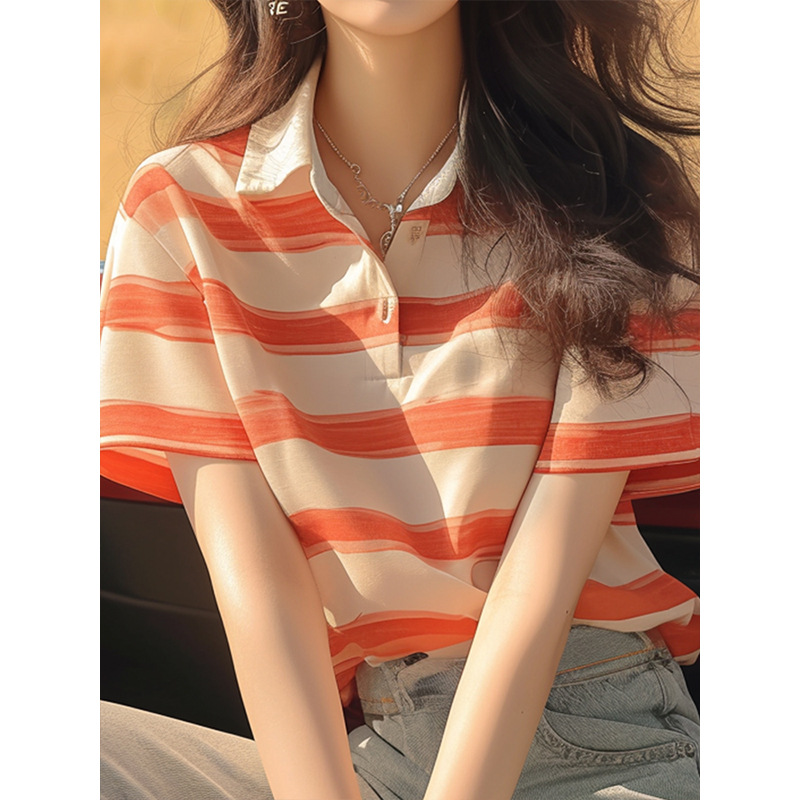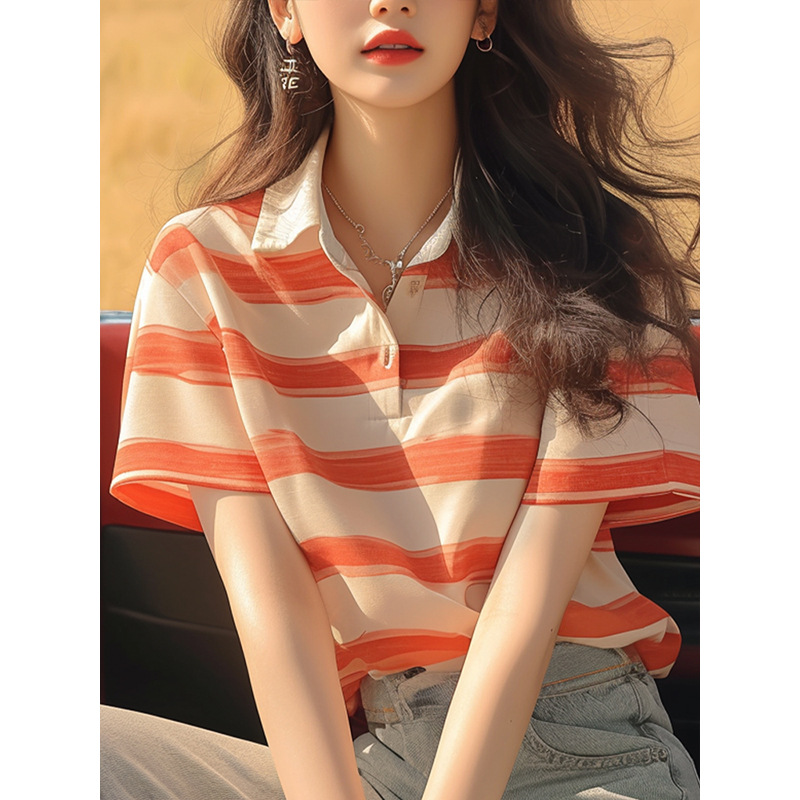学院风短袖polo领上衣独特别致绝美小众设计感橙色条纹t恤女夏季