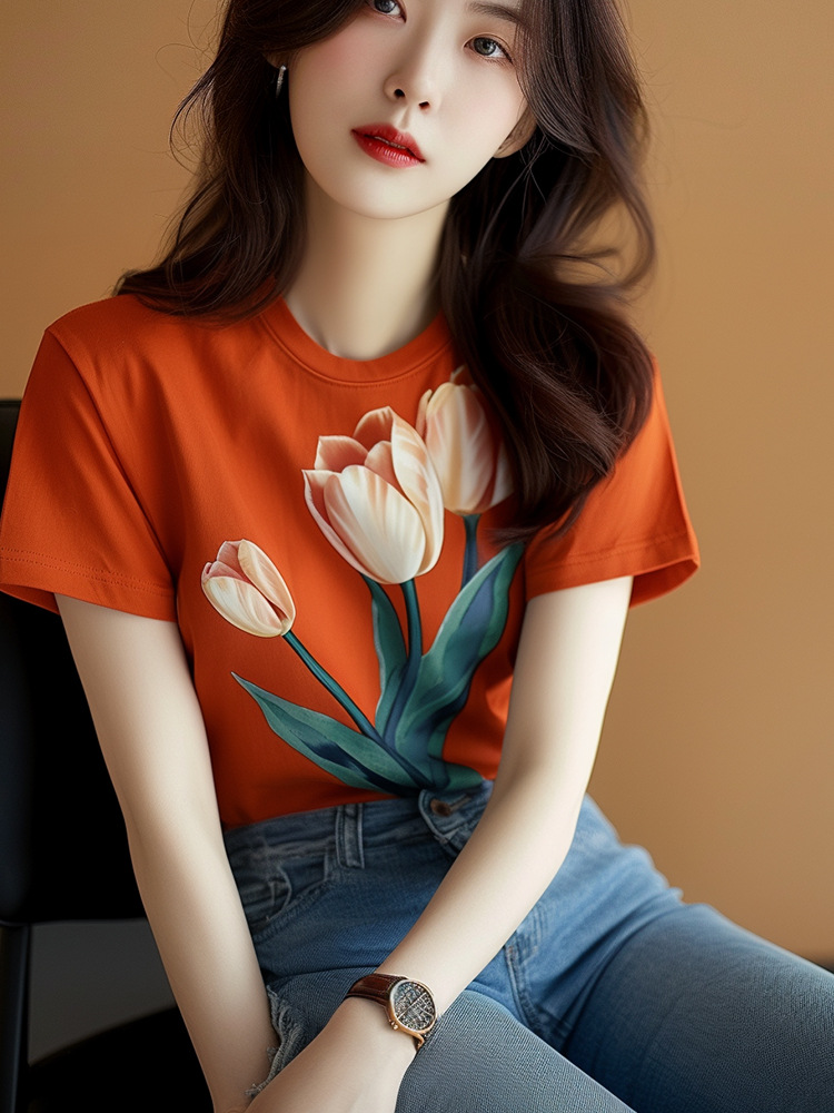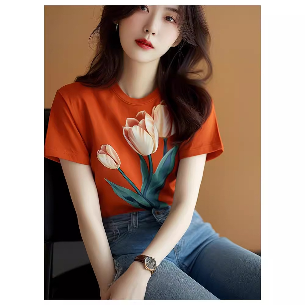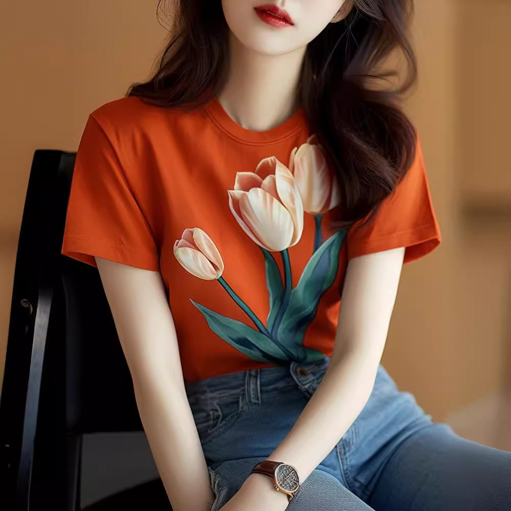 红色郁金香印花短袖t恤女新款高端奢华体恤夏季气质上衣